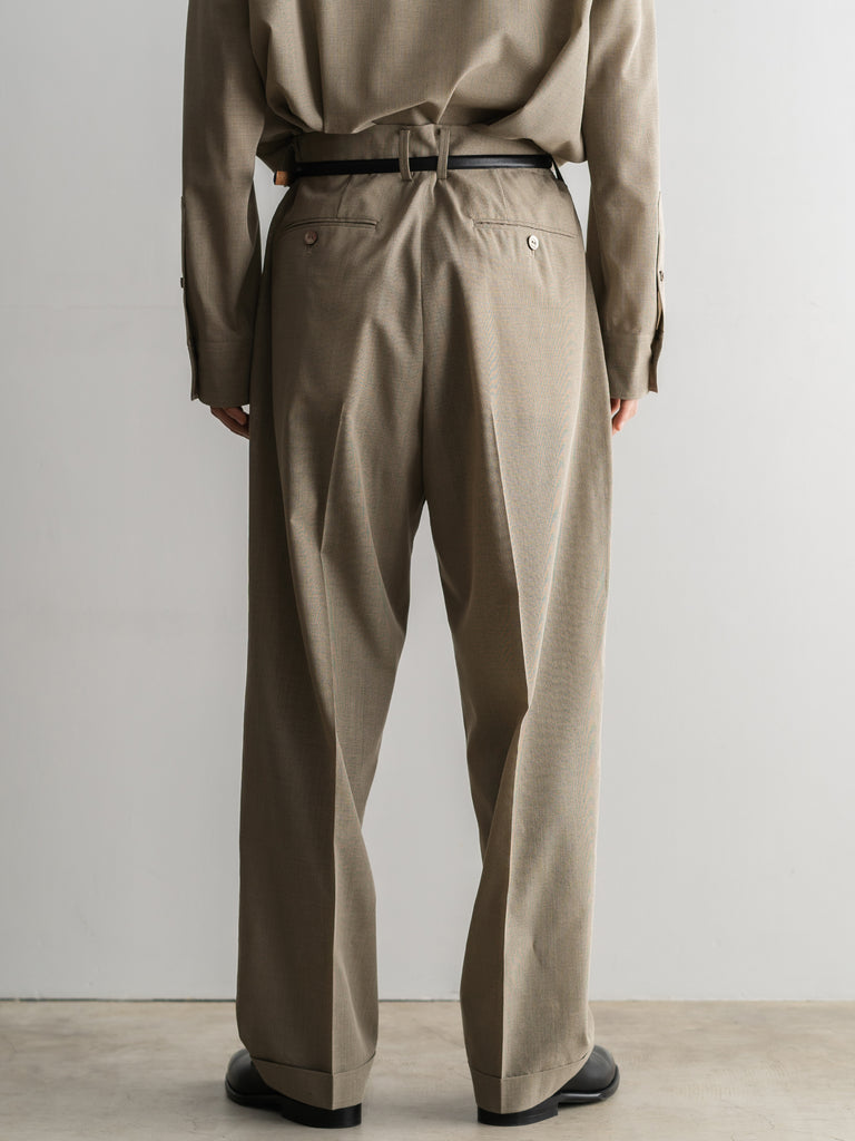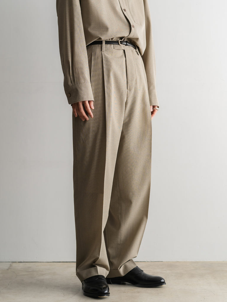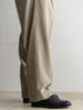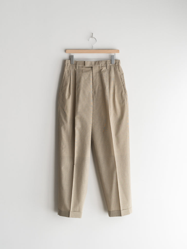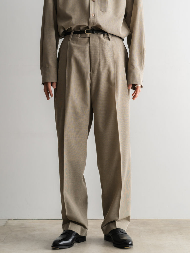 強撚のウールキュプラのクレープ素材を使用した、2タックテーパードトラウザーズ。