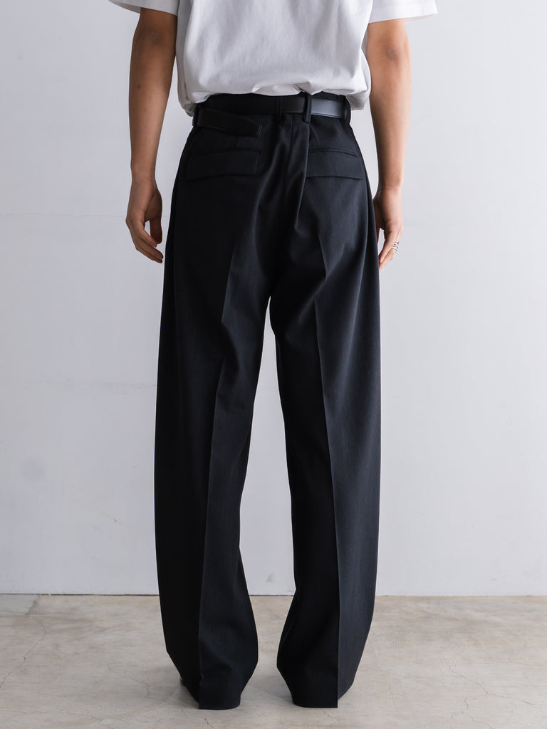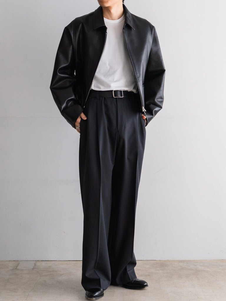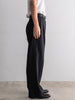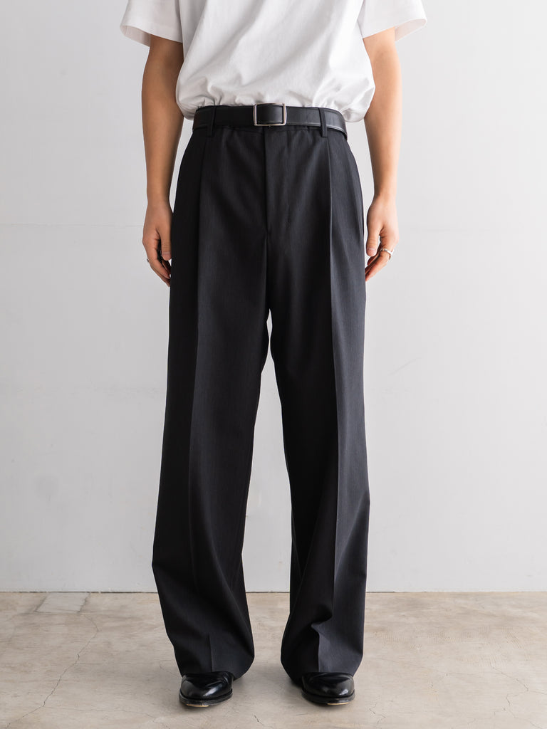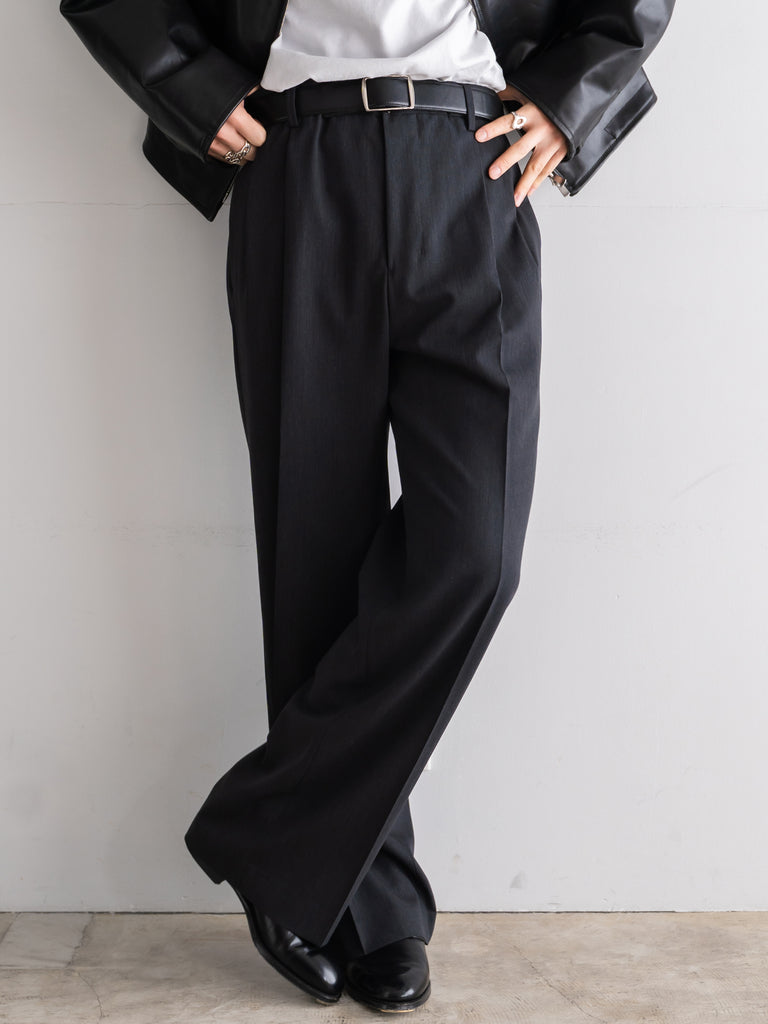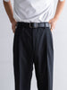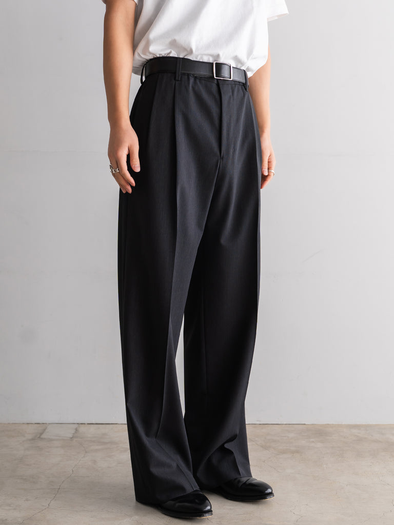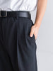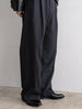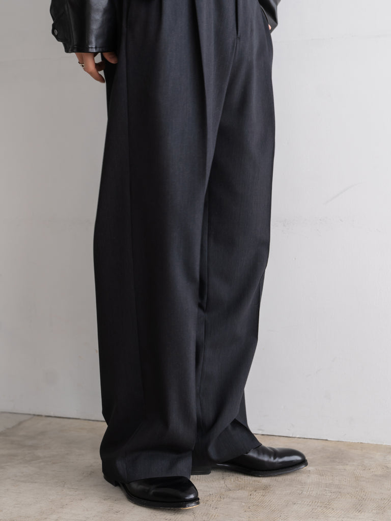 ギャバジン織のウールポリエステル素材を使用した、前裏付きツータックワイドトラウザーズ。