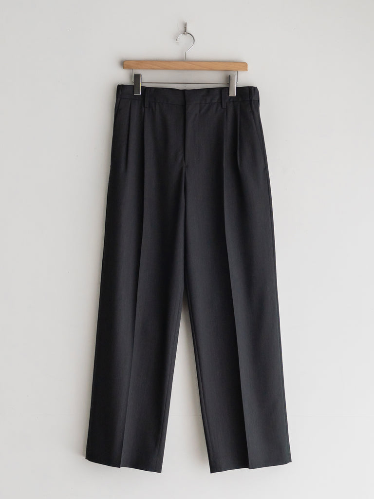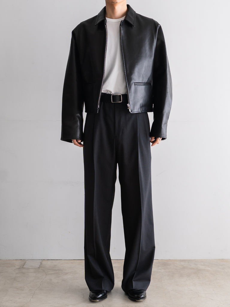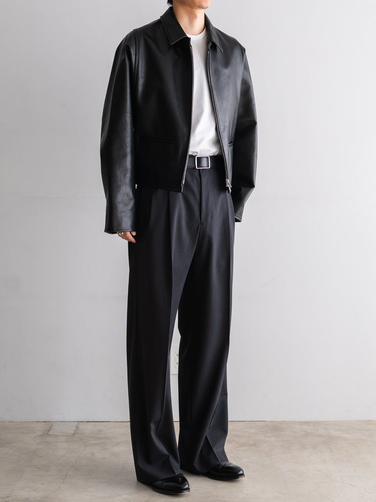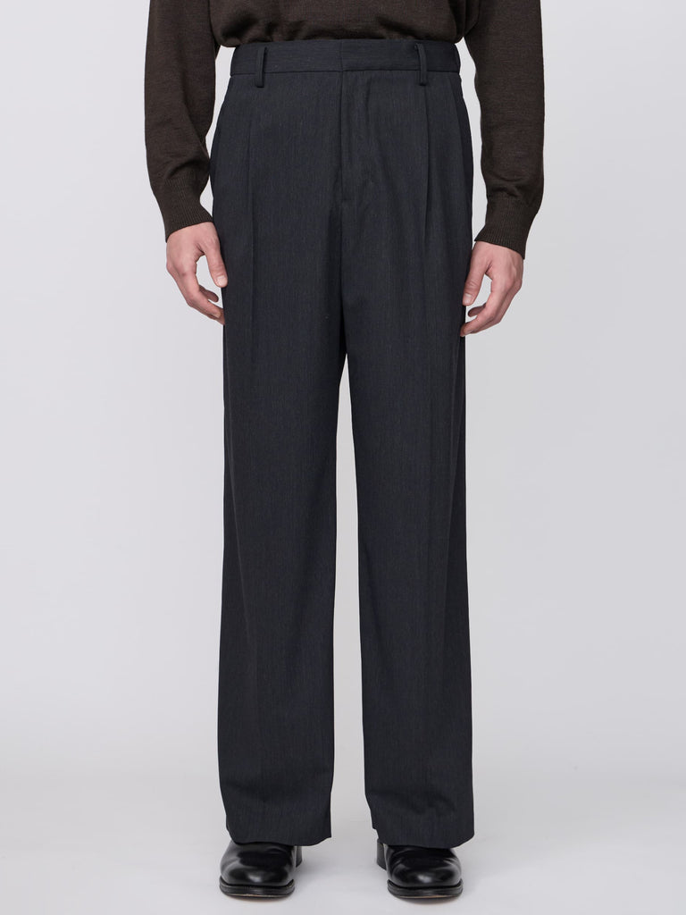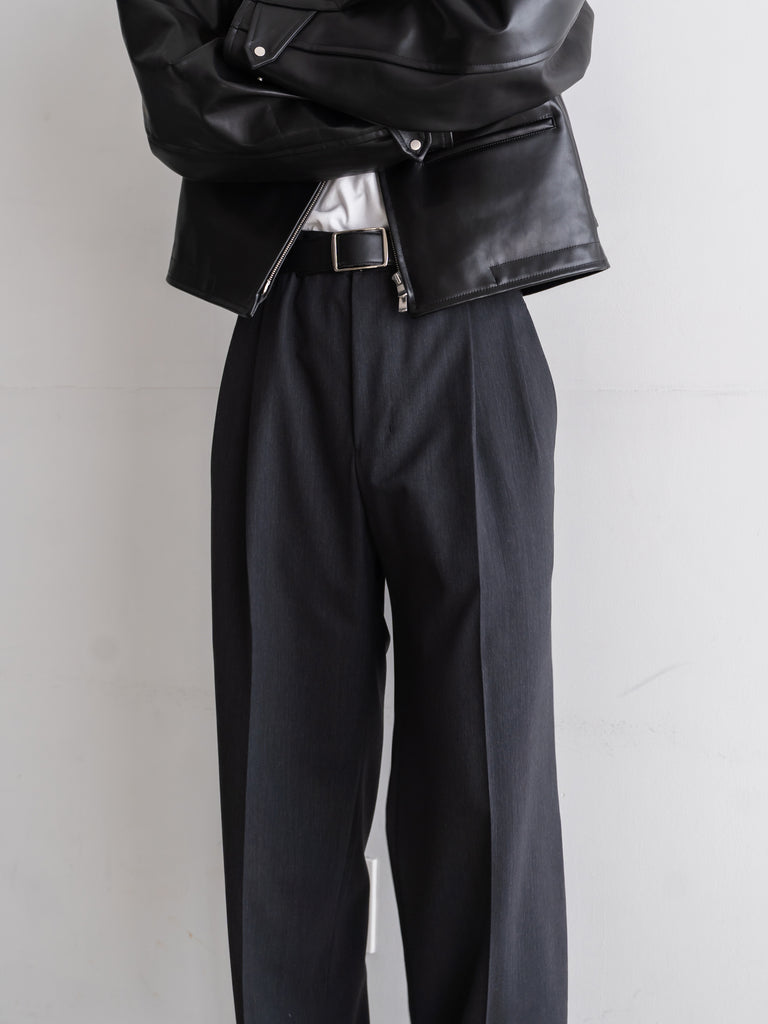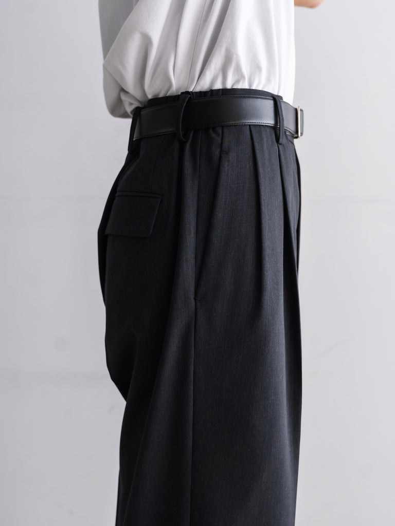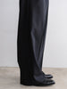 ギャバジン織のウールポリエステル素材を使用した、前裏付きツータックワイドトラウザーズ。