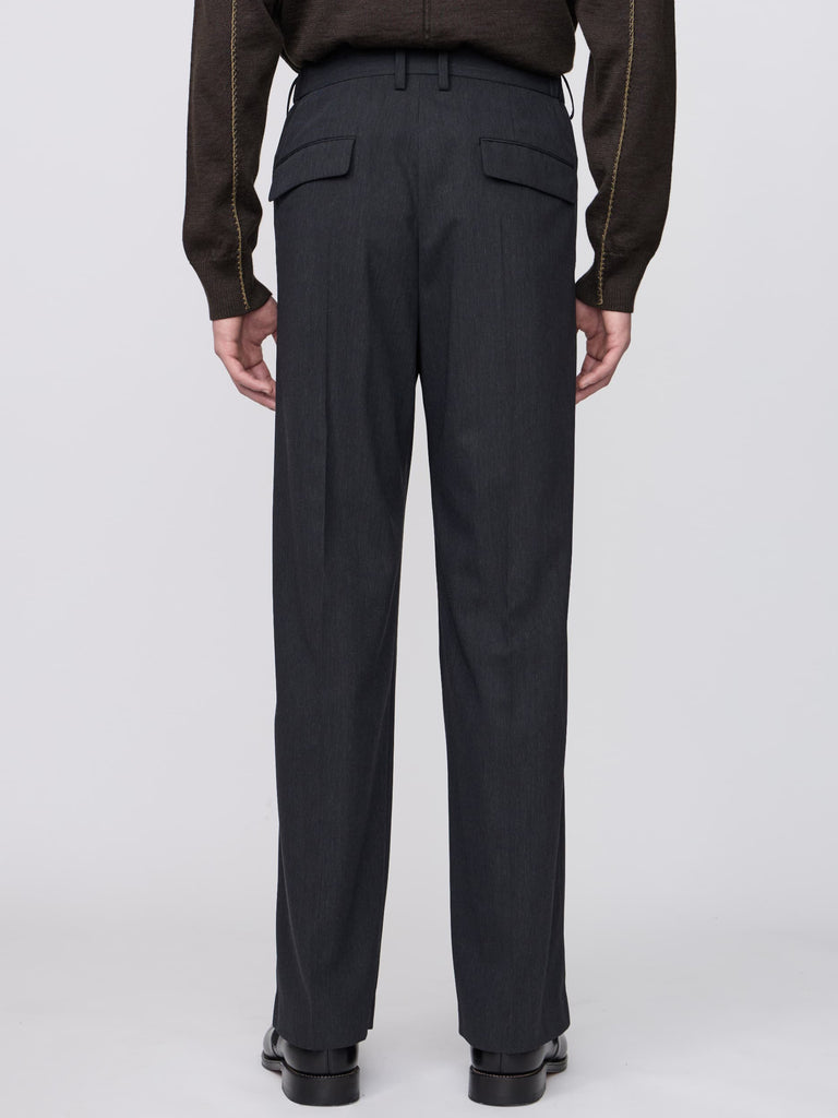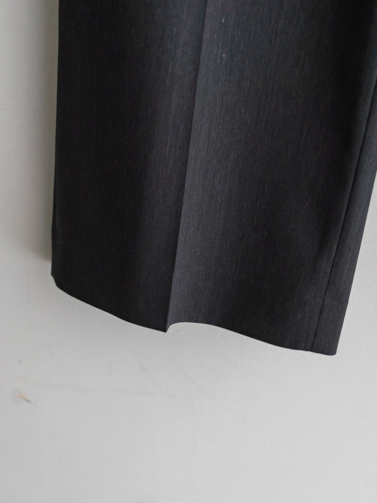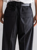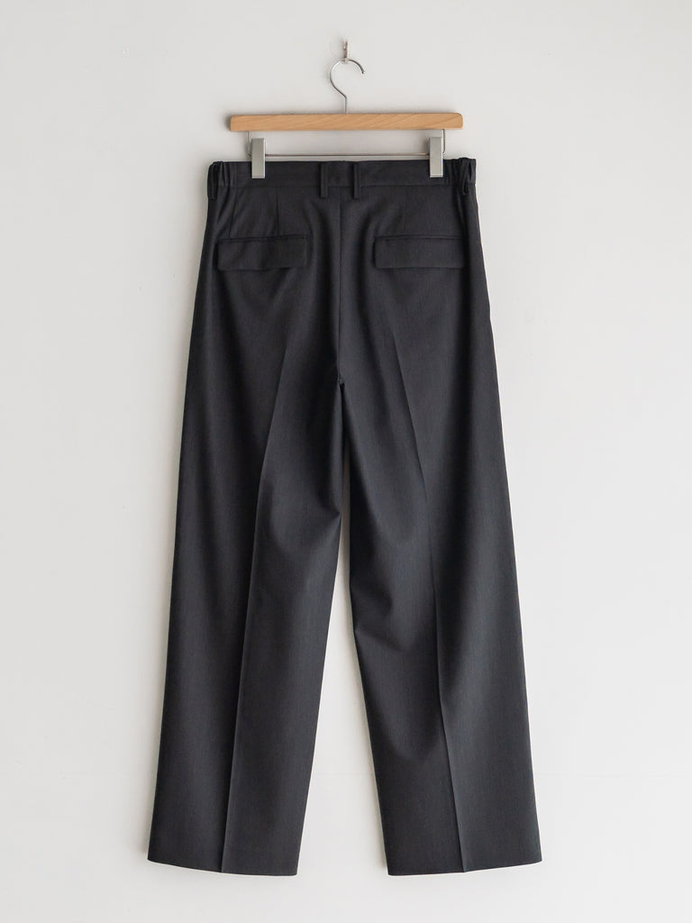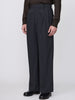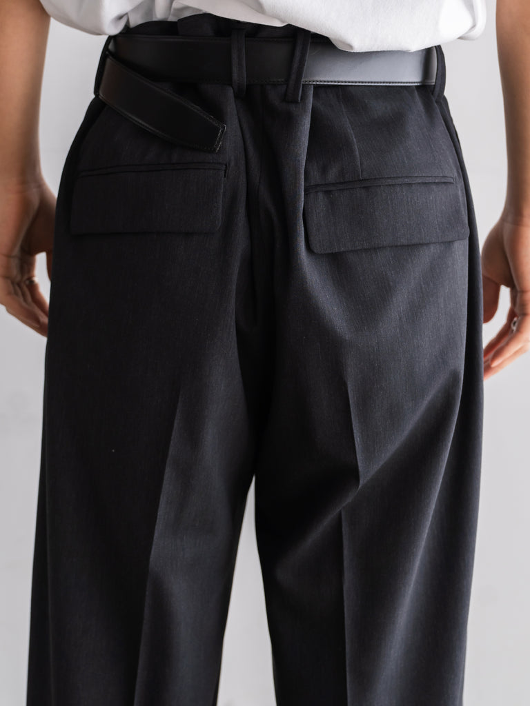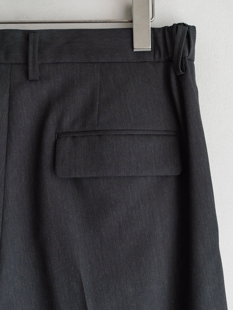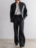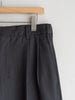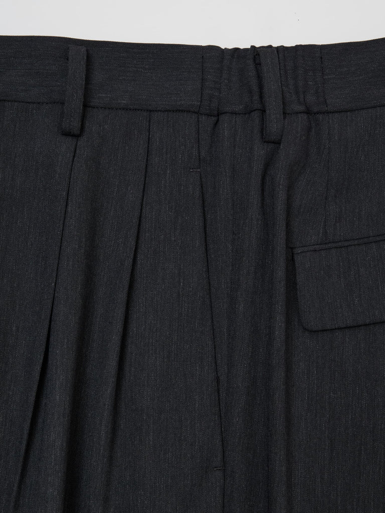 ギャバジン織のウールポリエステル素材を使用した、前裏付きツータックワイドトラウザーズ。