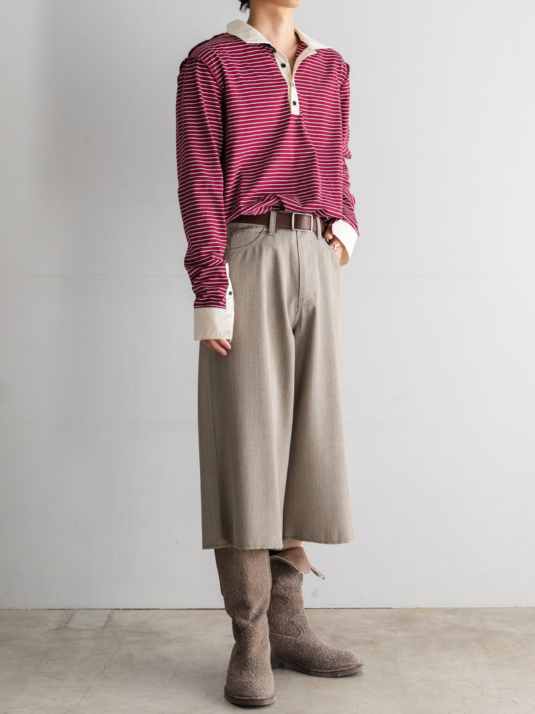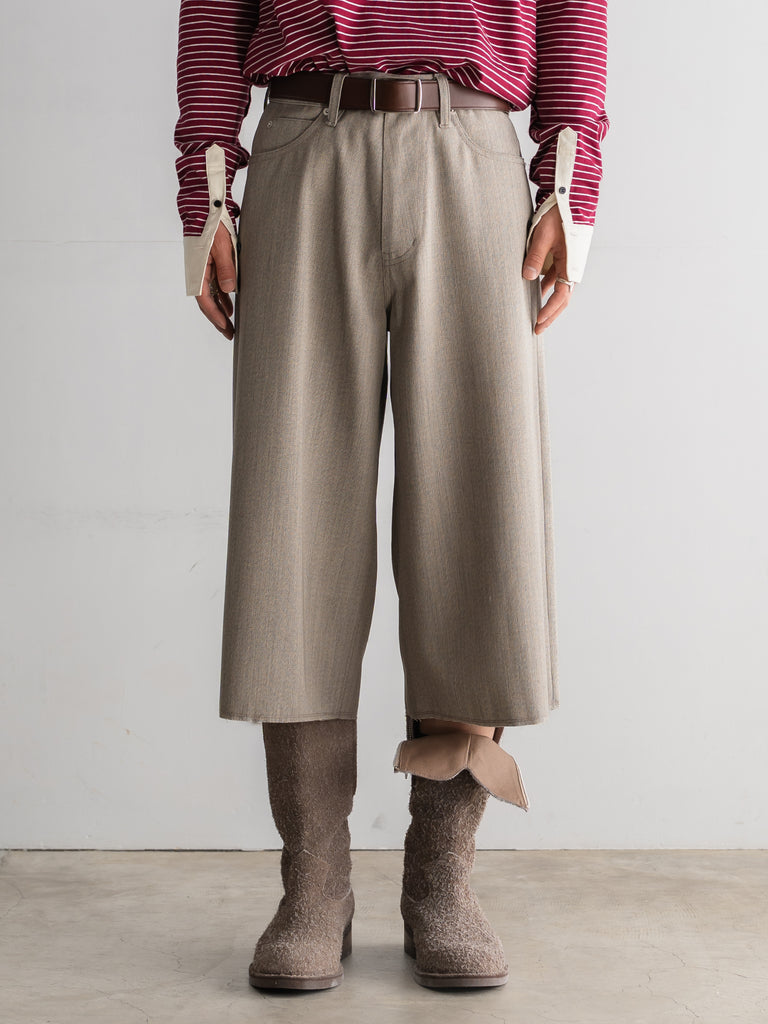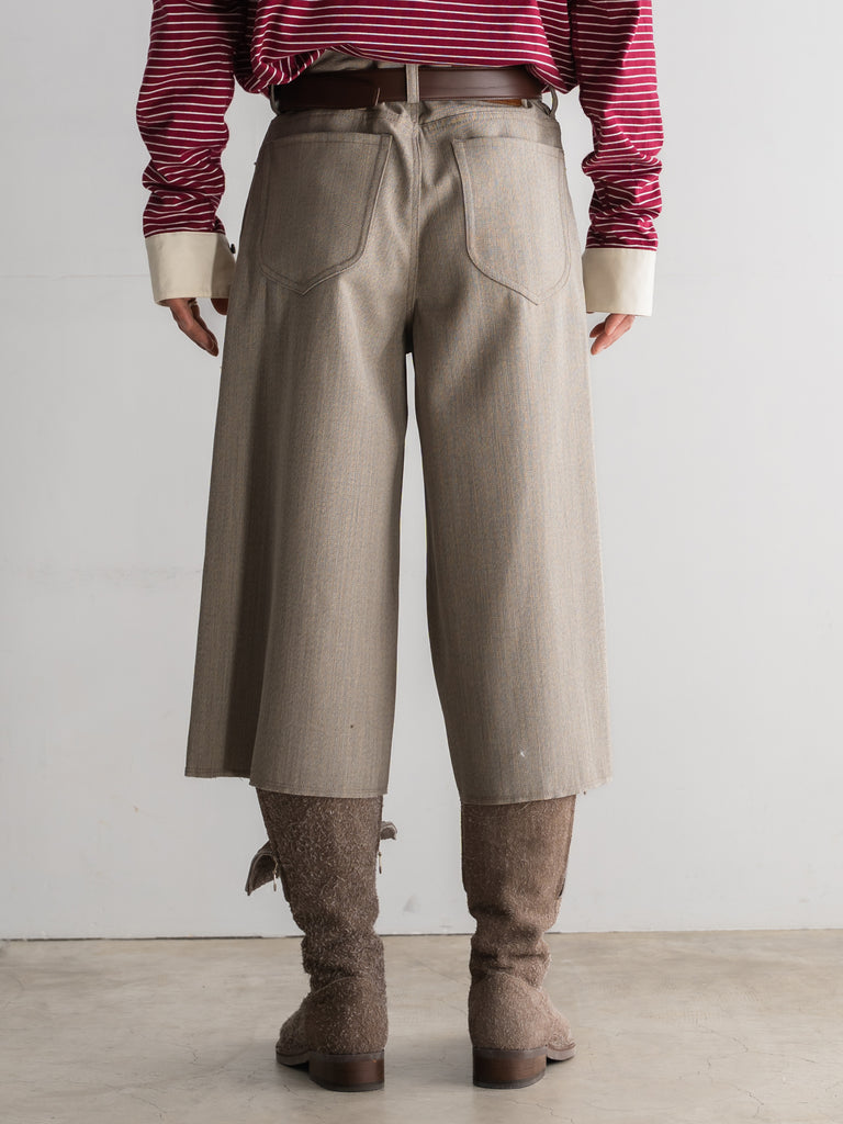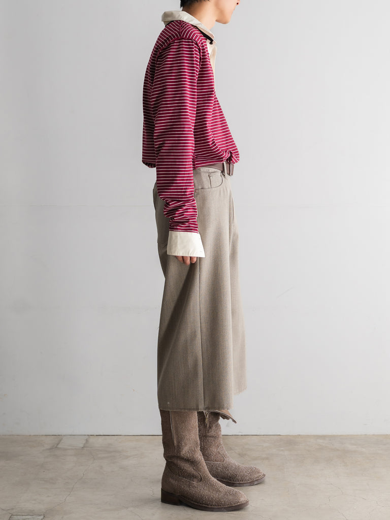 重厚なワークウェアを土台にしながらも、裾はラフな断ち切り仕様に。