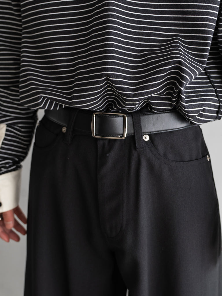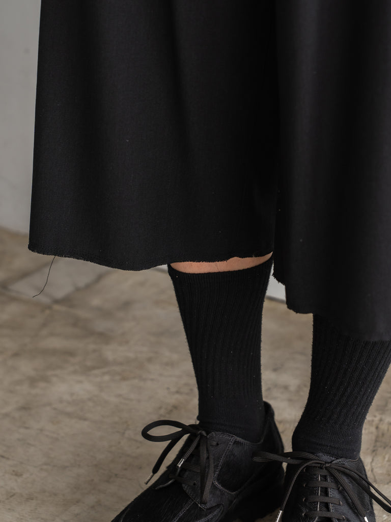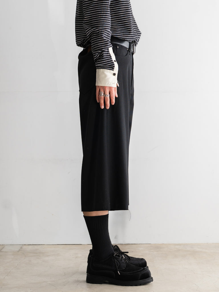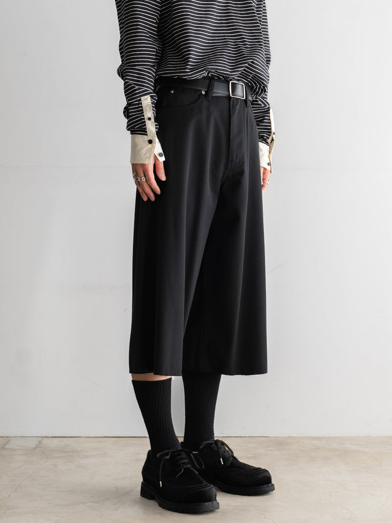 重厚なワークウェアを土台にしながらも、裾はラフな断ち切り仕様に。