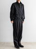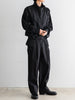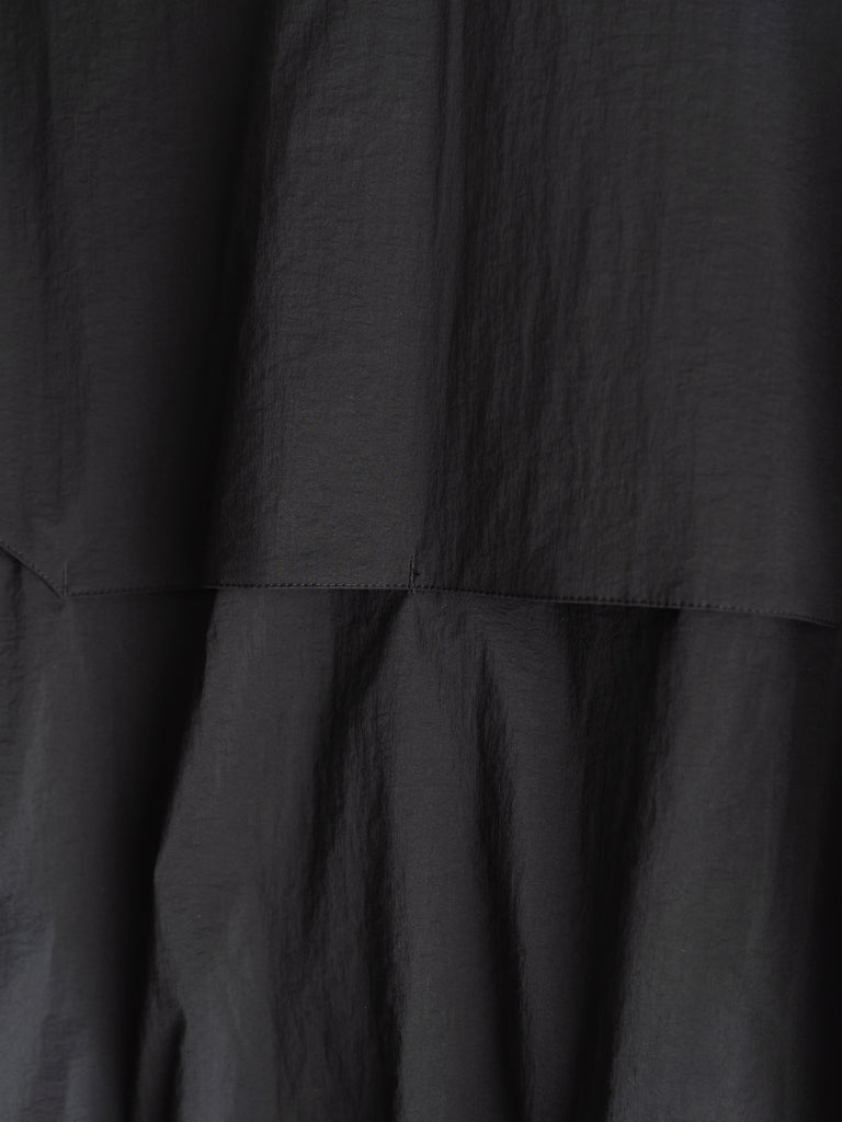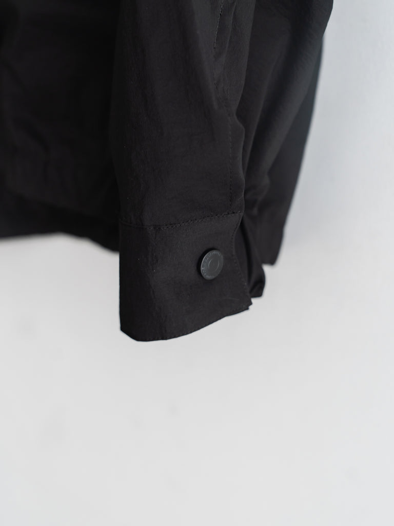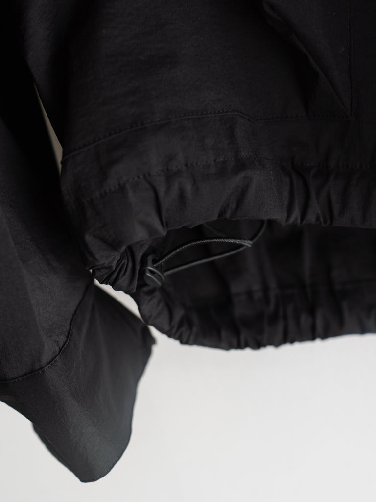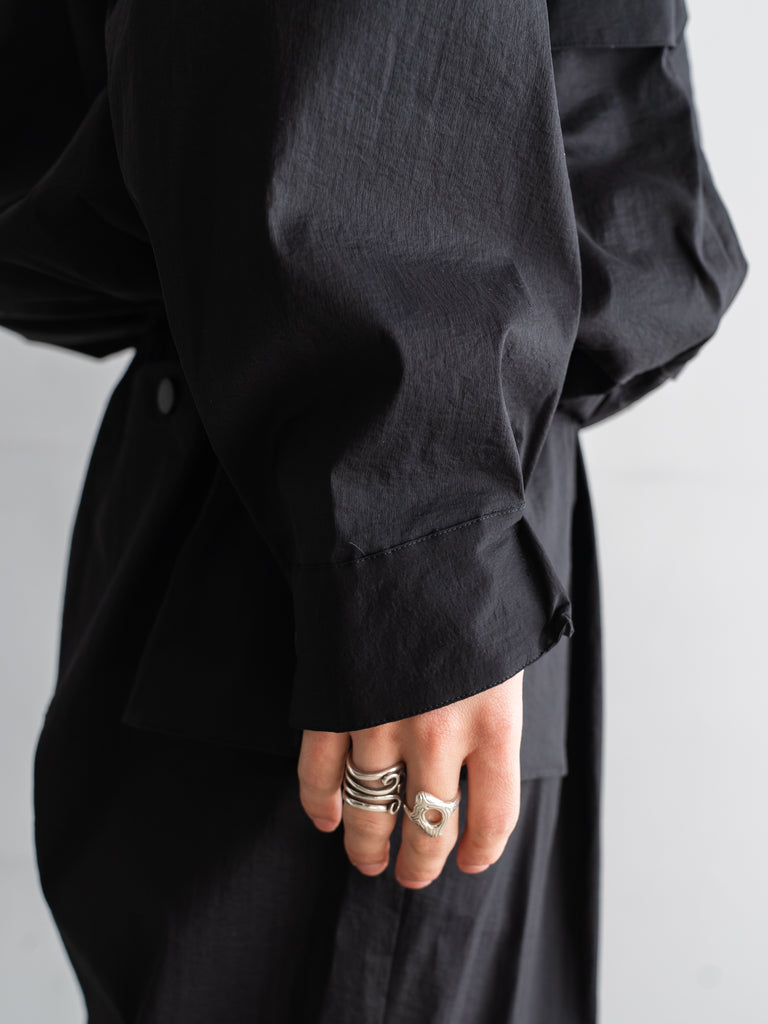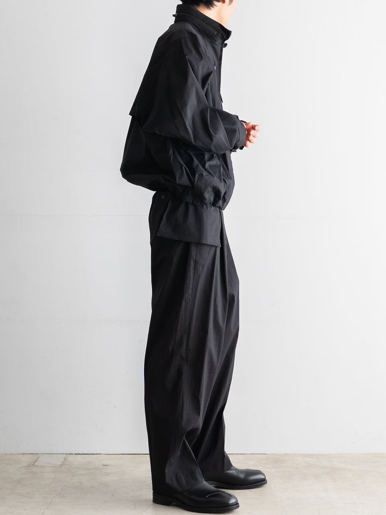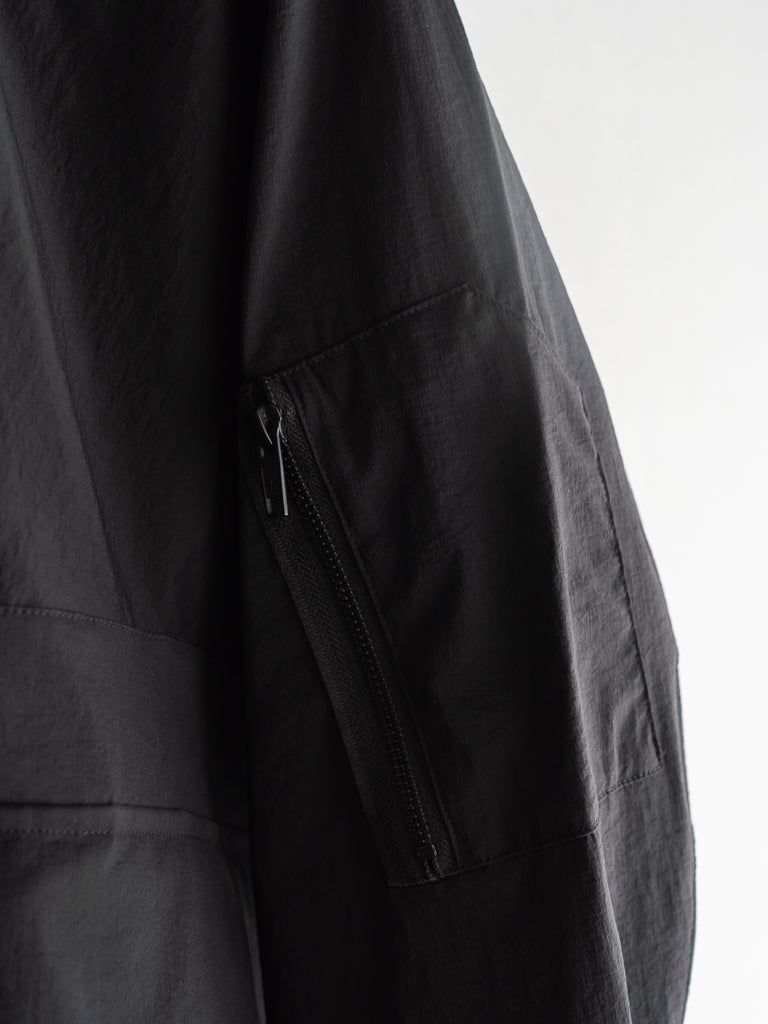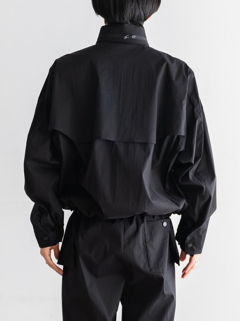 軽量でしなやかさと光沢感があり、撥水性も兼ね備えた素材です。ドロップショルダーと、全体的に丸みを帯びたビッグシルエットが特徴。