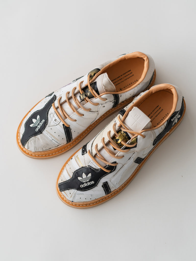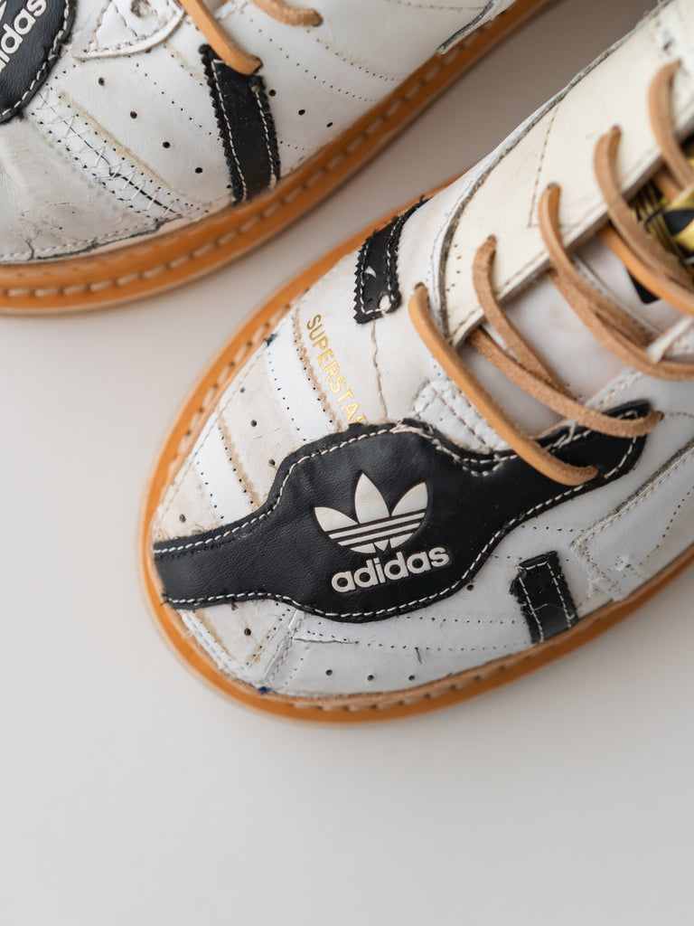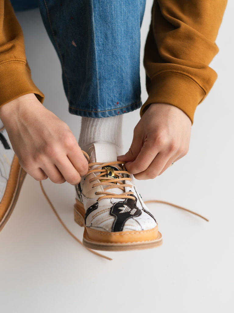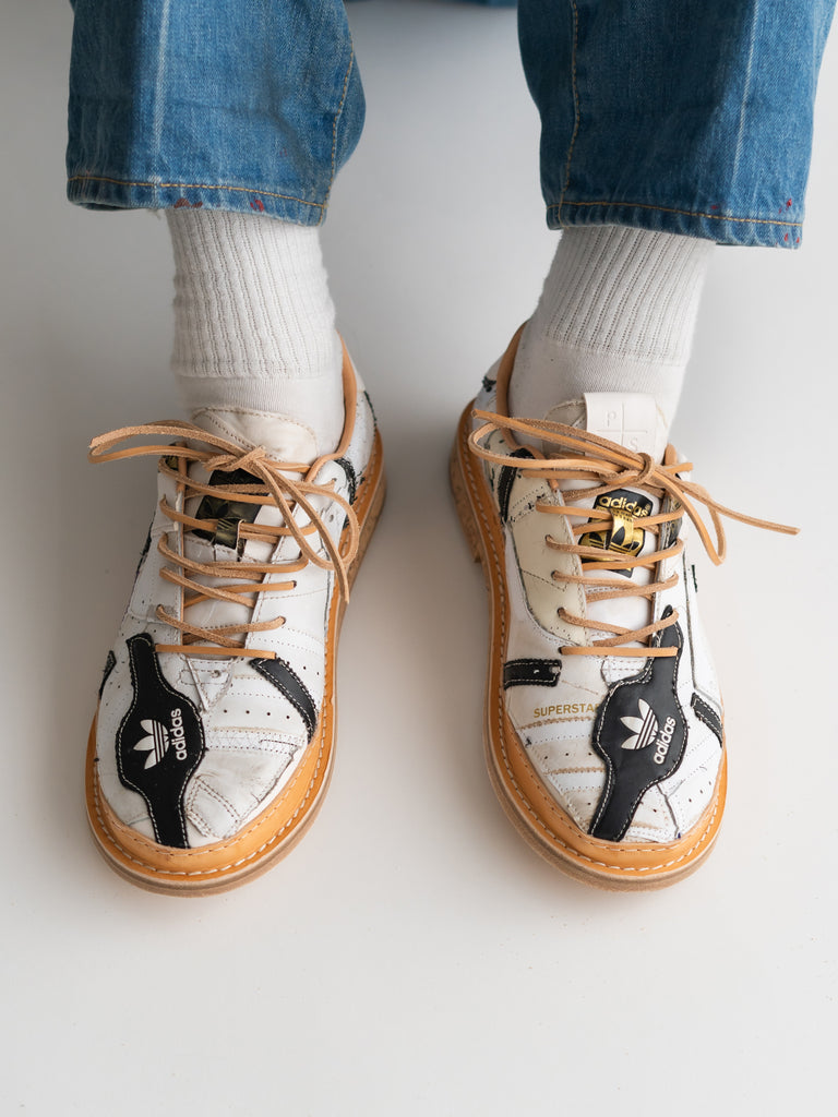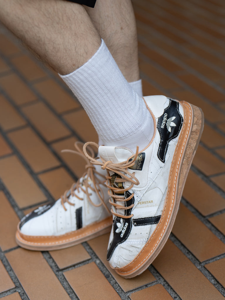 何足ものアディダス・スーパースターのパッチワークで、ウェルトはレザーのストームウェルト、ソールには厚みのあるコルクソールを使用しています。