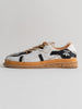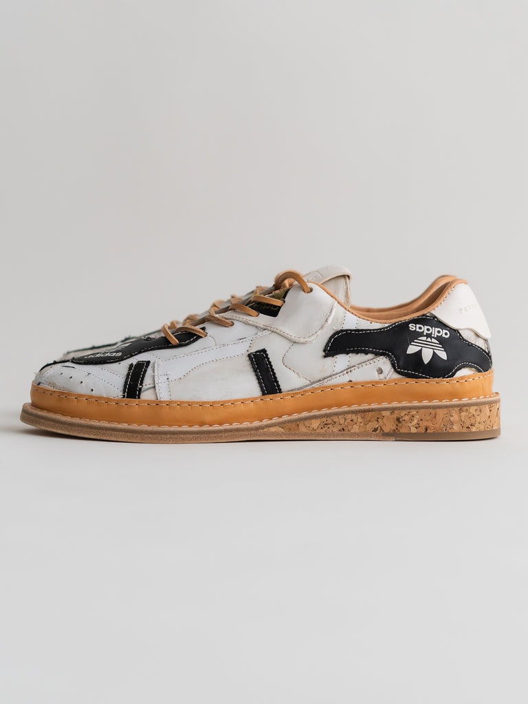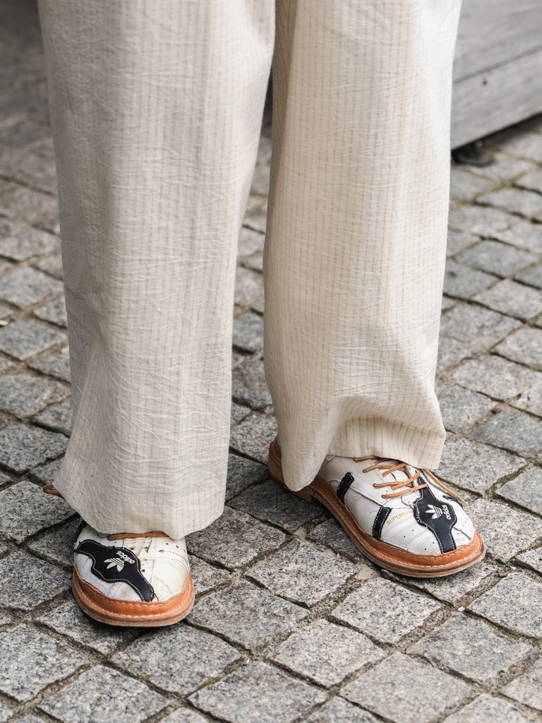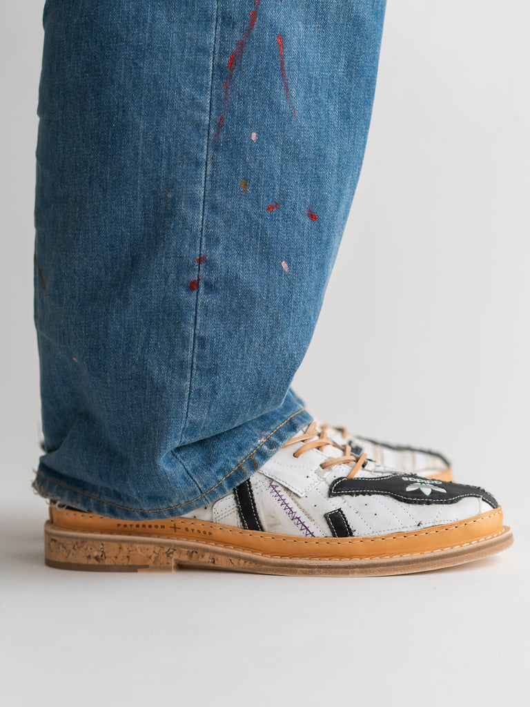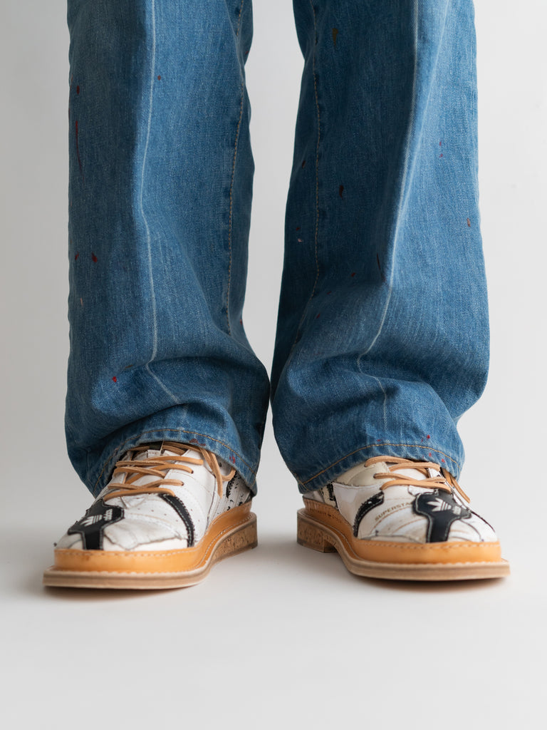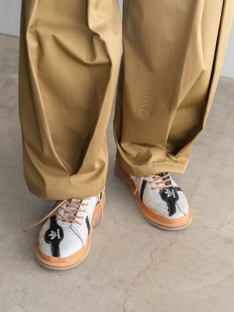 何足ものアディダス・スーパースターのパッチワークで、ウェルトはレザーのストームウェルト、ソールには厚みのあるコルクソールを使用しています。
