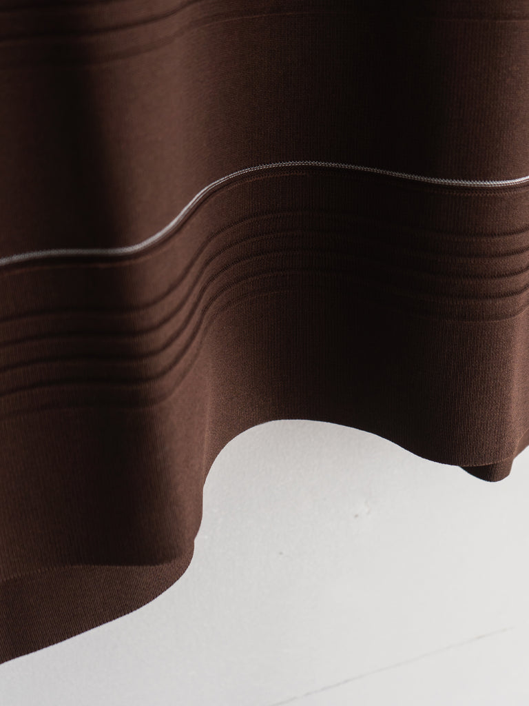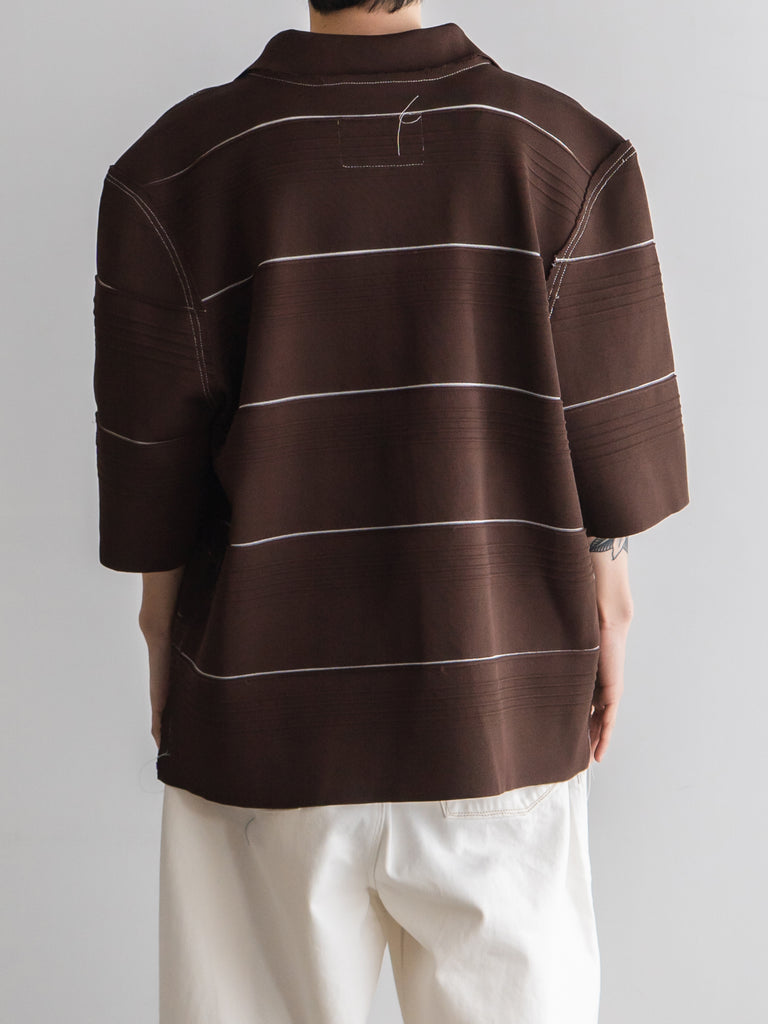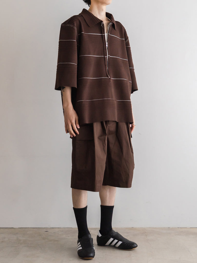 迫力と厚みのあるリブ編みニットを、違和感のあるユニークなバルーン状のアウトラインで構築している、CAMIEL FORTGENSらしい12Gのオーバーサイズジップニットポロ。