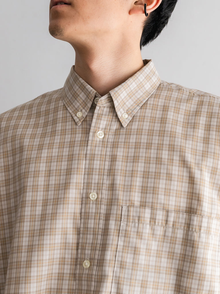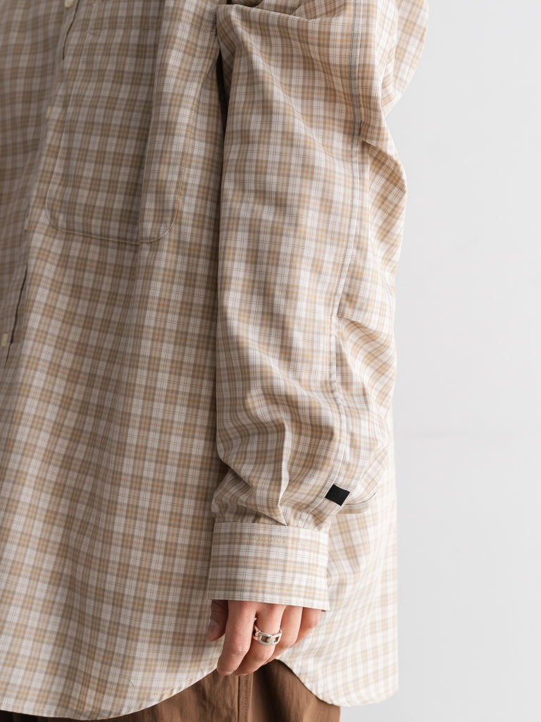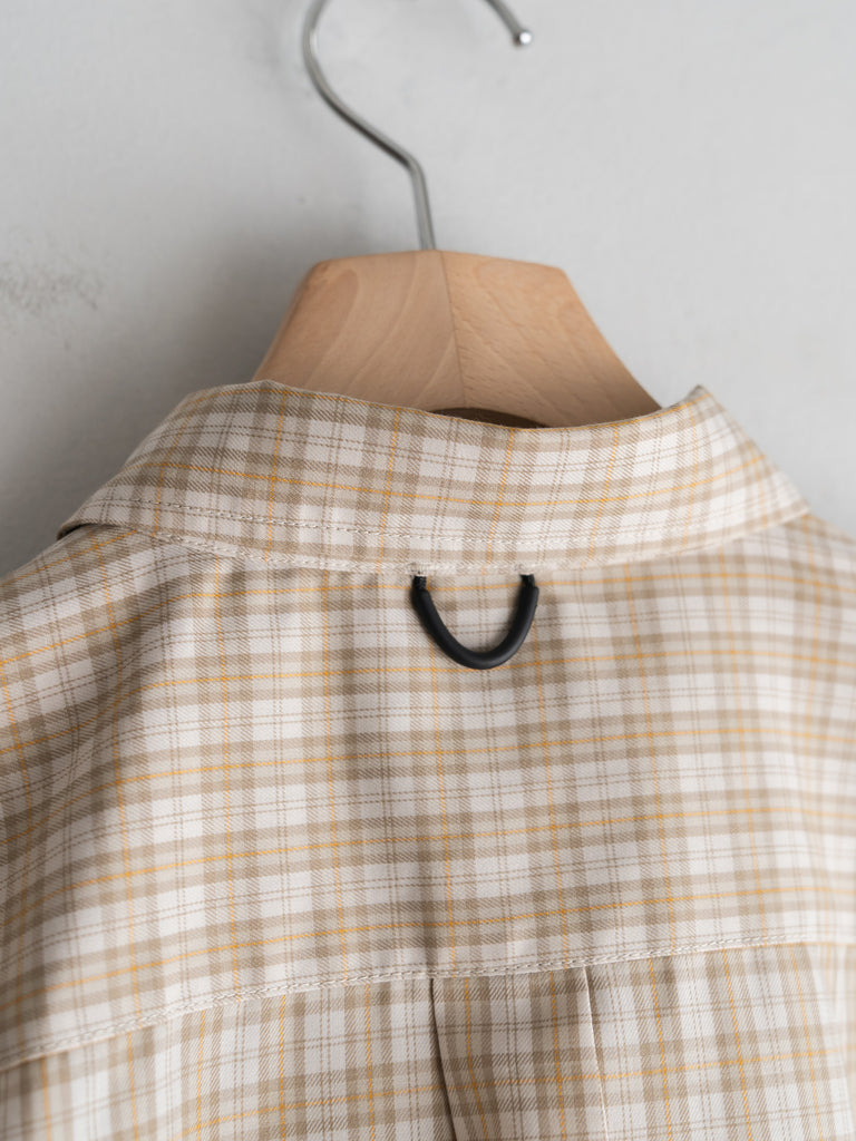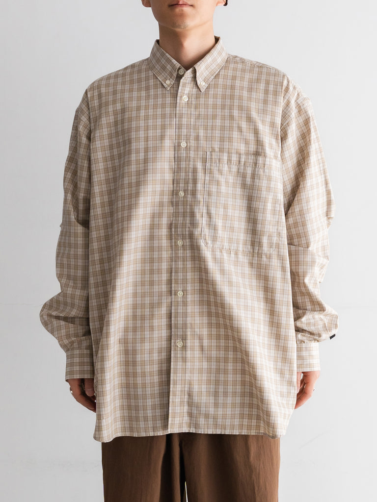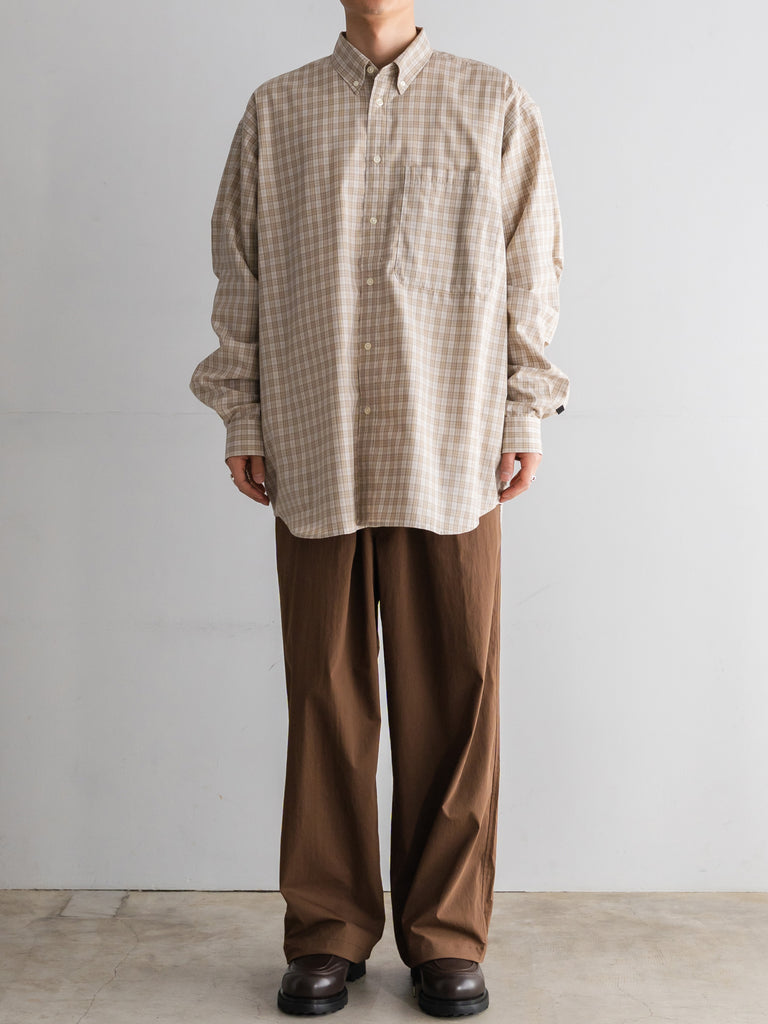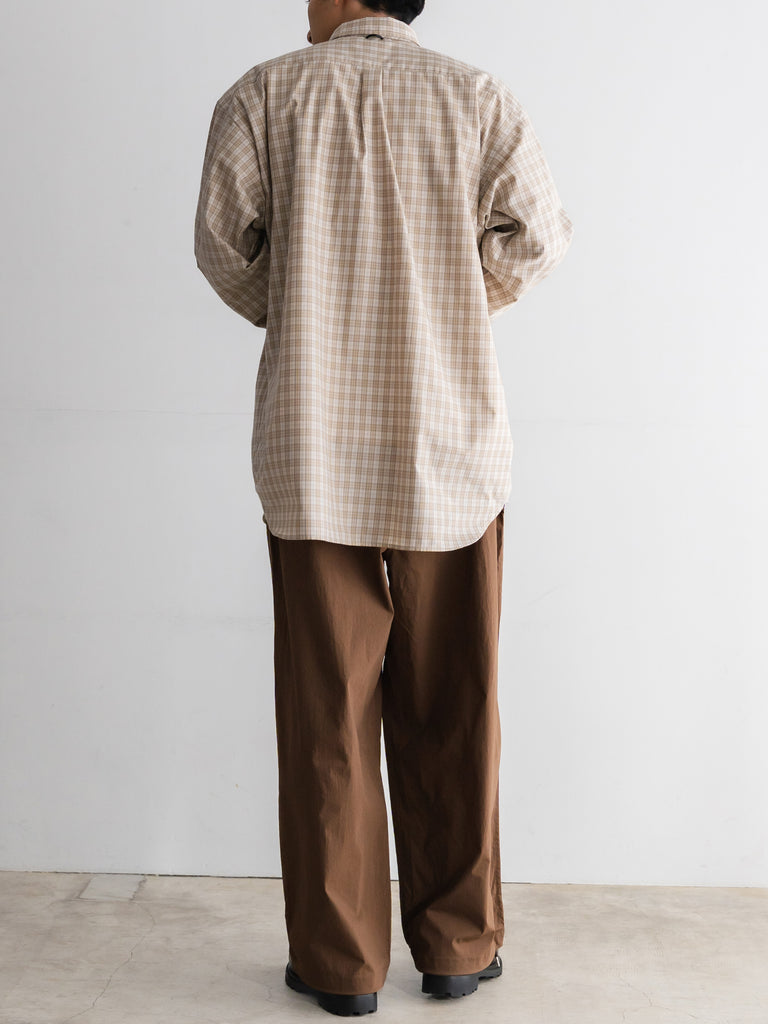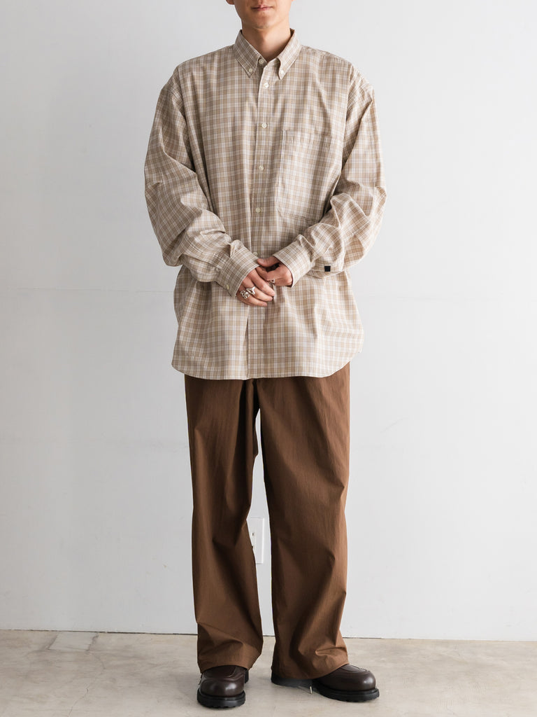 オーバーサイズにデザインしたボタンダウンシャツ。 大きくデザインした胸のパッチポケットの中に小さなモバイルポケットを配し、シンプルながらも使いやすいディテールを加えております。 ミリタリーウエアの特徴である袖のアクションプリーツを加え、フィッシングの際キャスティングしやすいディテールを追加。 ※サングラスホルダー付き ポリエステルスパン糸の特徴を生かした綿タッチなツイル素材。 生地段階で柔軟加工しており、合繊でありながら柔らかくしなやかな風合い仕上げ。