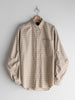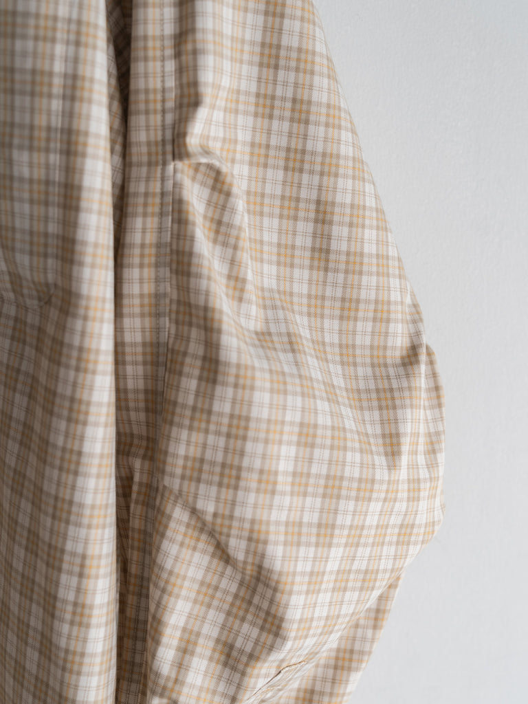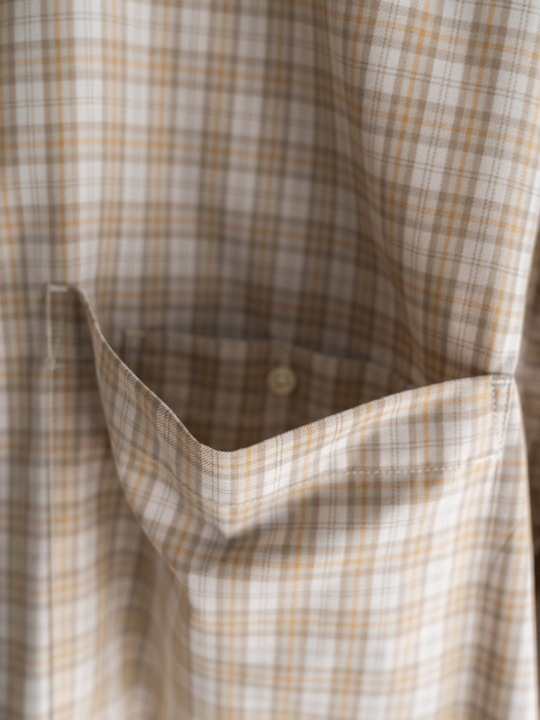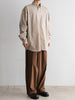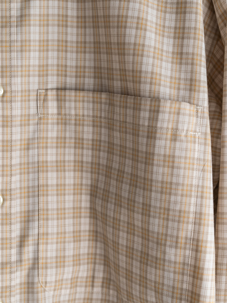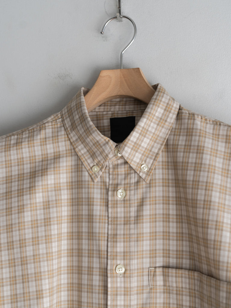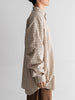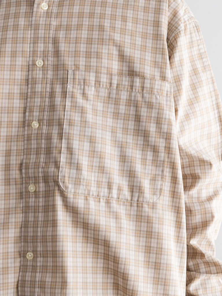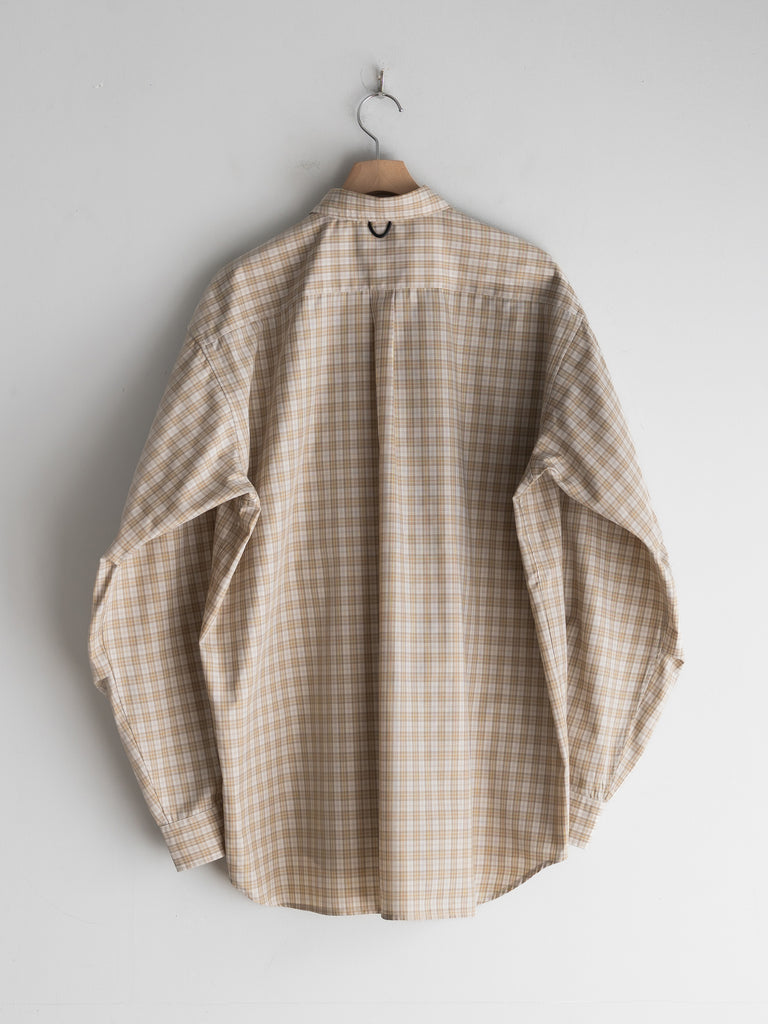 オーバーサイズにデザインしたボタンダウンシャツ。 大きくデザインした胸のパッチポケットの中に小さなモバイルポケットを配し、シンプルながらも使いやすいディテールを加えております。 ミリタリーウエアの特徴である袖のアクションプリーツを加え、フィッシングの際キャスティングしやすいディテールを追加。 ※サングラスホルダー付き ポリエステルスパン糸の特徴を生かした綿タッチなツイル素材。 生地段階で柔軟加工しており、合繊でありながら柔らかくしなやかな風合い仕上げ。