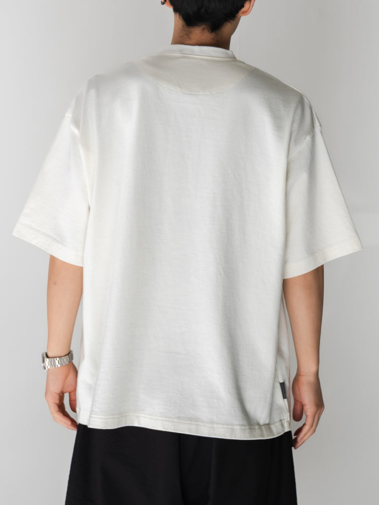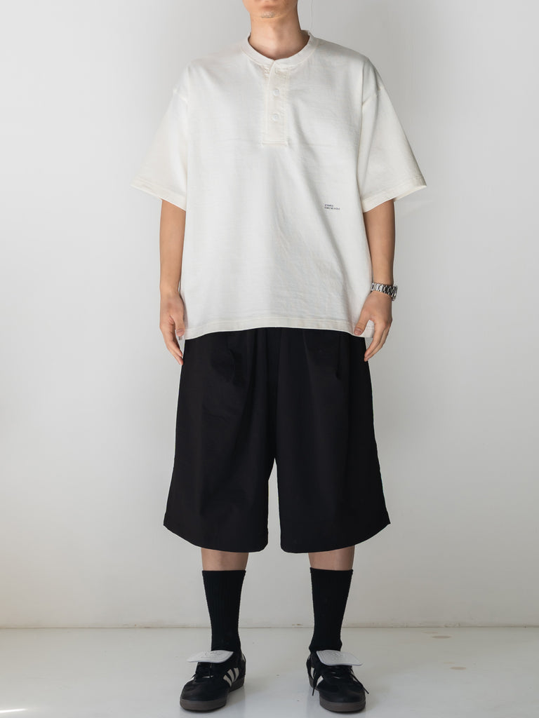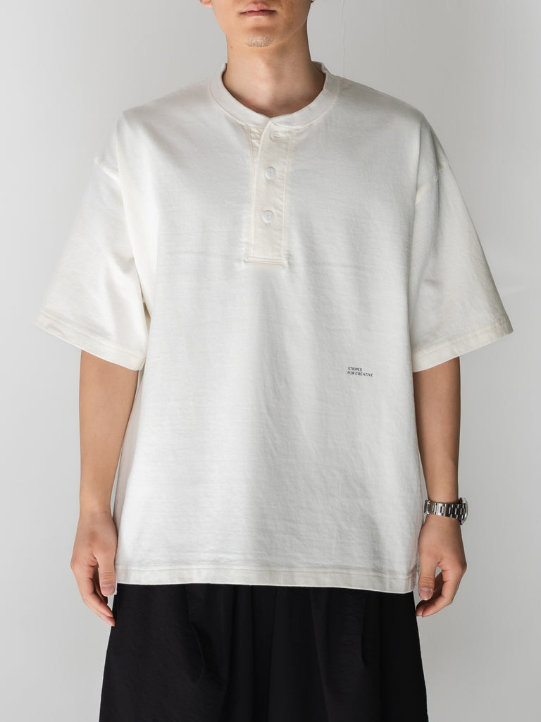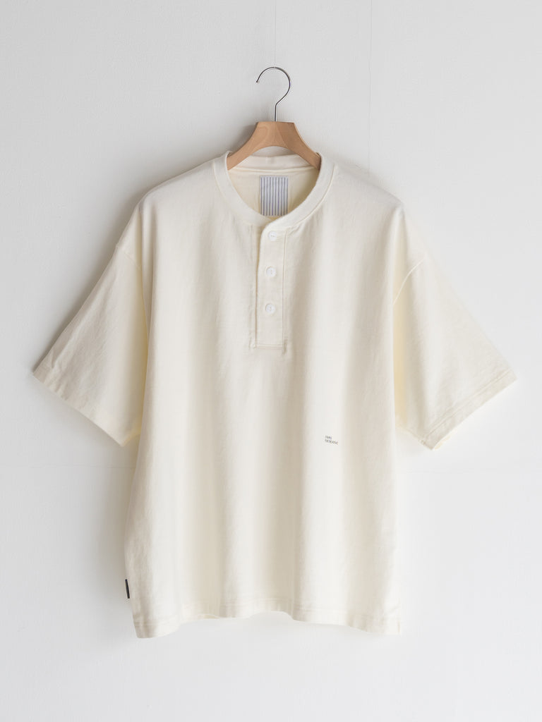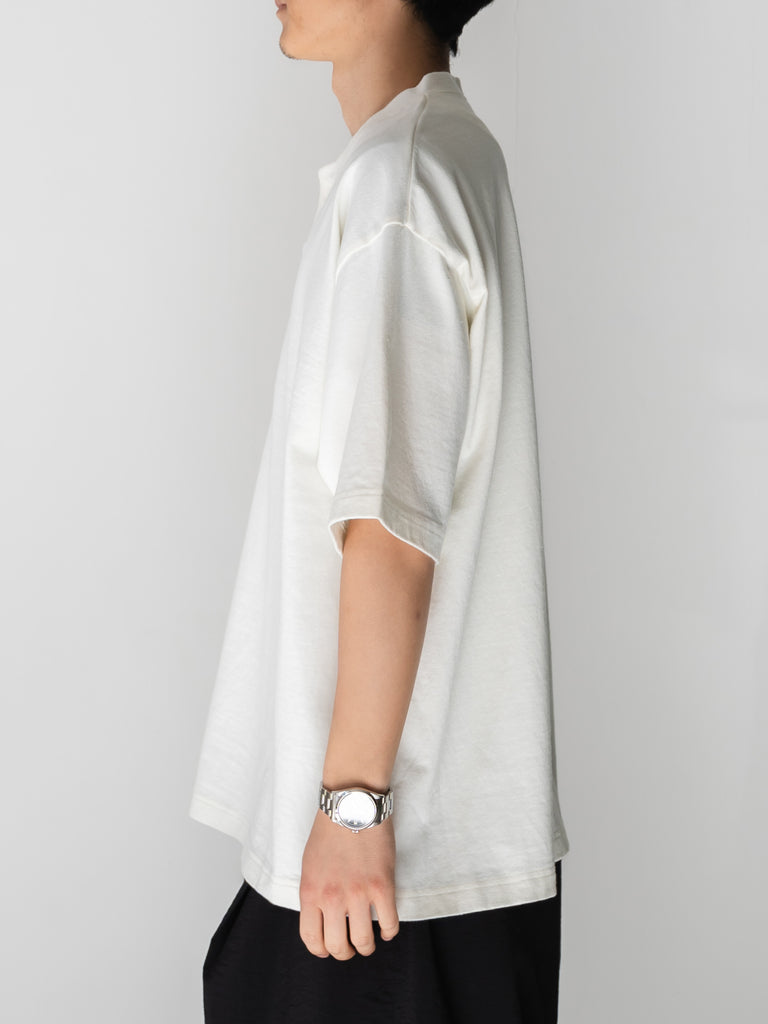 ボックスシルエットの BASIC TEE の首回りをアレンジしたヘンリーネック TEE。