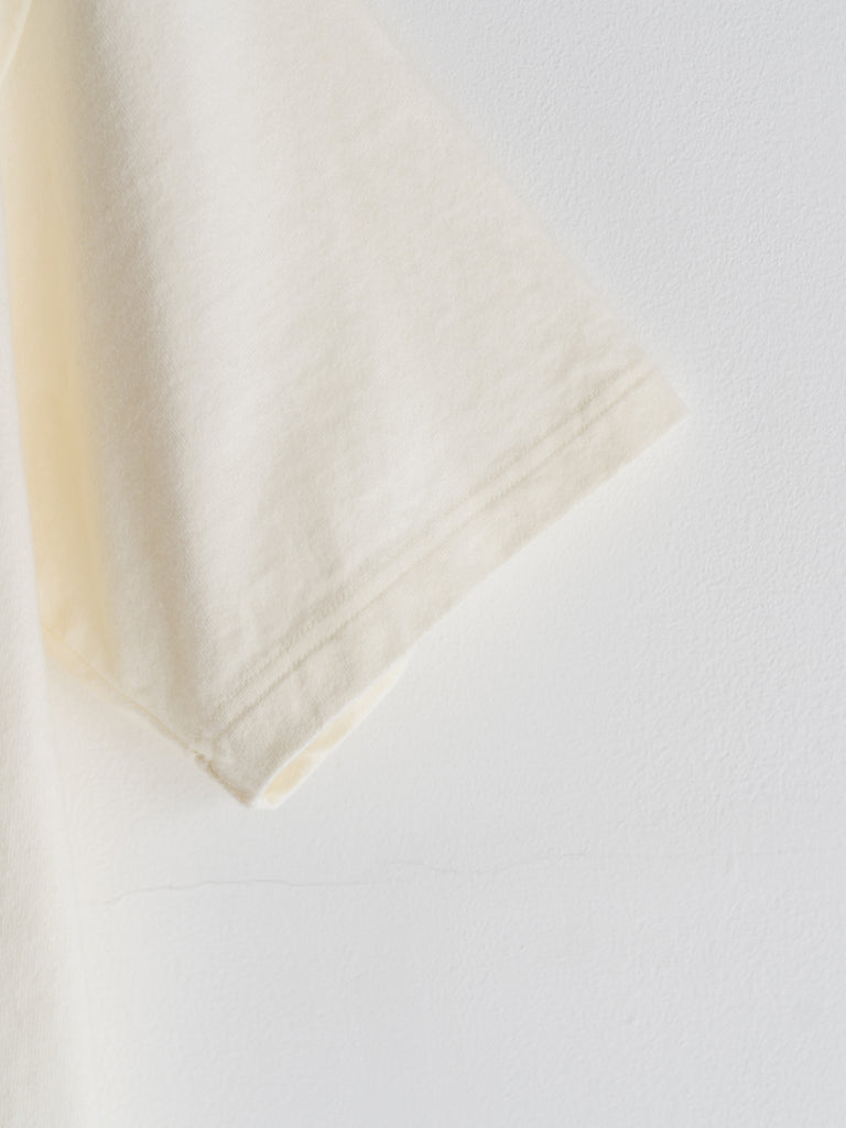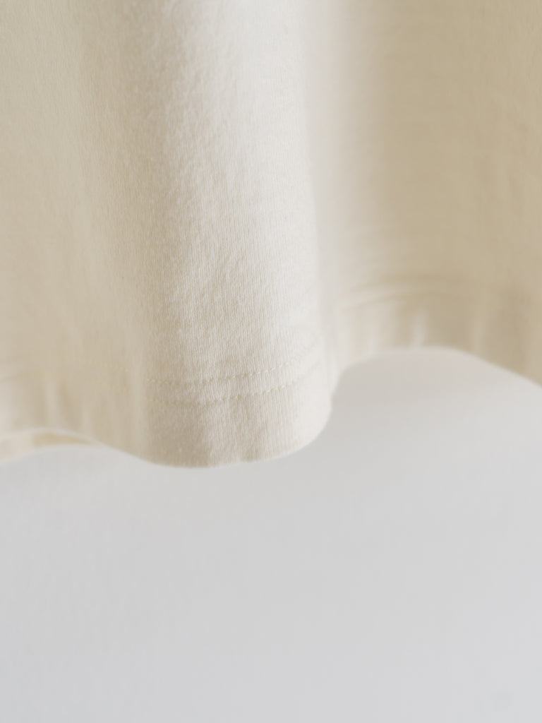 使用素材は国産の 20/2 の太番手の糸を限界の 16 ゲージまで度詰めで編んだ、しっかりした肉厚の天竺素材です。