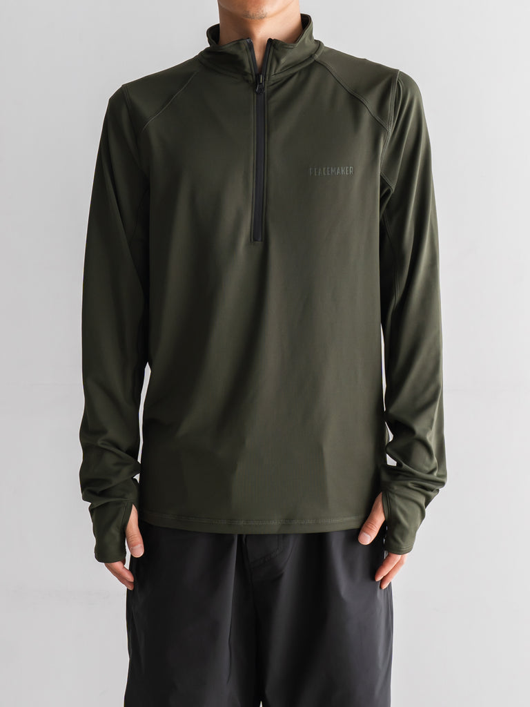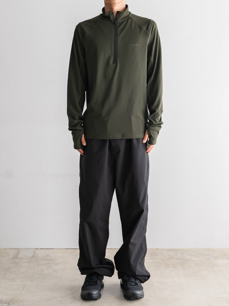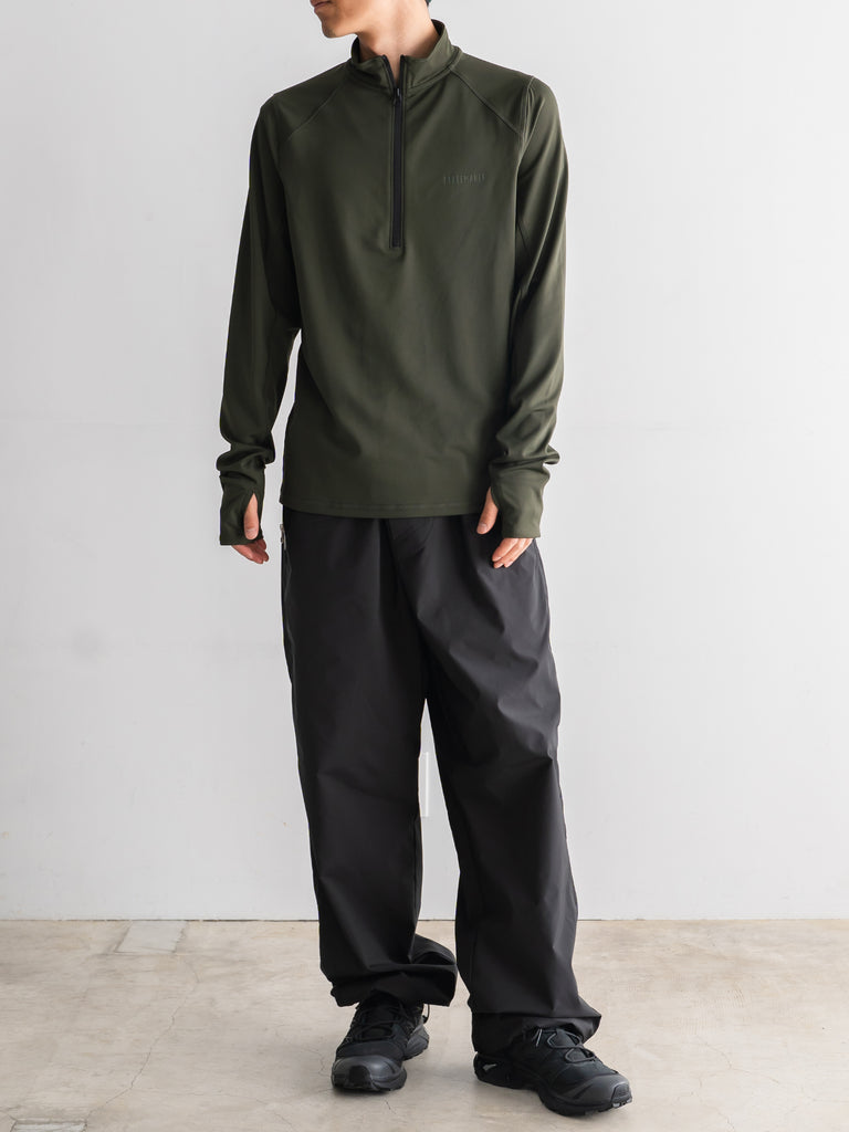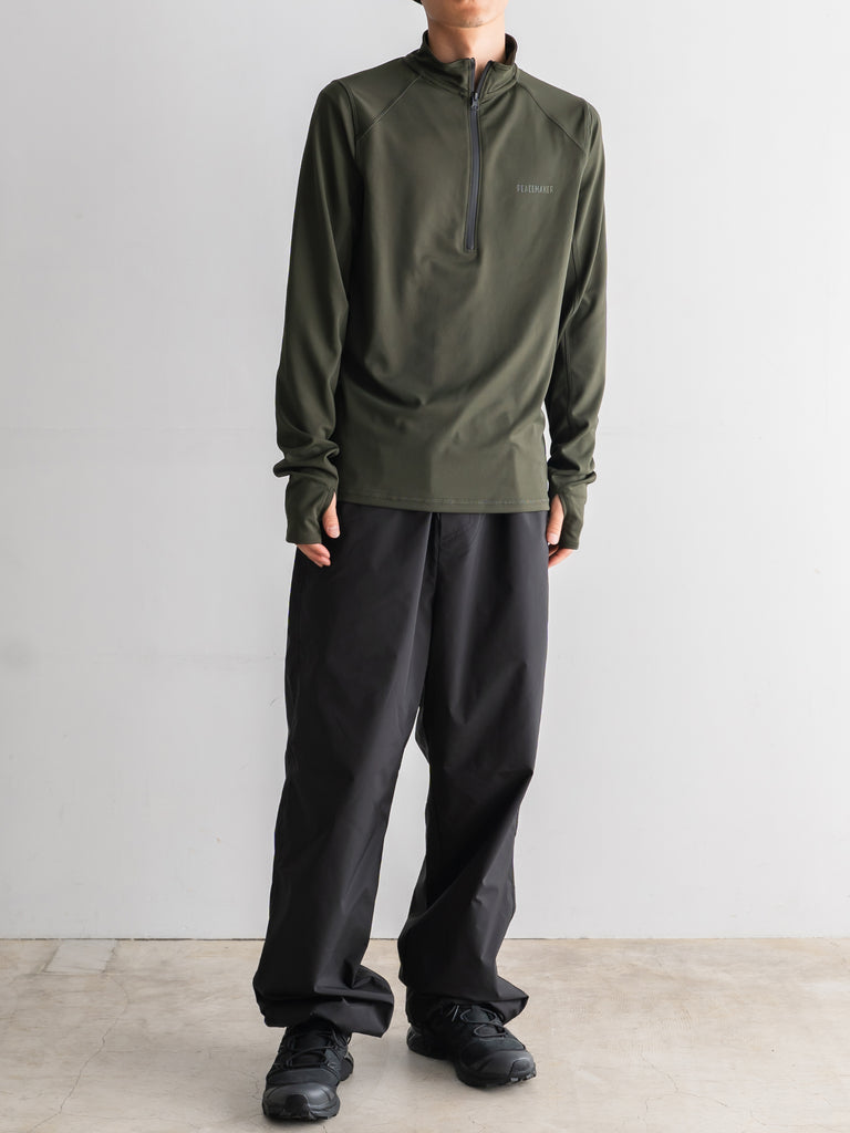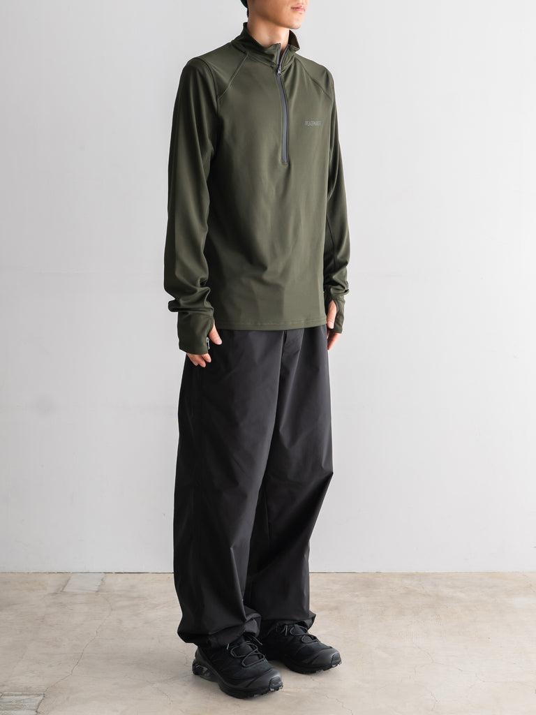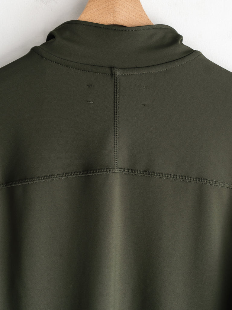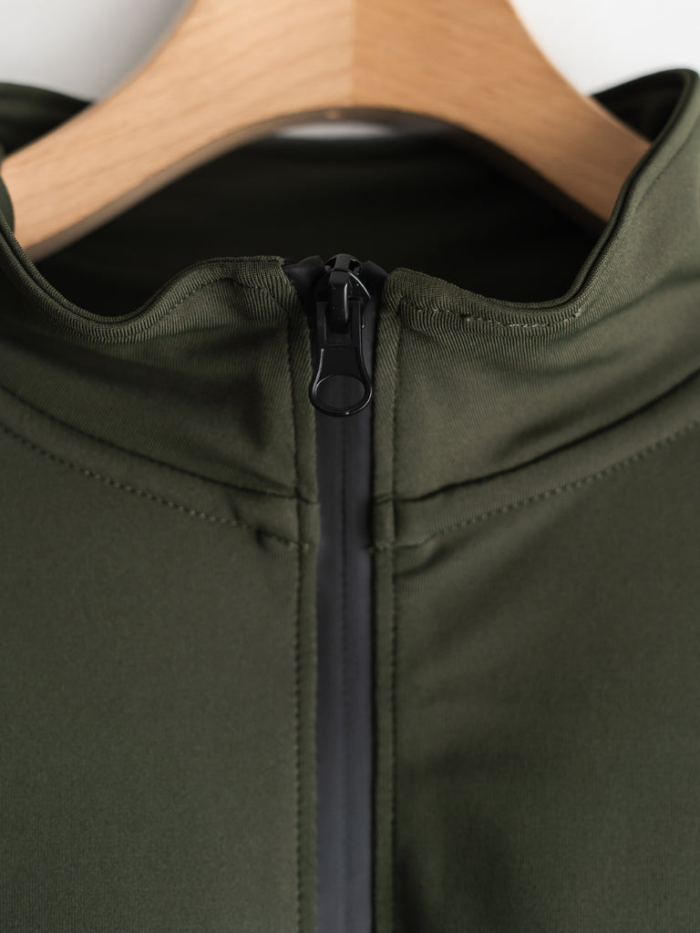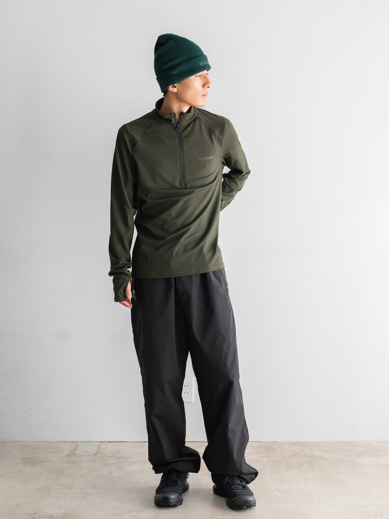ポリエステルとスパンデックス混紡の生地の伸縮性抜群のハーフジップ。