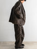 肘のあたりに肩線が来るくらいのドロップショルダーと、二人分くらいの身幅をとった大胆なシルエットが特徴です。