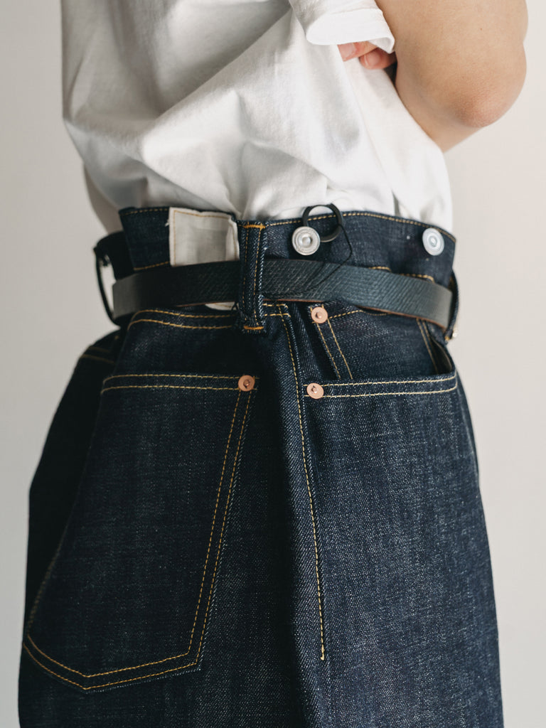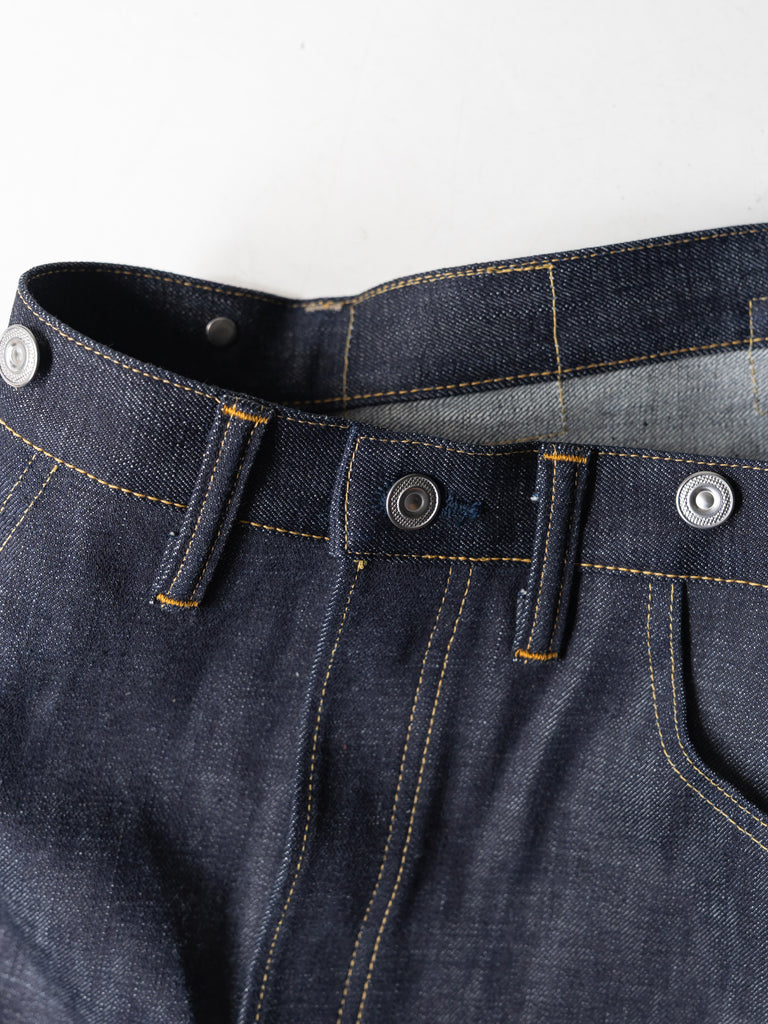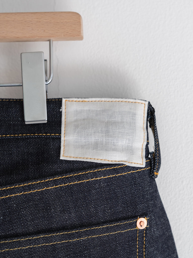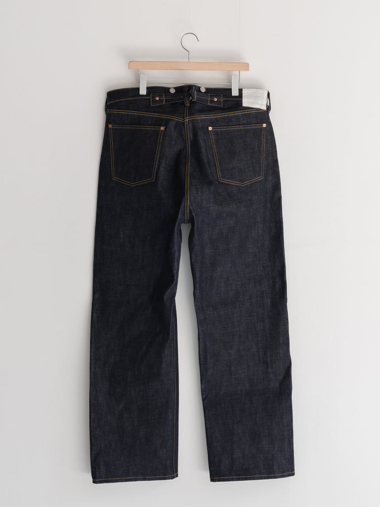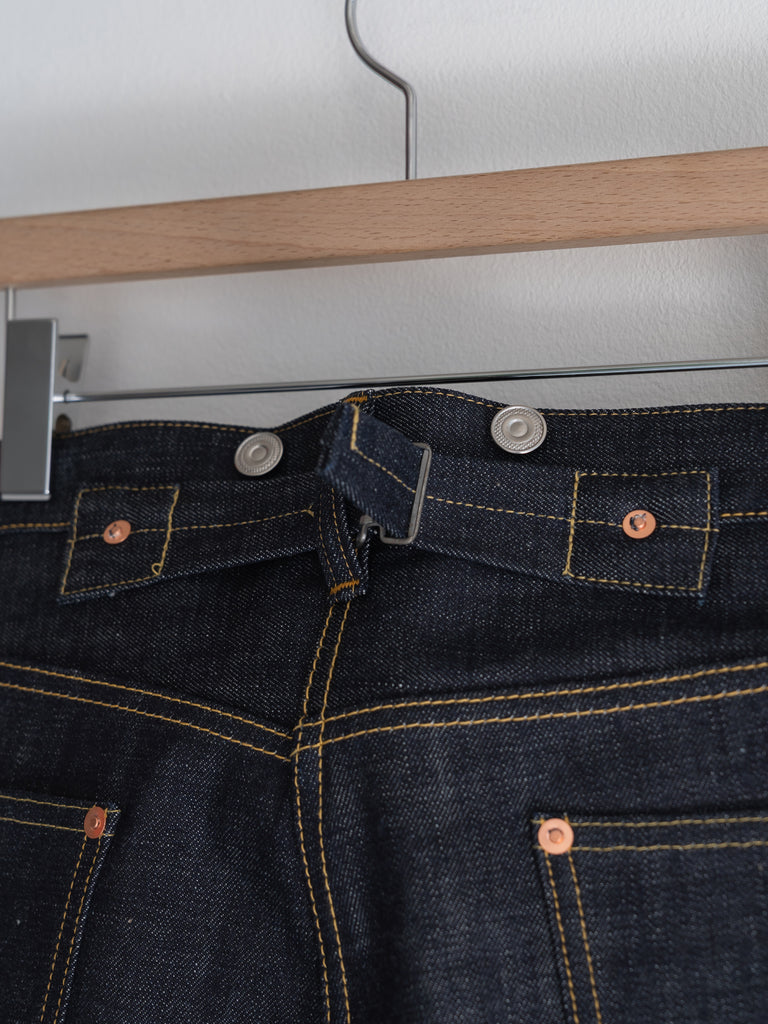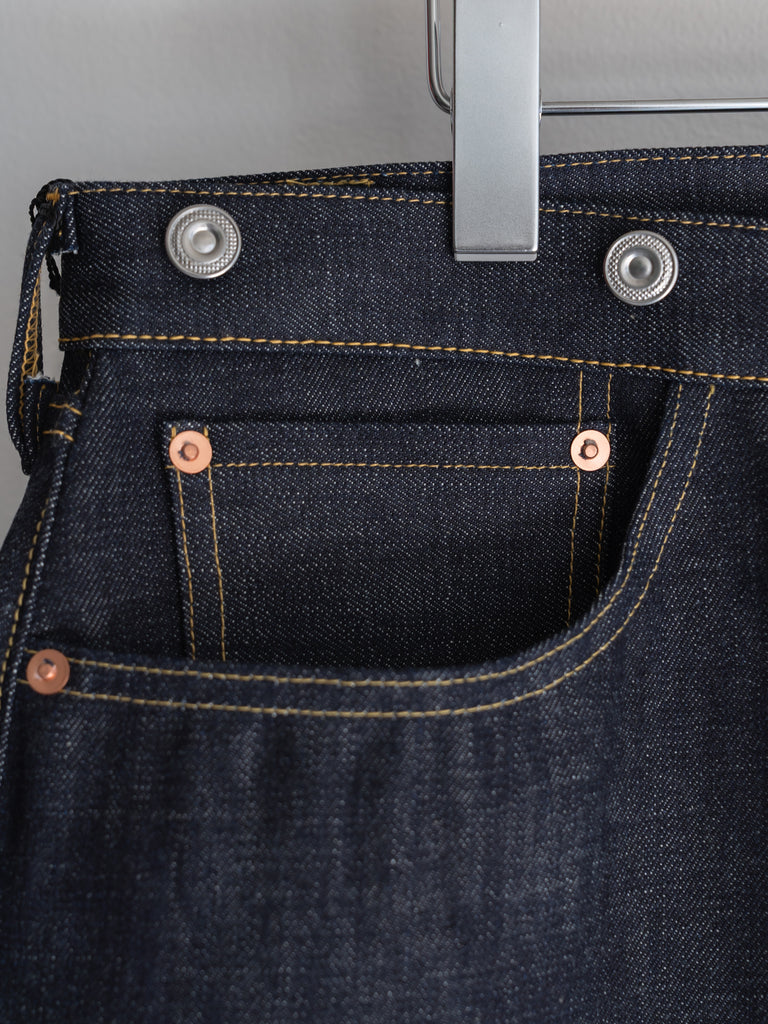 洗うごとに歪みの出るリネンパッチ、稀有な白耳本藍デニム、鉄製の針刺しシンチ、鉄製サスペンダーボタン、リベットの先端をあえてつぶすなど、各時代の特徴的なディテールを取り入れたスペシャルなジーンズです。