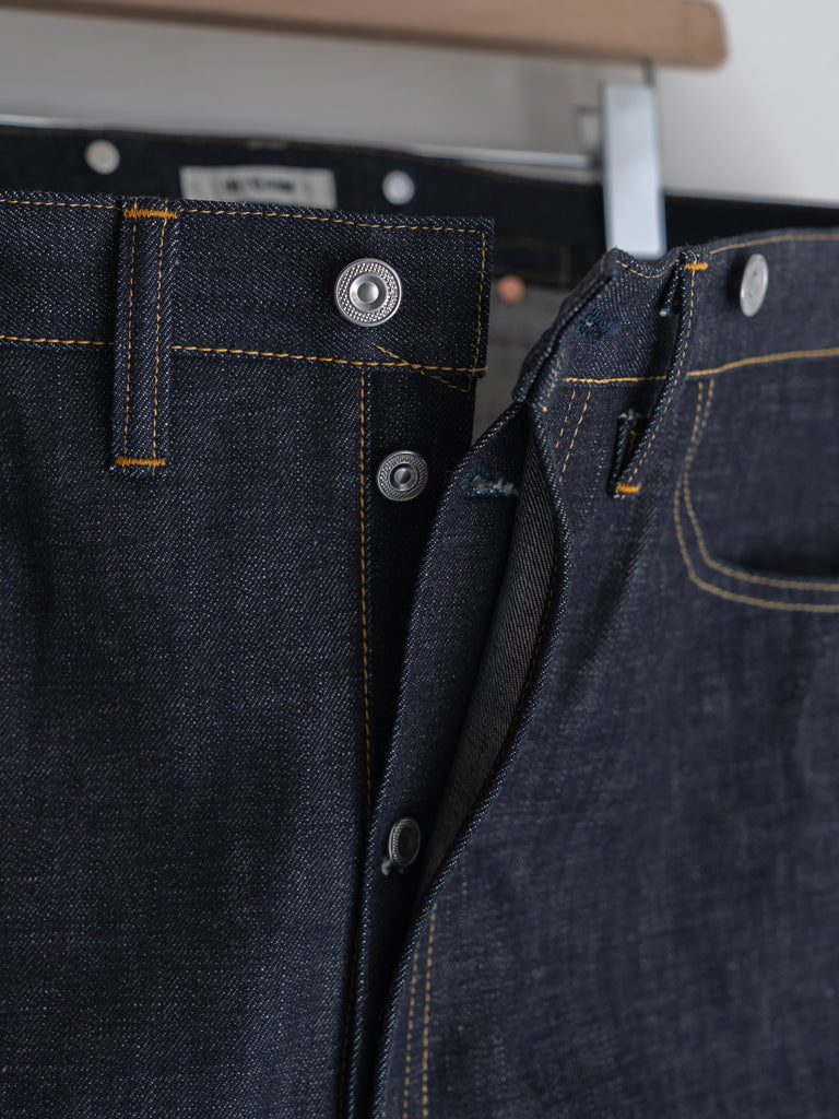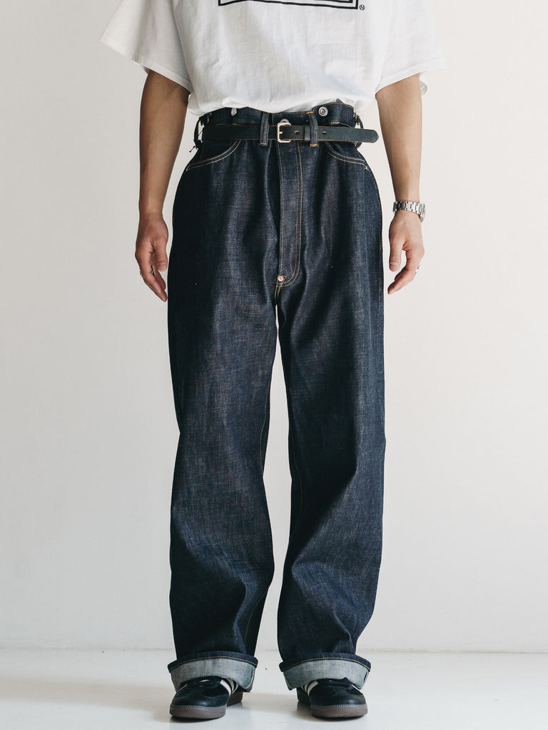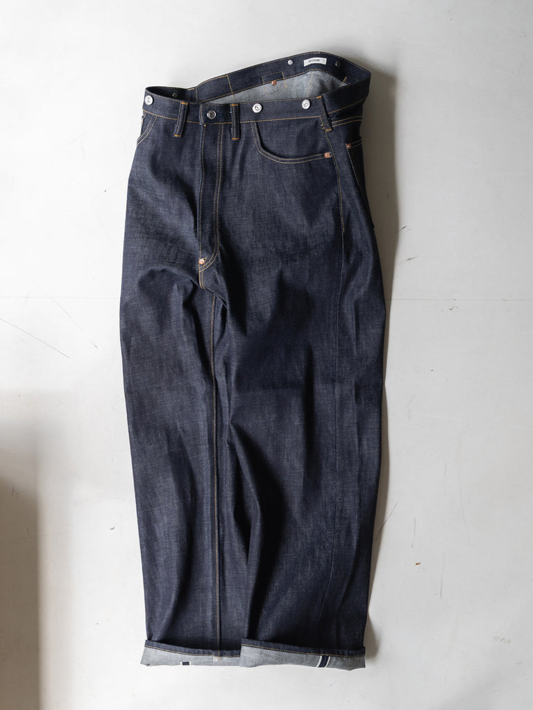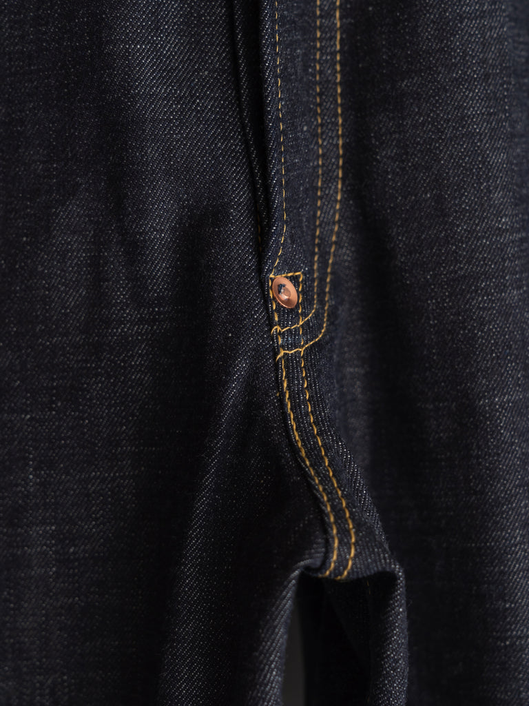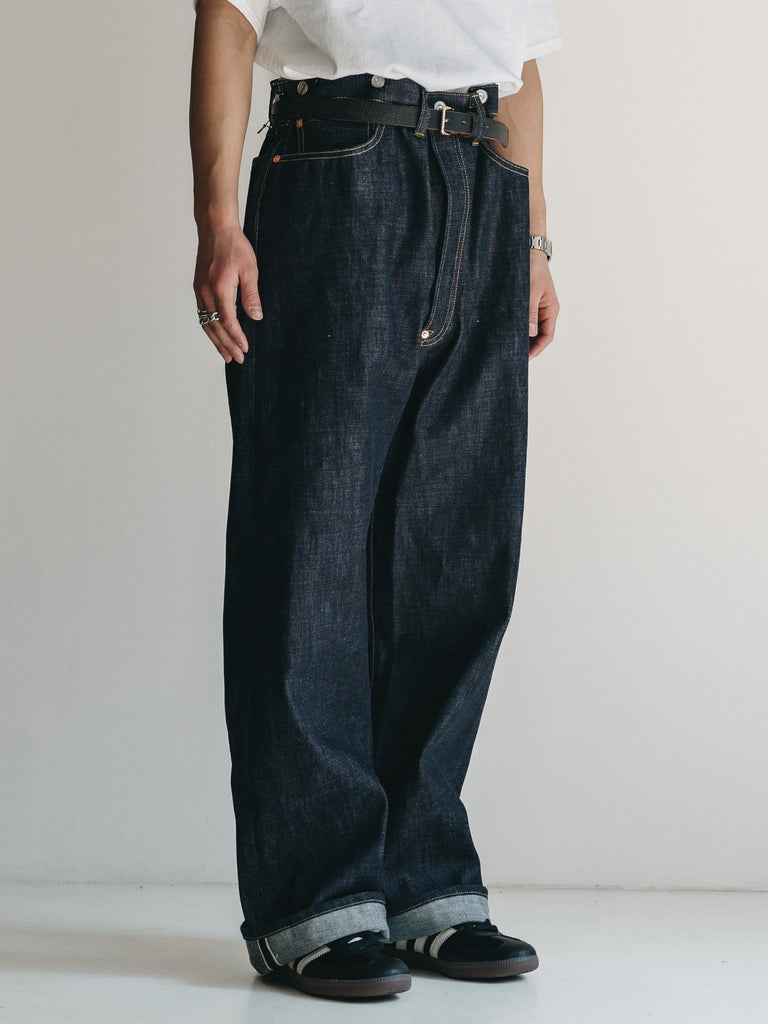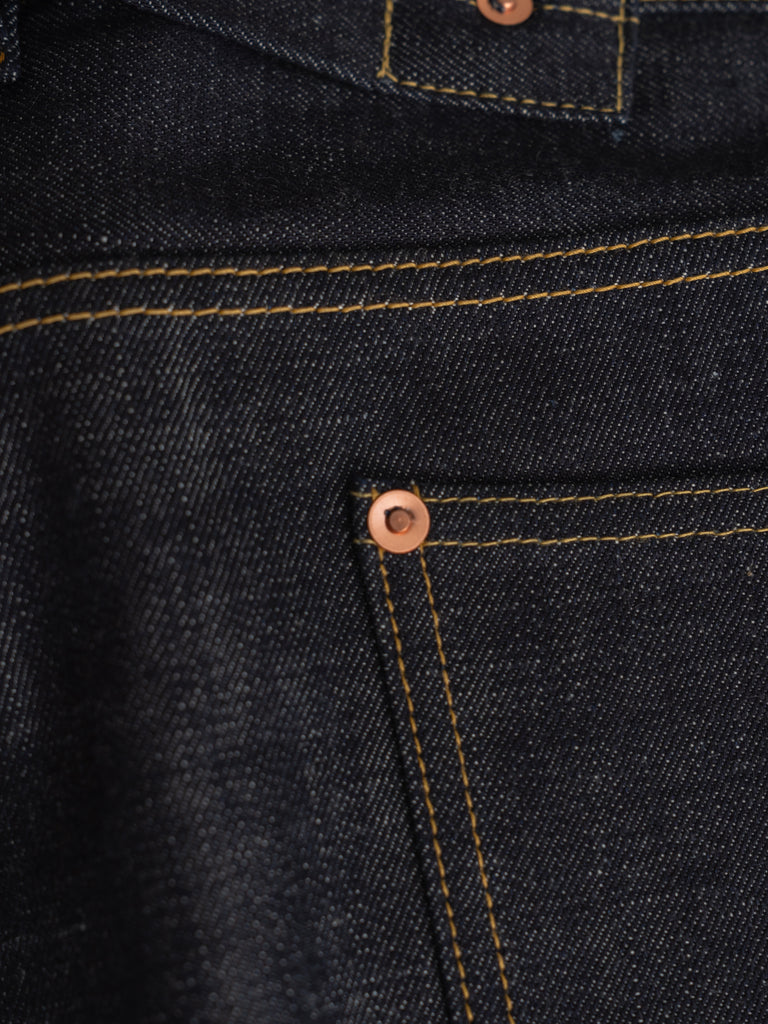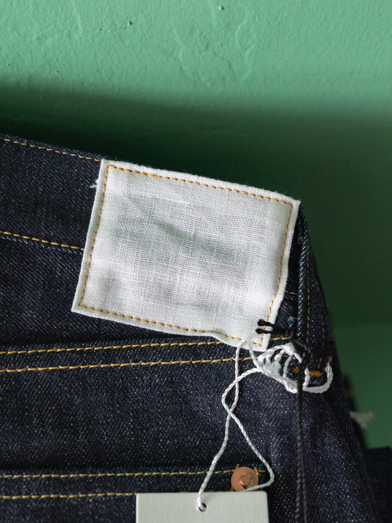 洗うごとに歪みの出るリネンパッチ、稀有な白耳本藍デニム、鉄製の針刺しシンチ、鉄製サスペンダーボタン、リベットの先端をあえてつぶすなど、各時代の特徴的なディテールを取り入れたスペシャルなジーンズです。