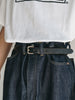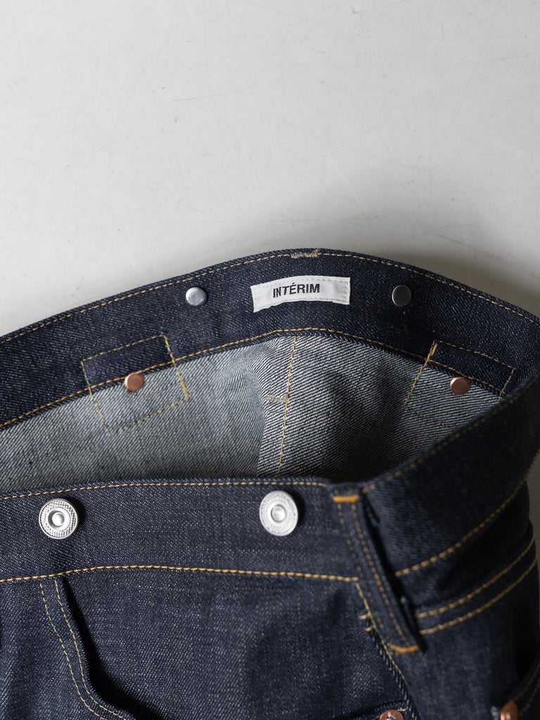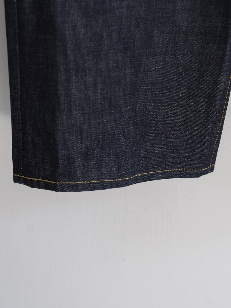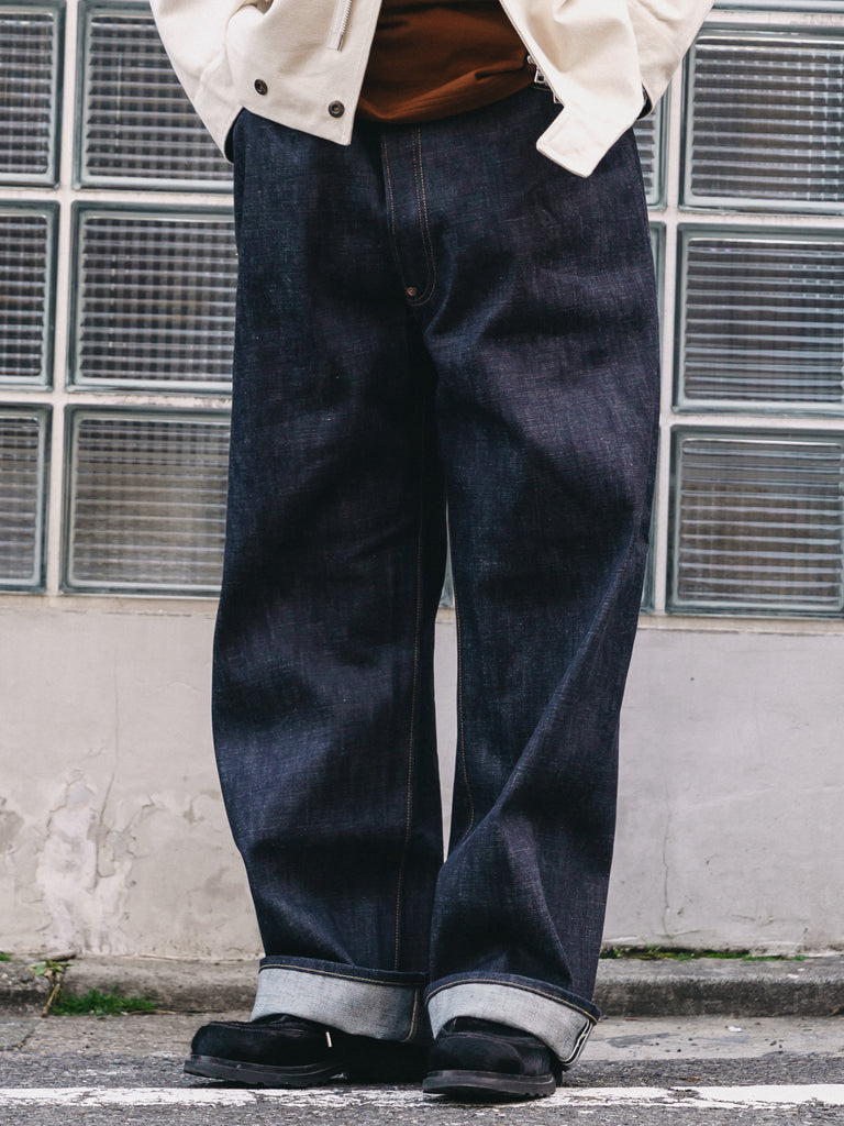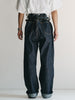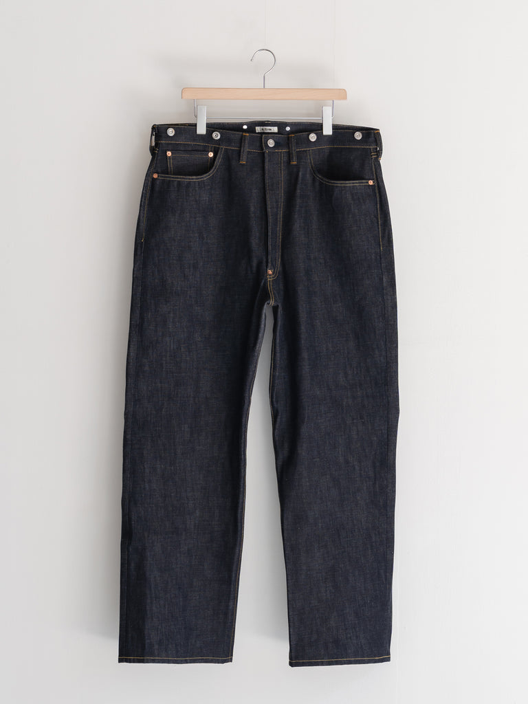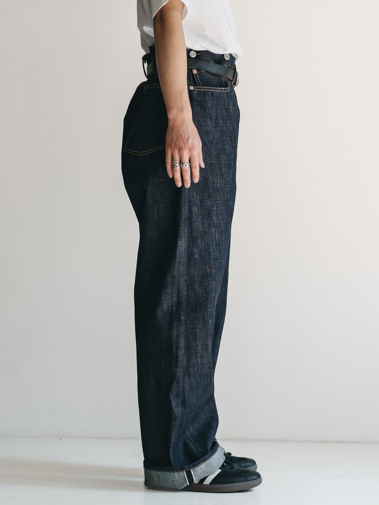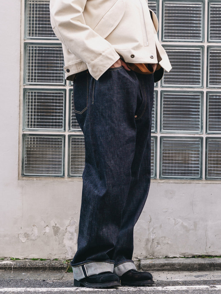 洗うごとに歪みの出るリネンパッチ、稀有な白耳本藍デニム、鉄製の針刺しシンチ、鉄製サスペンダーボタン、リベットの先端をあえてつぶすなど、各時代の特徴的なディテールを取り入れたスペシャルなジーンズです。