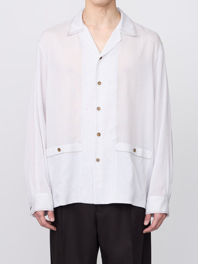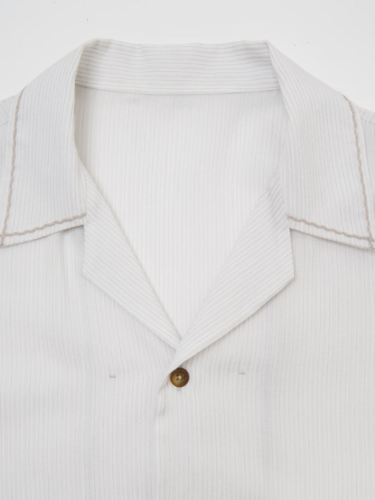 キュプラ/コットン/シルクの交織ストライプ素材を使用したオープンカラーシャツ