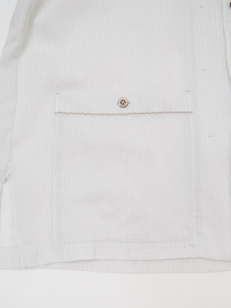 身頃はゆったりとしたサイズ感で、シャープな衿やカフス端に刺繍ステッチをアクセントに施したデザインになっており、開襟の衿や大き目のアウトポケットディティールによってリラックスしたムードの一着になっています。