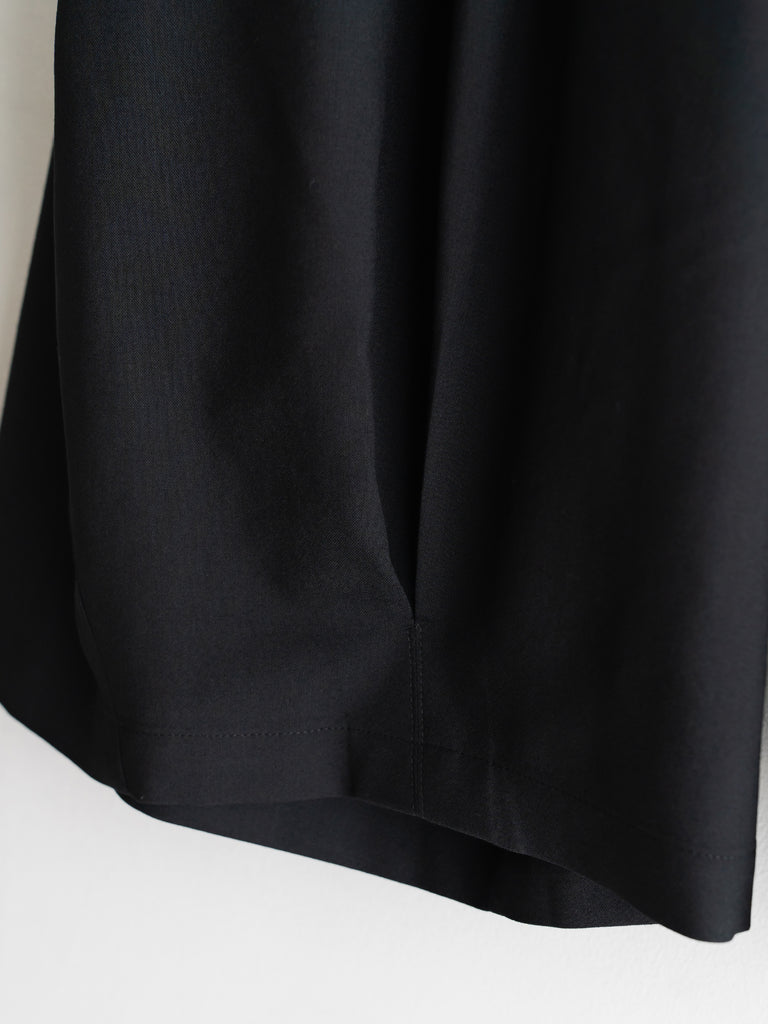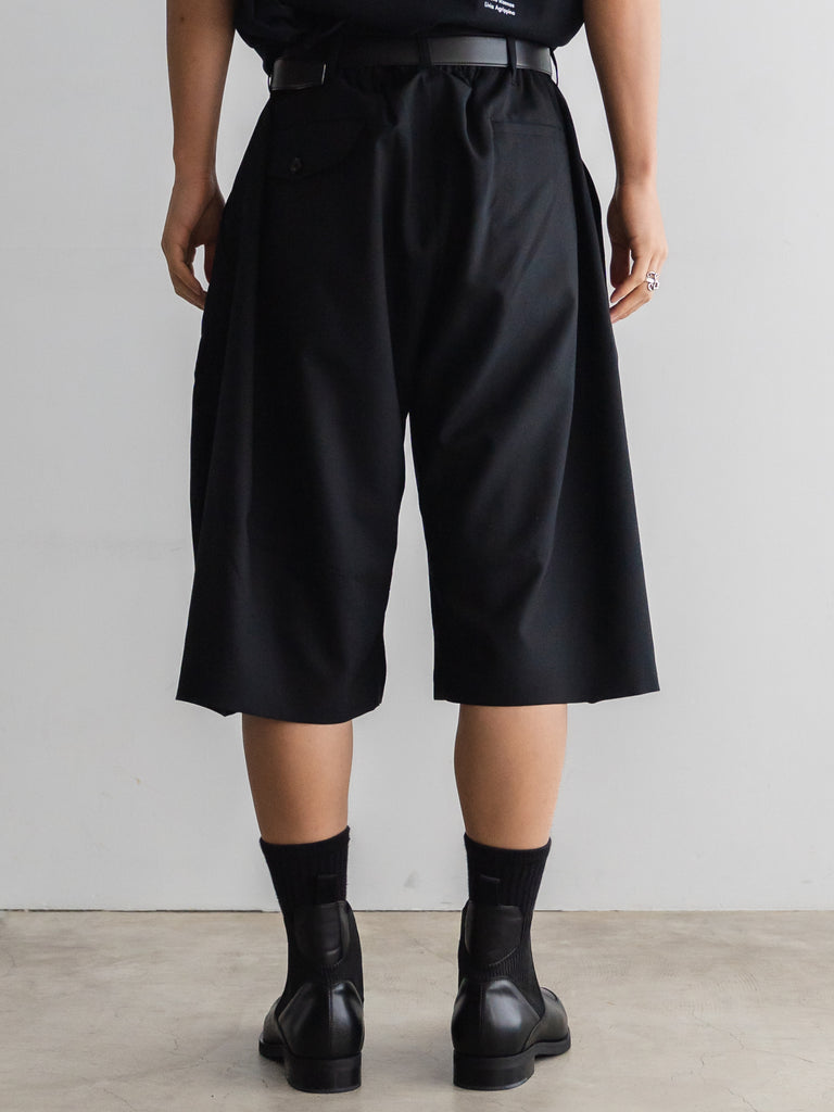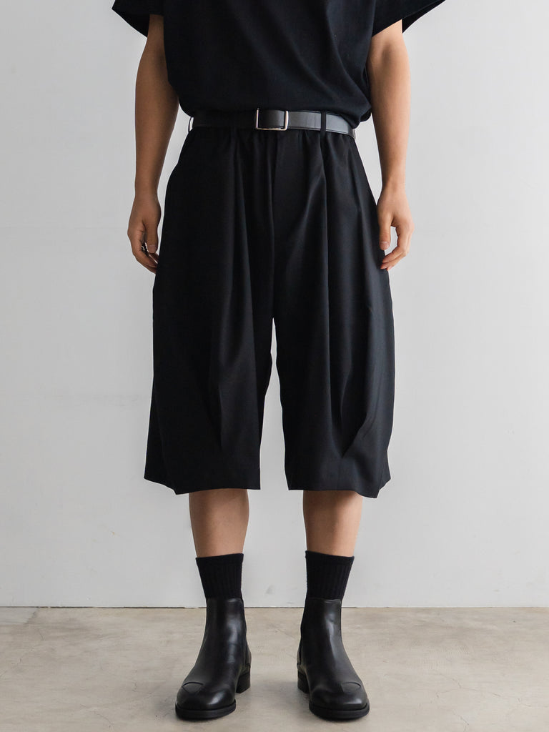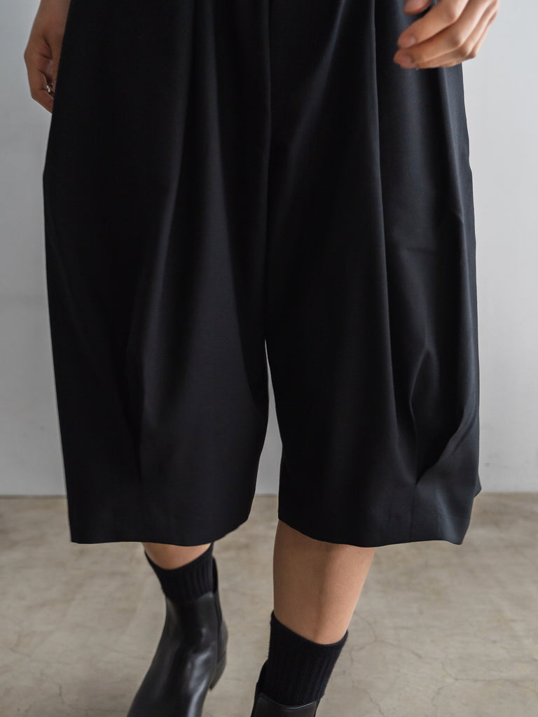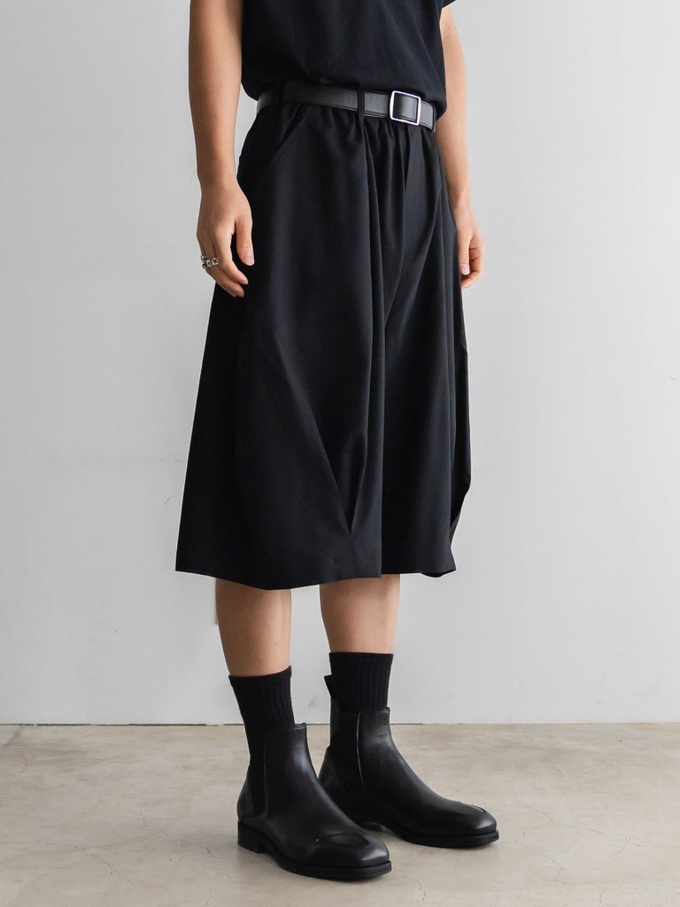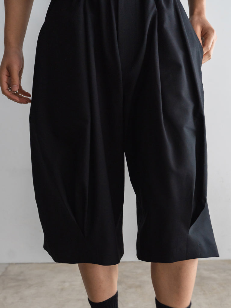 ドレスパンツの構造をベースに、ショーツとして再構築したプリーテッドバルーンドレスショーツ。