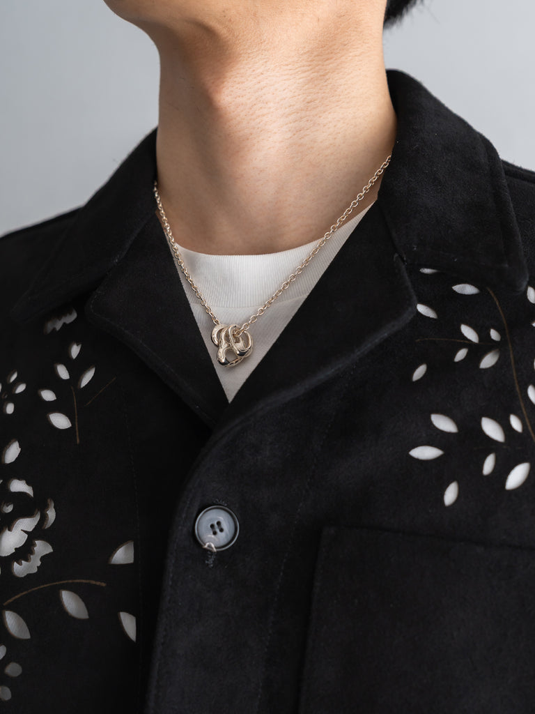 無骨なレザースタイルと、焼き付けによって浮かび上がる繊細な花柄のコントラストが特徴的。