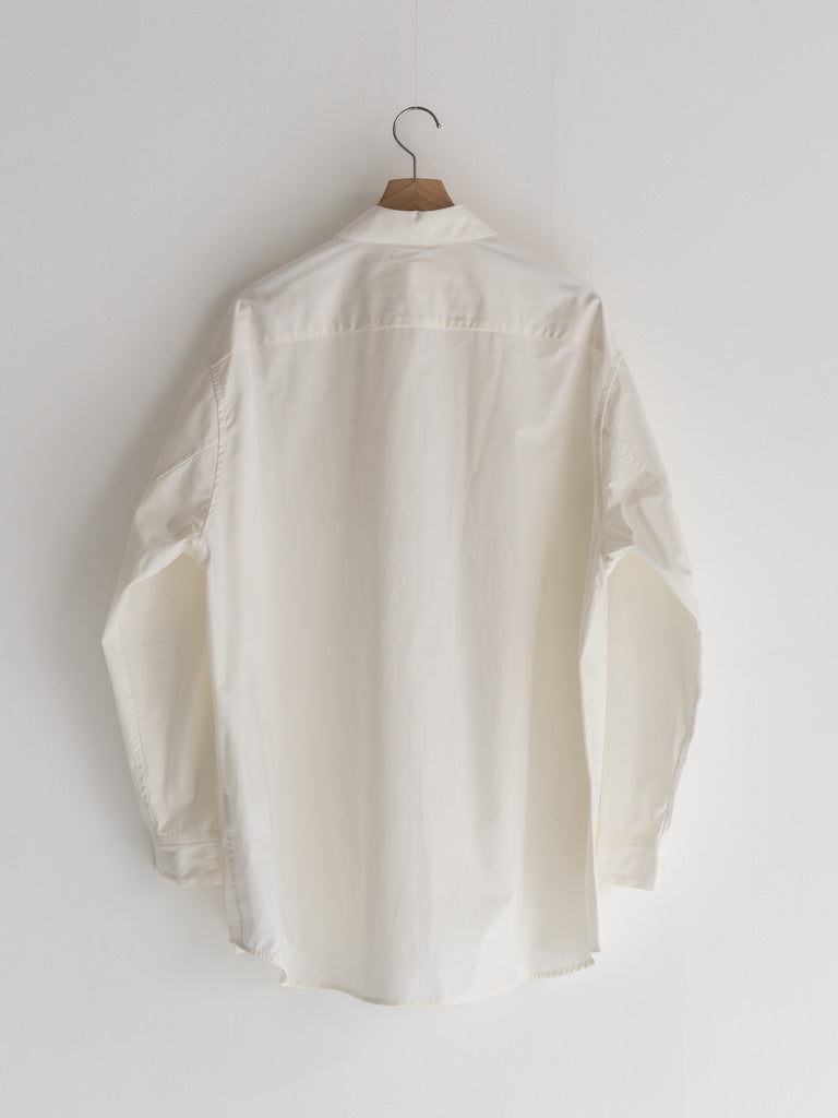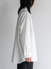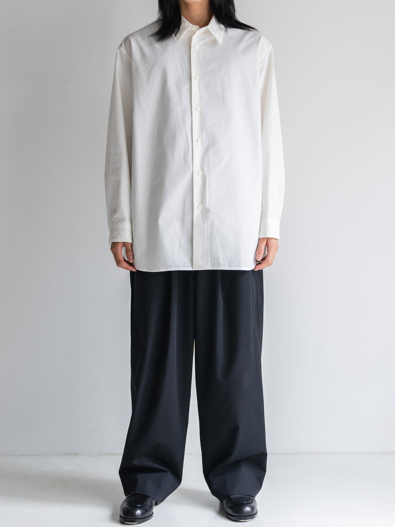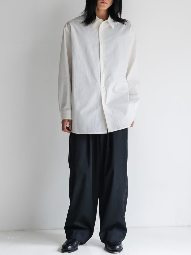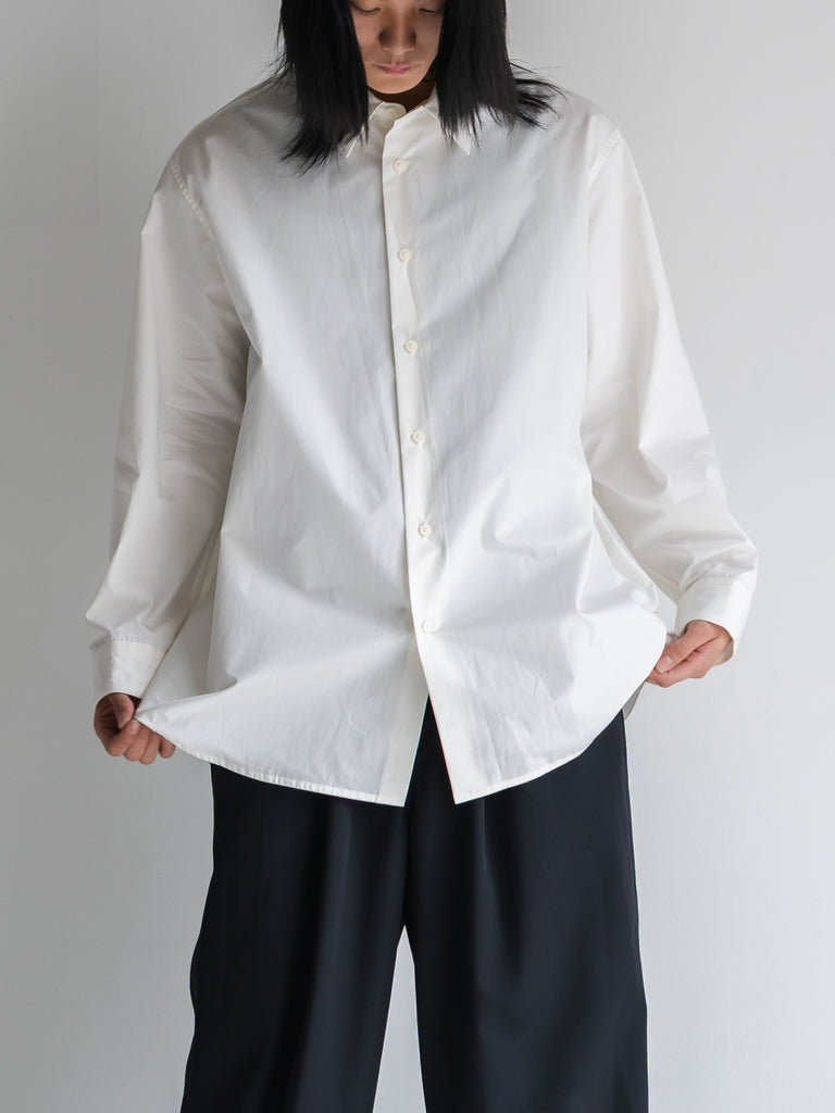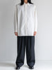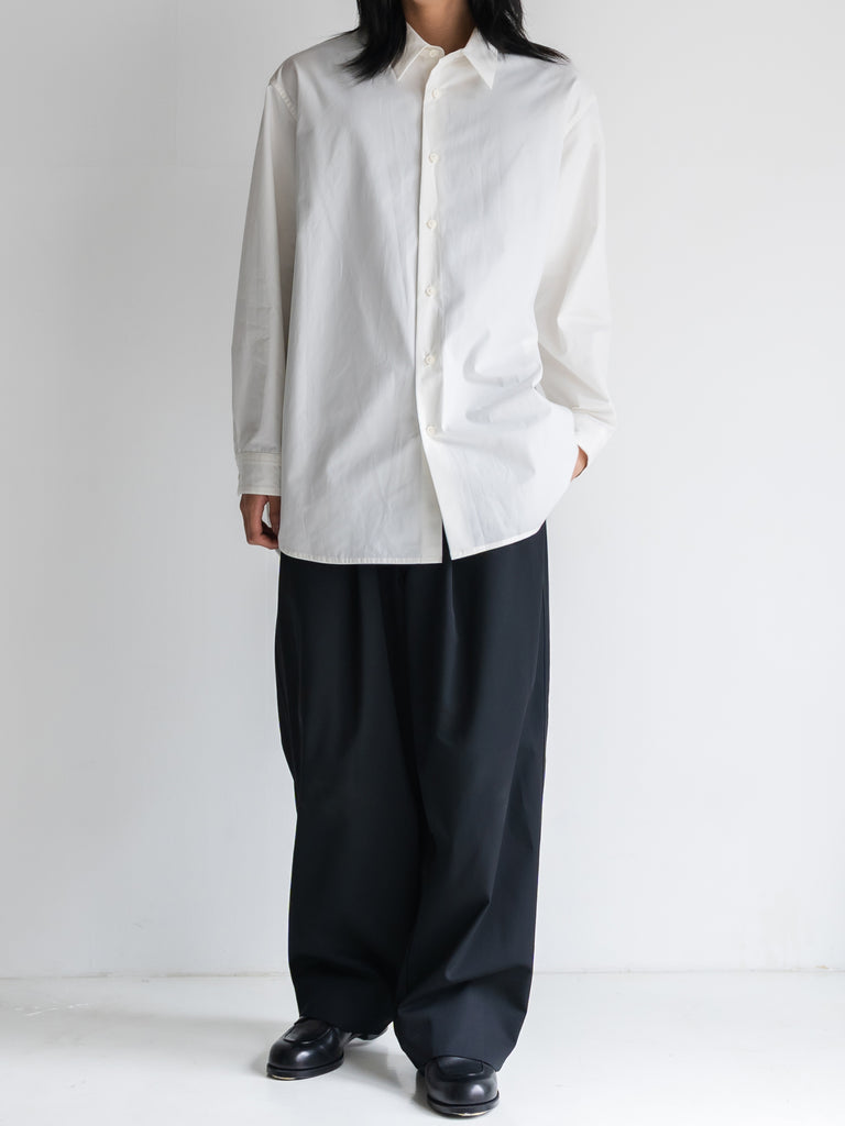 たっぷりとしたオーバーサイズの中に、ヘビーブロードの張り感としなやかなドレープが共存し、どの角度から見ても絵になるシルエットに。