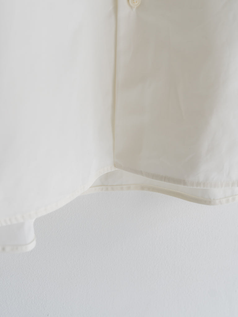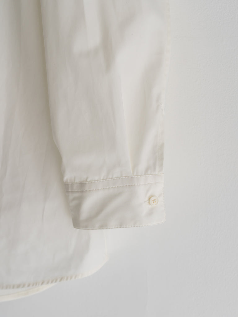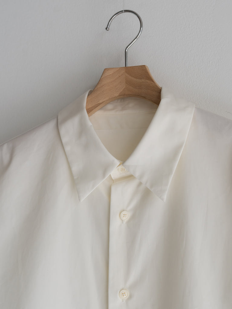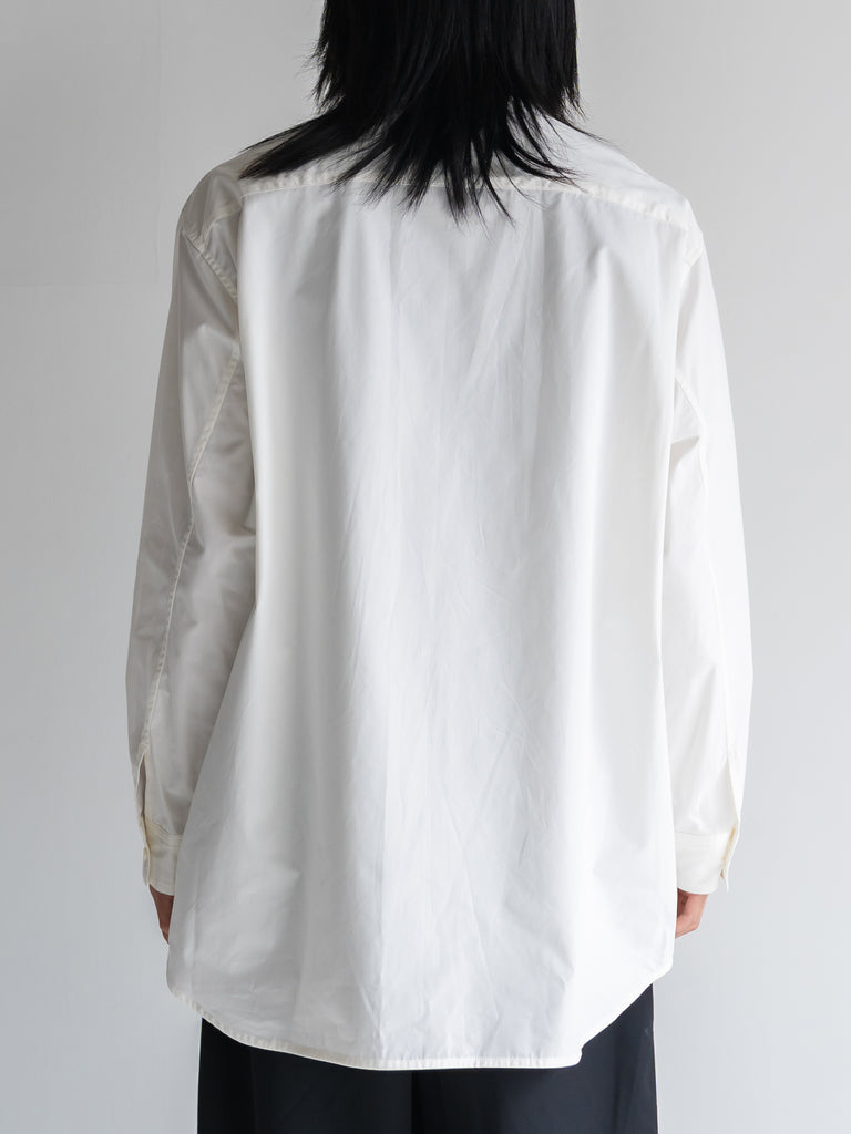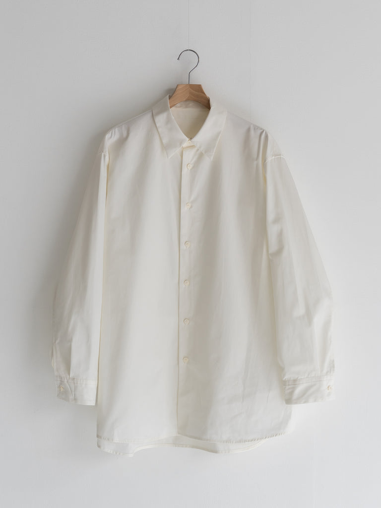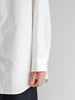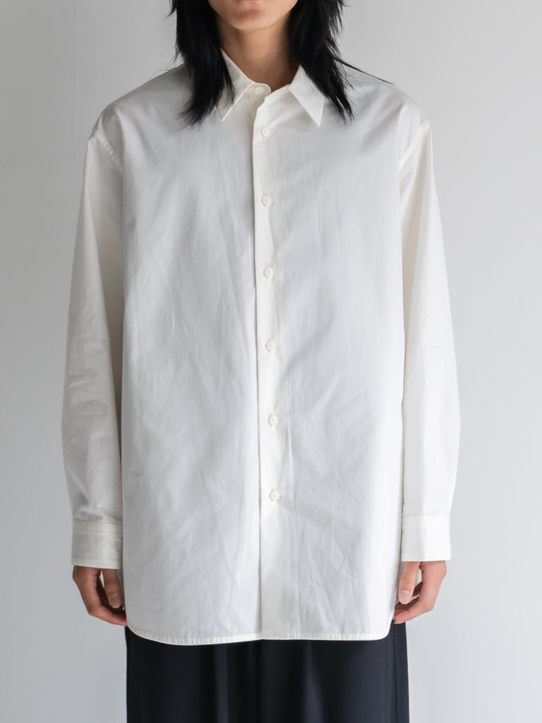 たっぷりとしたオーバーサイズの中に、ヘビーブロードの張り感としなやかなドレープが共存し、どの角度から見ても絵になるシルエットに。