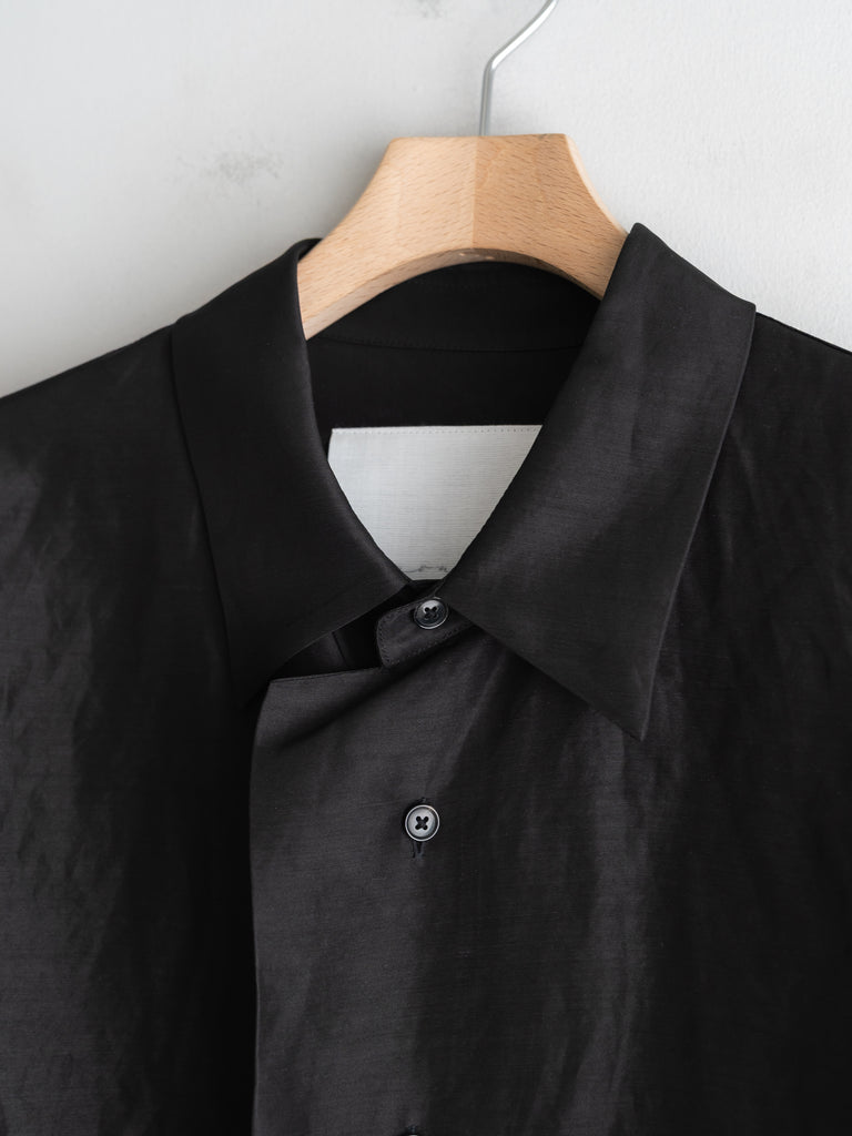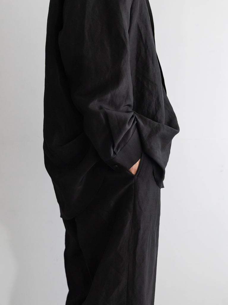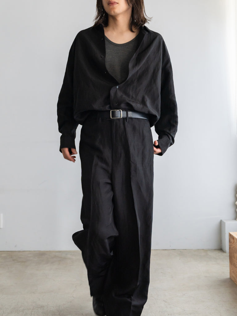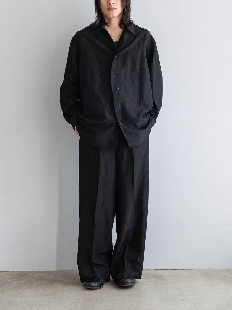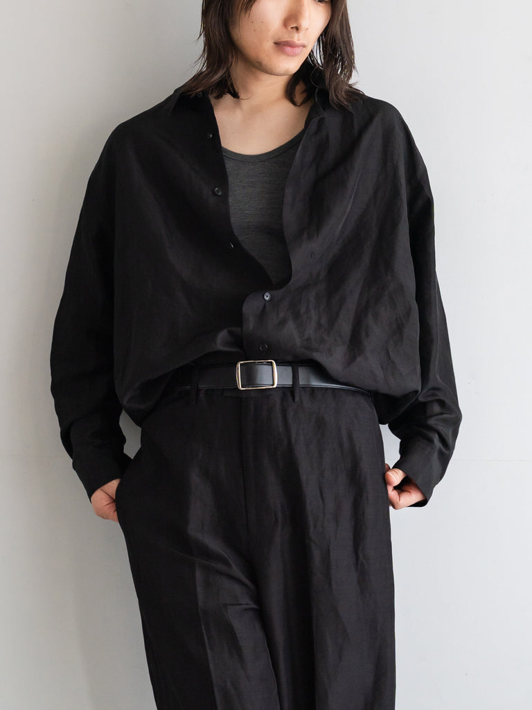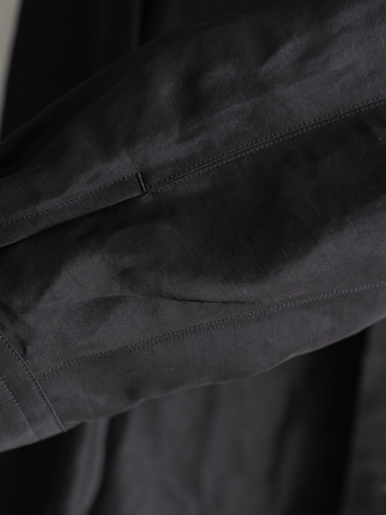 レーヨン×リネンのLineon素材が持つ、シャリ感とドレープが合わさることで、シャツ全体にほのかな陰影が生まれ、直線的なパターンの中に柔らかな揺らぎを感じていただける仕上がりです。