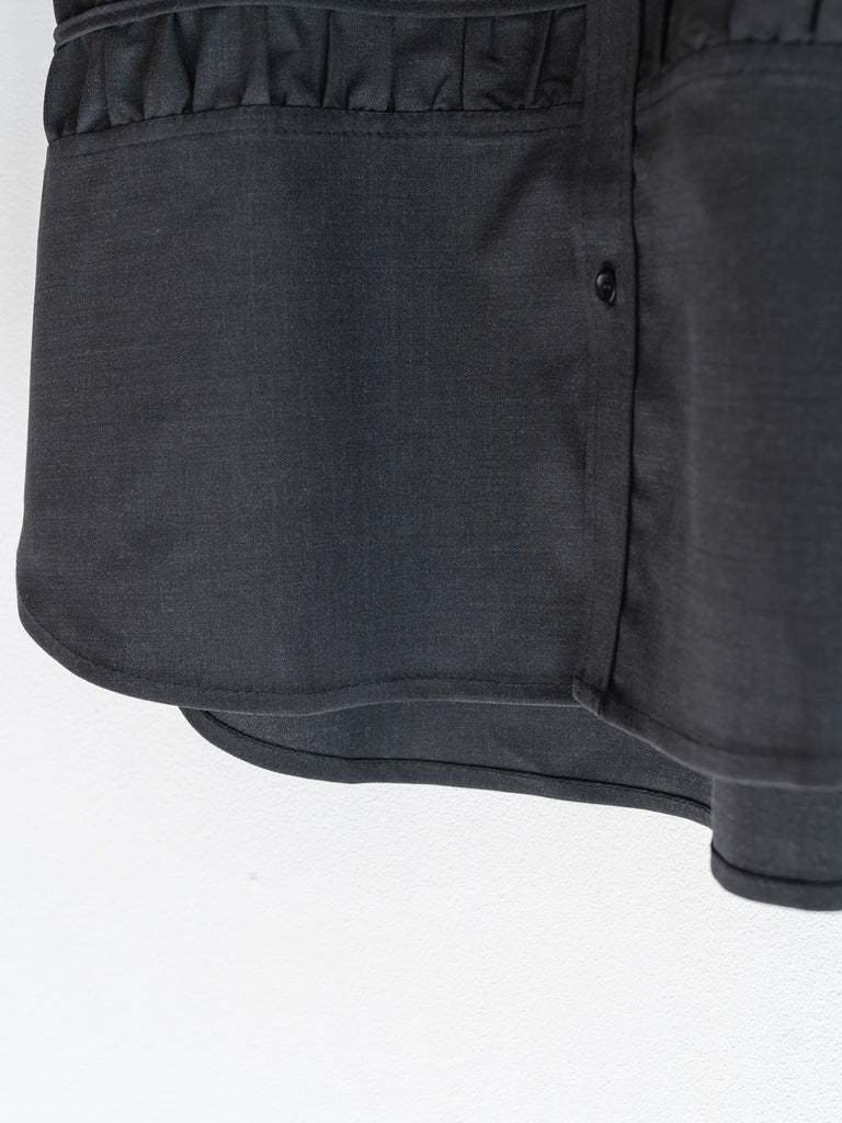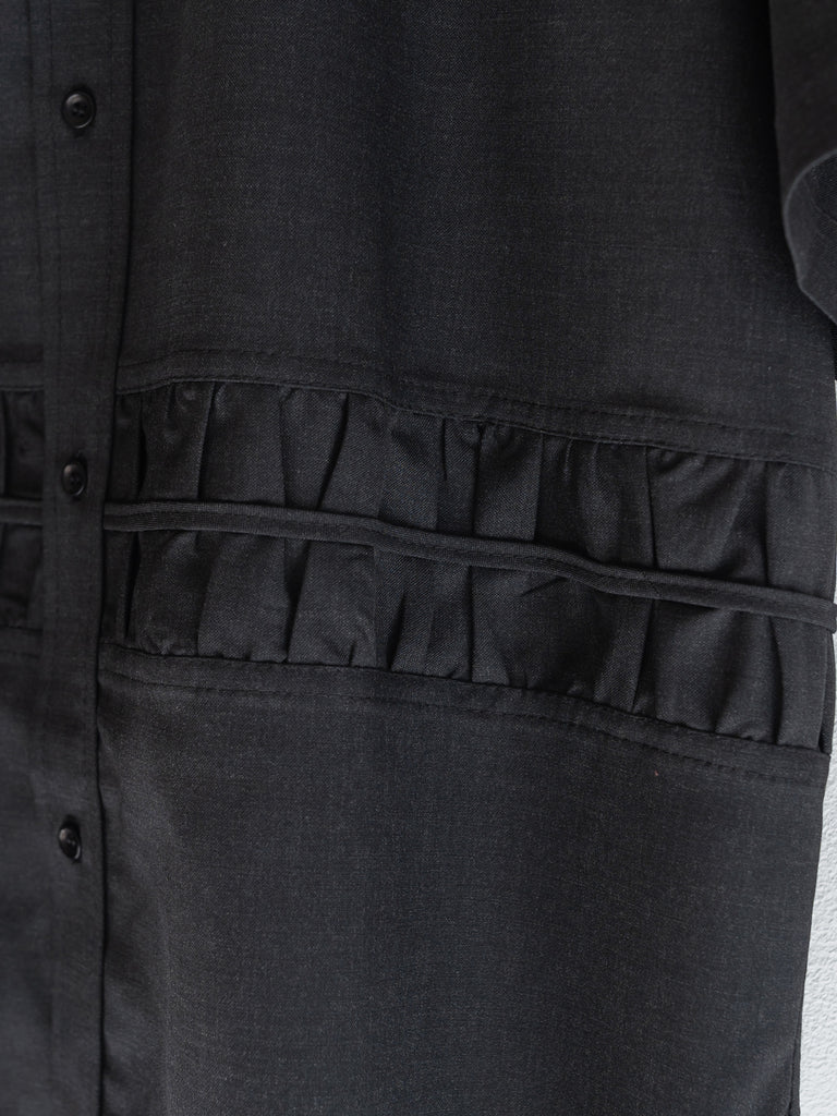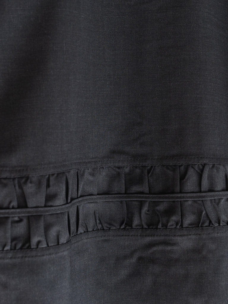 身頃中央にはギャザーを寄せたクロス状のパネルをあしらい、立体感とコントラストを演出。