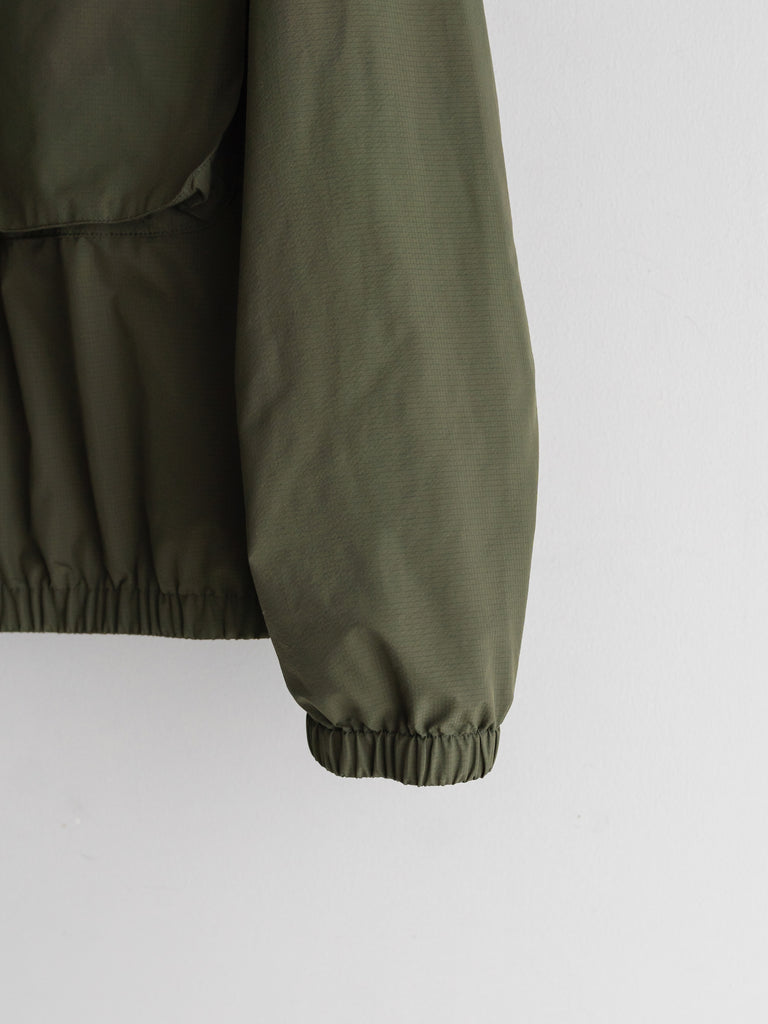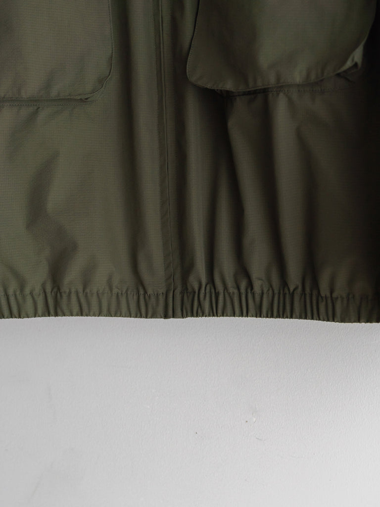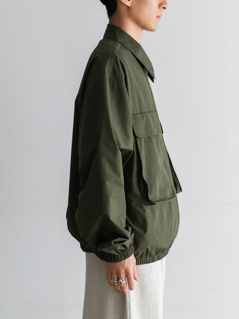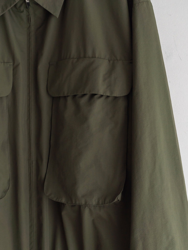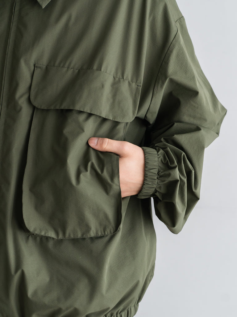 細かい格子状に織り込まれたリップストップポリエステルを使用。耐久性が高く、軽量な上に、撥水、防風に優れています。両胸についたマチ付きポケットが特徴的なデザイン。身幅にゆとりあるボックスシルエット。製品にはウォッシュ加工を施しています。