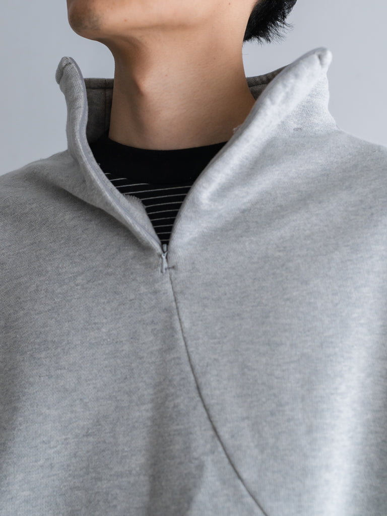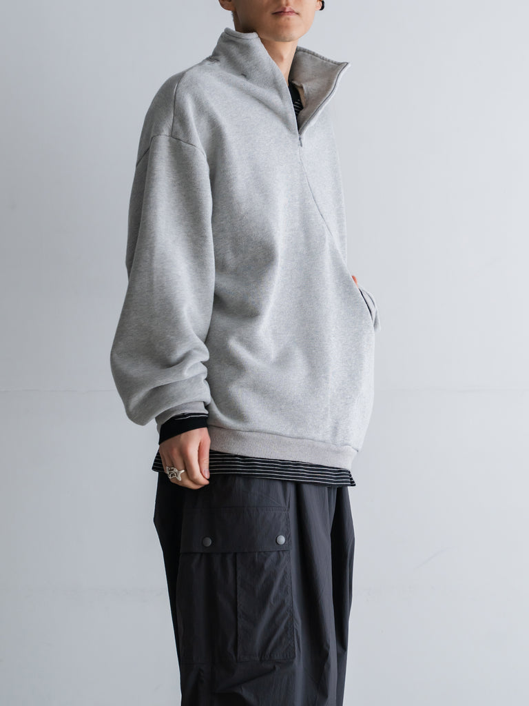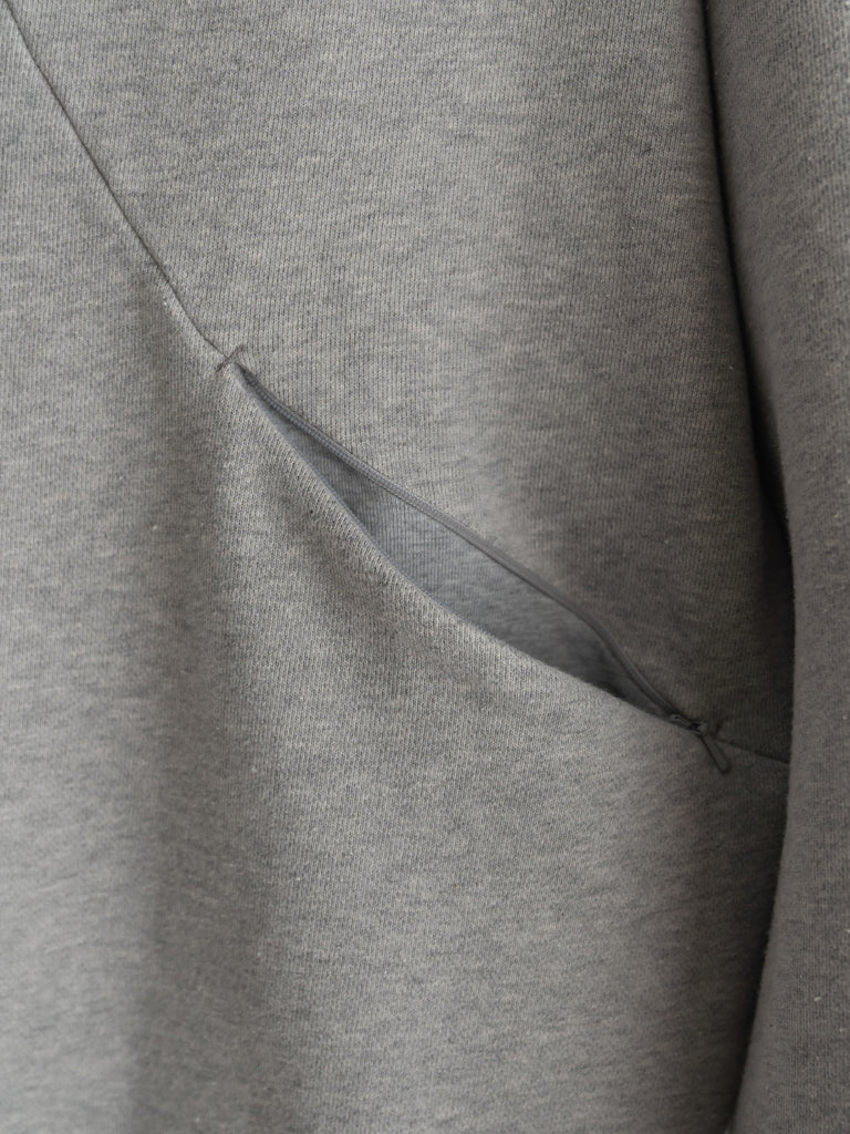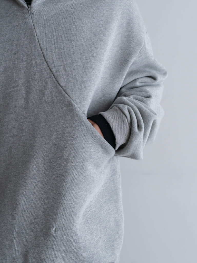 コットン100%のソフトで程よいボリューム感のある裏毛を使用しています。斜めについたファスナーが特徴的。染色を落とす特殊加工を施し、古着の様な愛着のある風合いにしました。着丈は短く、身幅にゆとりのあるバギーシルエットです。