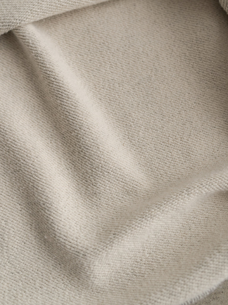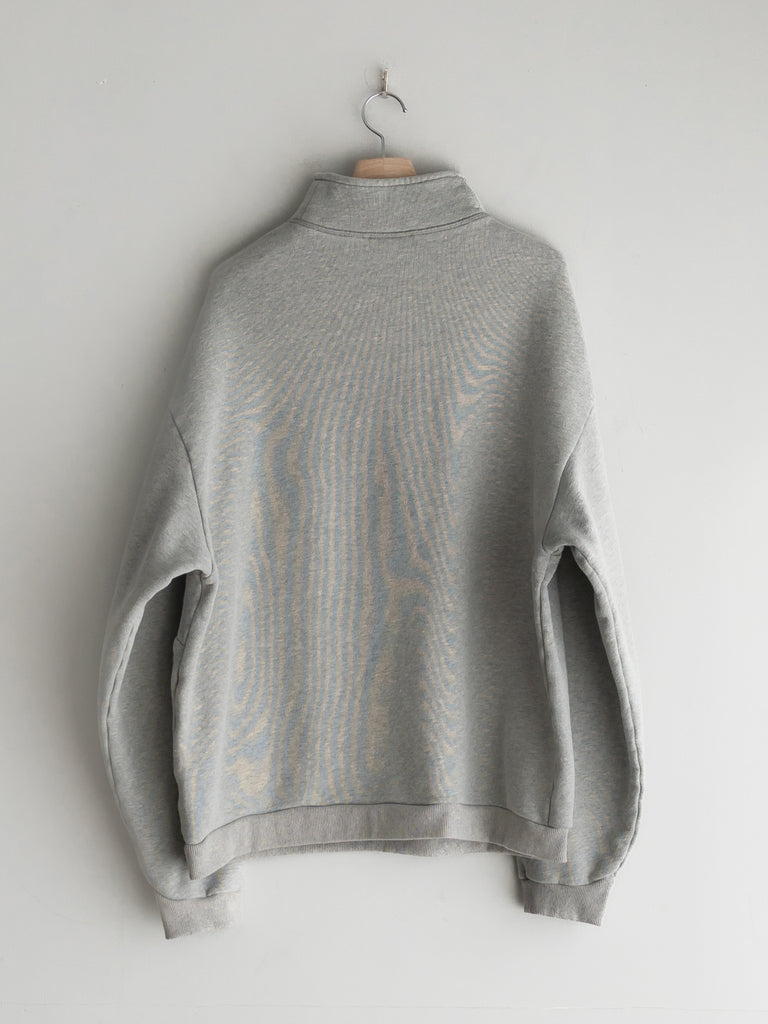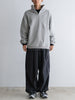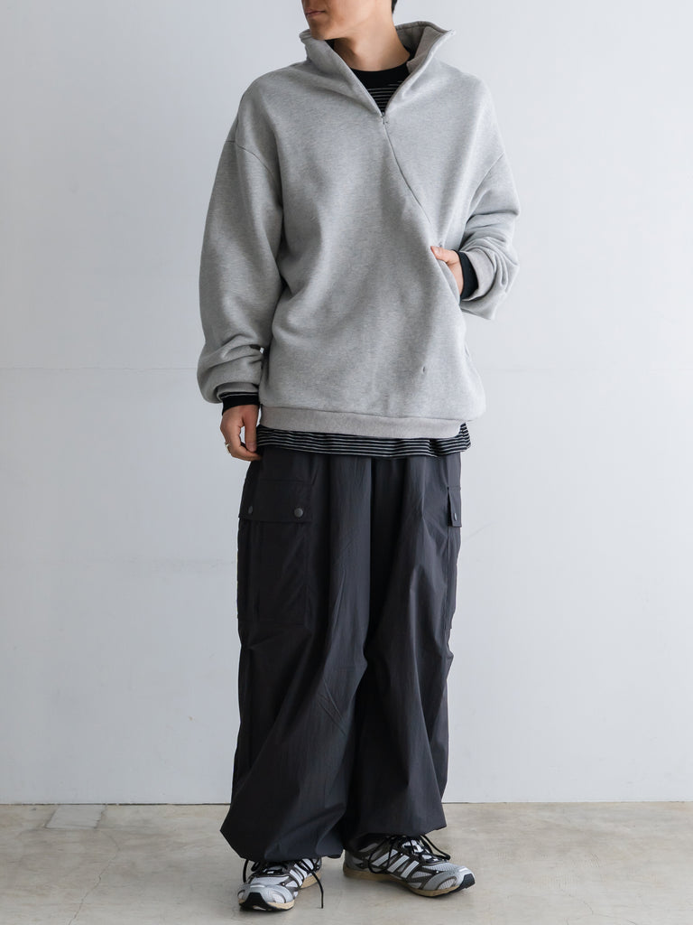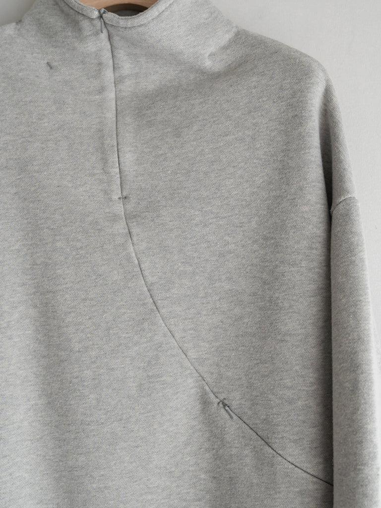 コットン100%のソフトで程よいボリューム感のある裏毛を使用しています。斜めについたファスナーが特徴的。染色を落とす特殊加工を施し、古着の様な愛着のある風合いにしました。着丈は短く、身幅にゆとりのあるバギーシルエットです。
