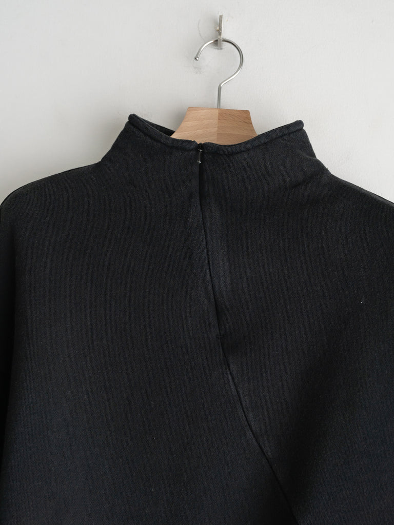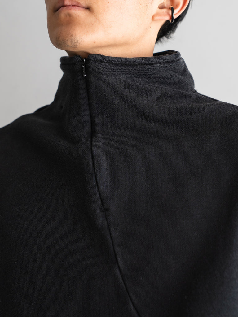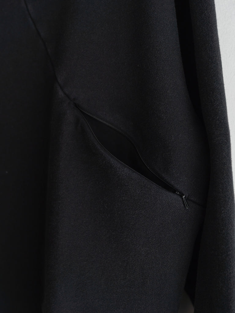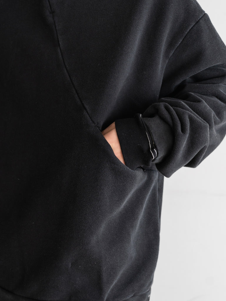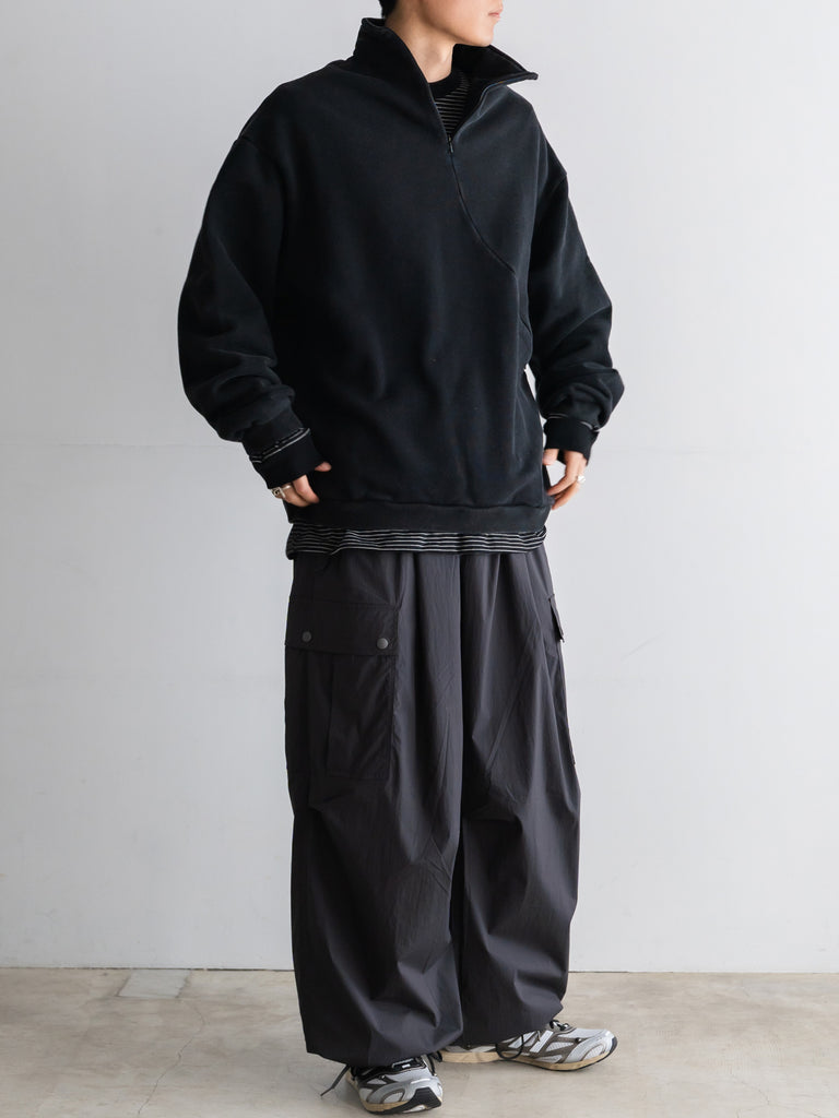 コットン100%のソフトで程よいボリューム感のある裏毛を使用しています。斜めについたファスナーが特徴的。染色を落とす特殊加工を施し、古着の様な愛着のある風合いにしました。着丈は短く、身幅にゆとりのあるバギーシルエットです。