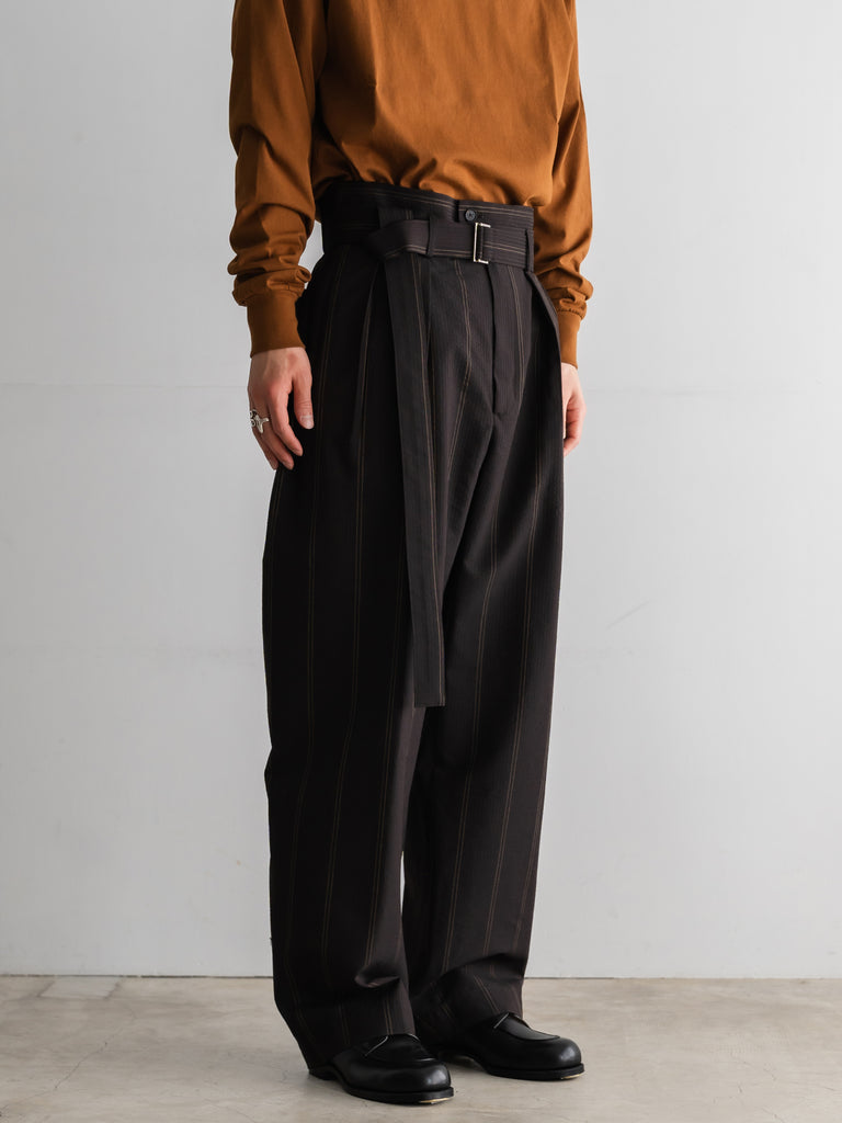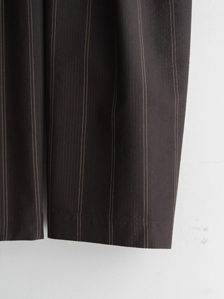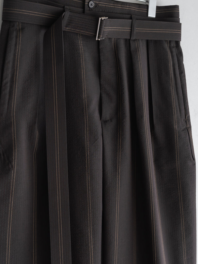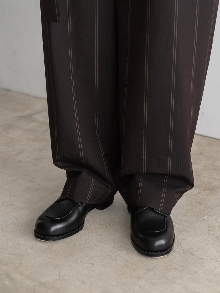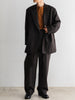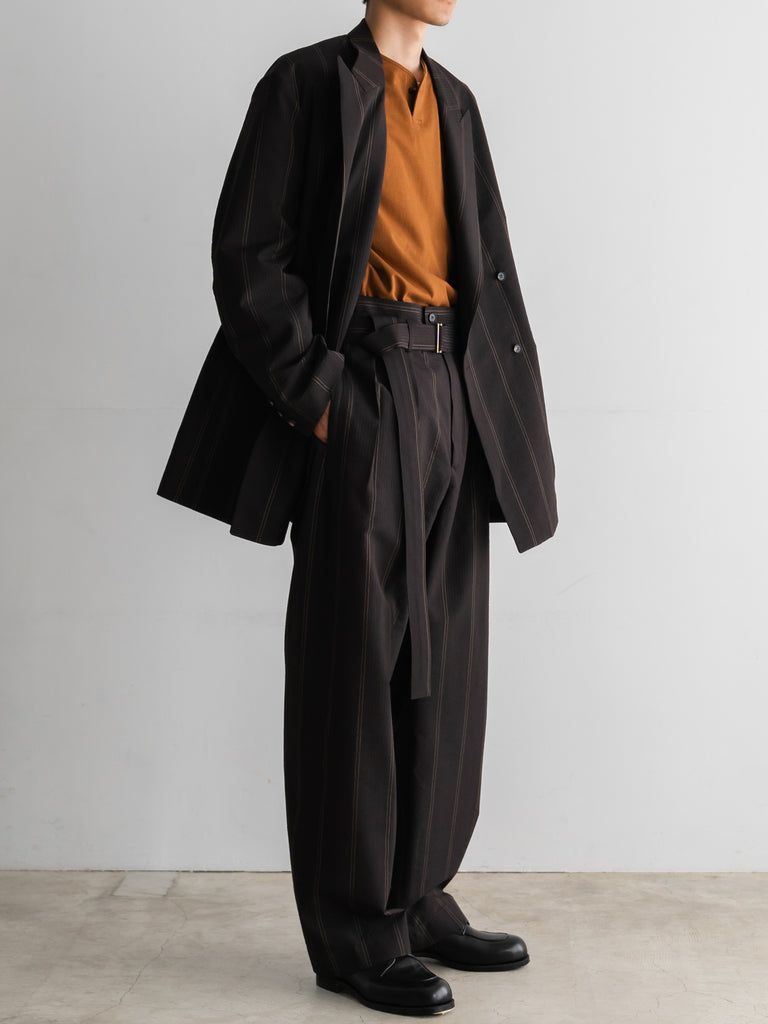 一般的な2種類の異なるテンションではなく、6本を交互に配することで、立体感のある複雑なストライプを表現しています。黒とダークブラウンで構成された濃色ストライプは、一見単色に見えながらも奥行きのある表情に。