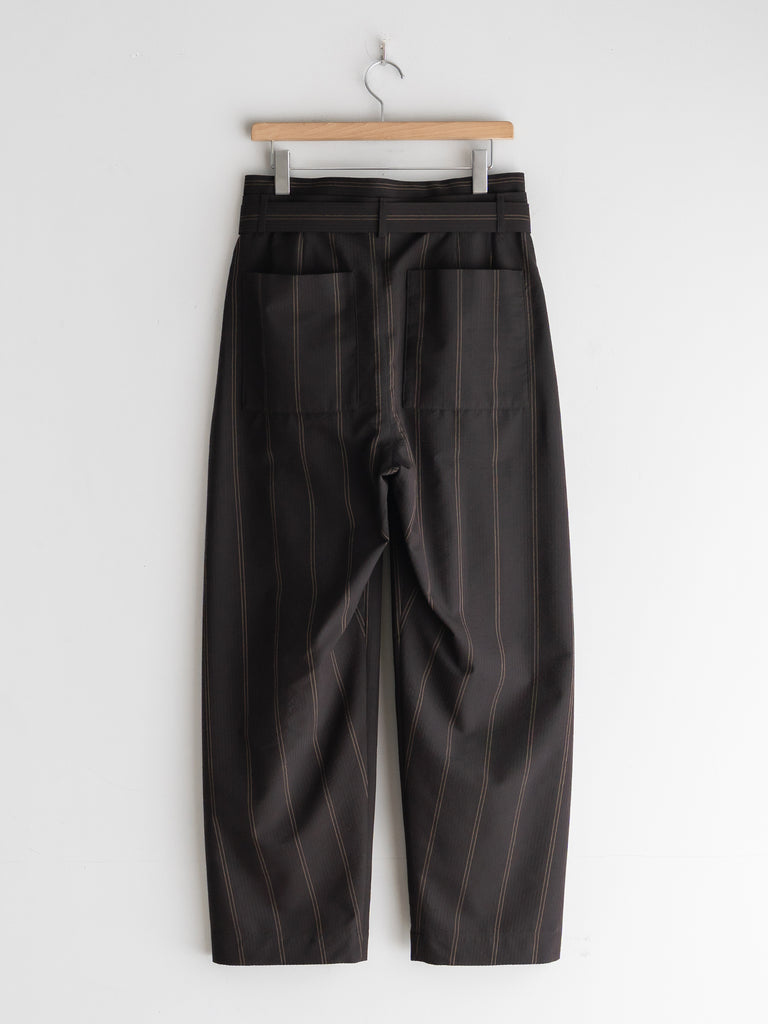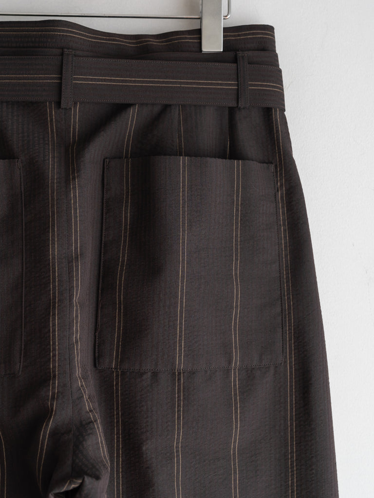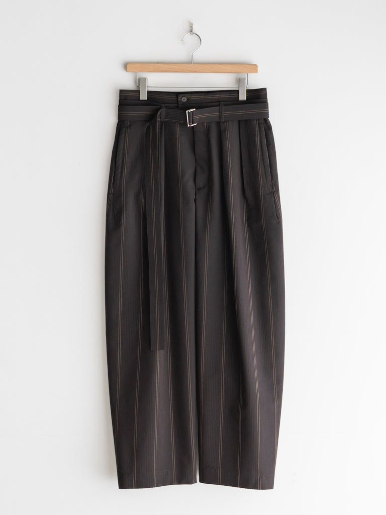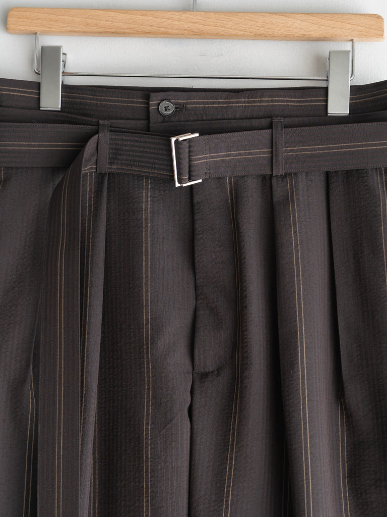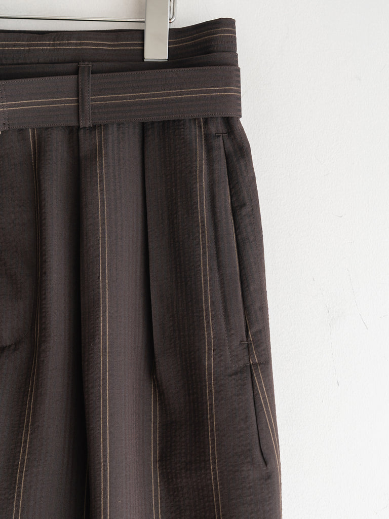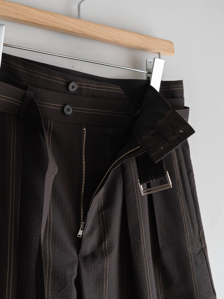 一般的な2種類の異なるテンションではなく、6本を交互に配することで、立体感のある複雑なストライプを表現しています。黒とダークブラウンで構成された濃色ストライプは、一見単色に見えながらも奥行きのある表情に。
