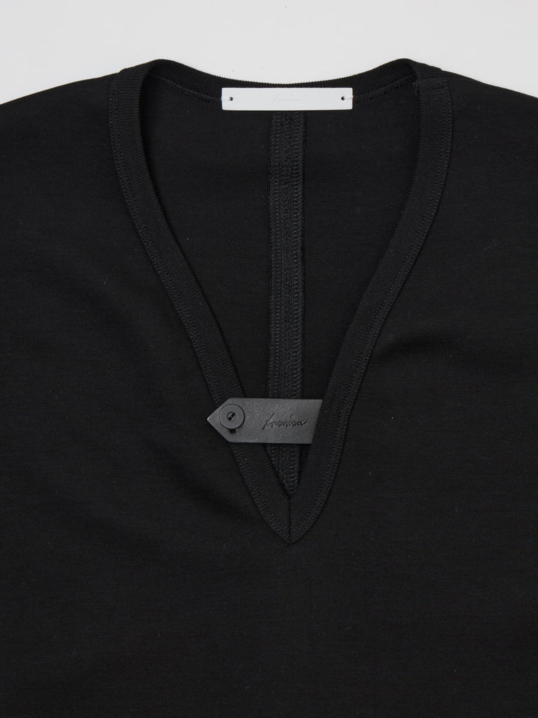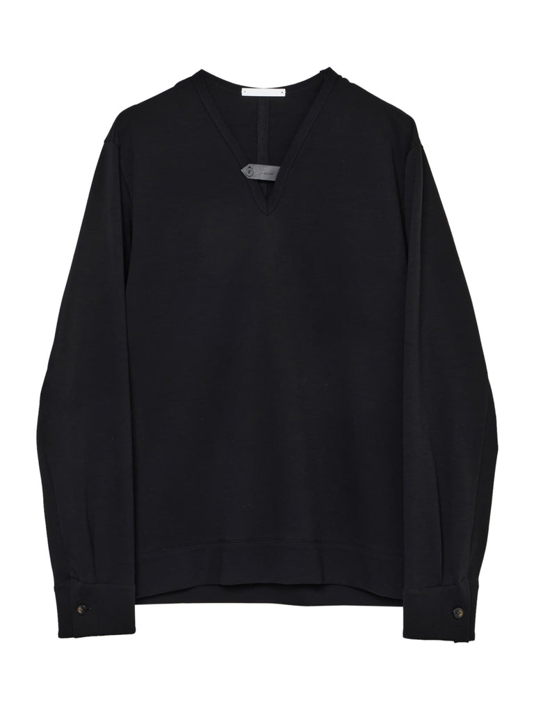 強撚の特殊2重編みのコットン素材を使用して、後衿ぐりにコードを入れた長袖Tシャツ。