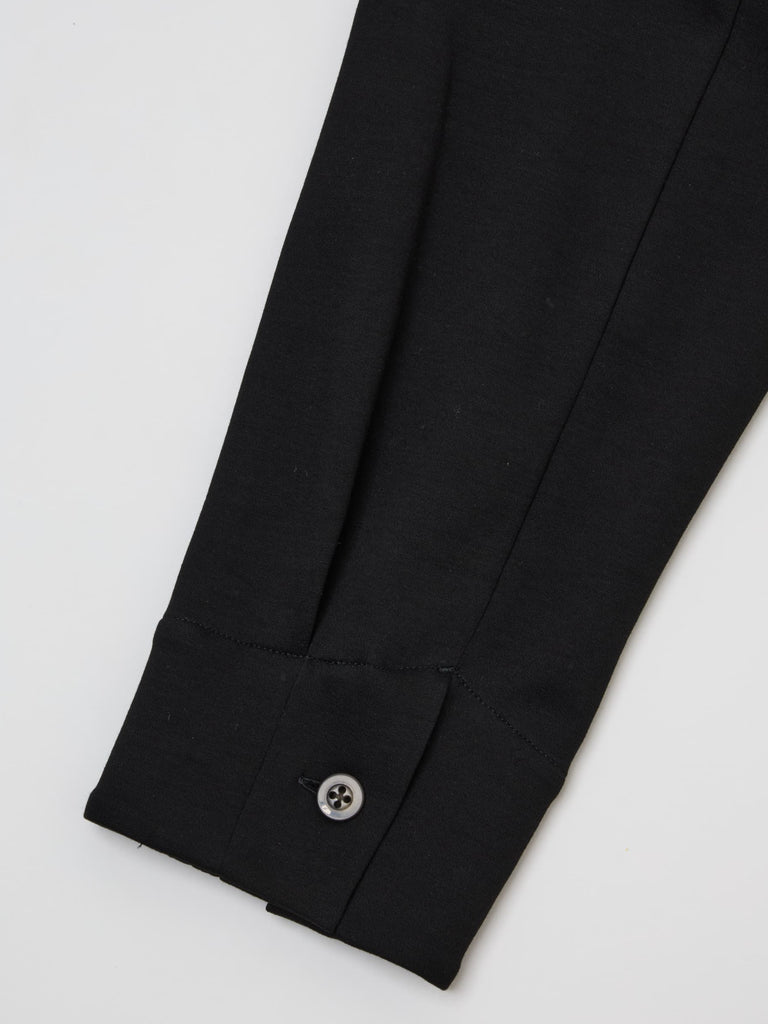 後衿ぐりに入れた人工皮革のコードと、袖の切り替えに入れたメロー始末がアクセントになっており、前後で衿の巾を変化させた繊細なデザイン設計、一見シンブルな見た目でありながら、他の物とは一線を画すこだわりの1着になっています。