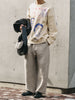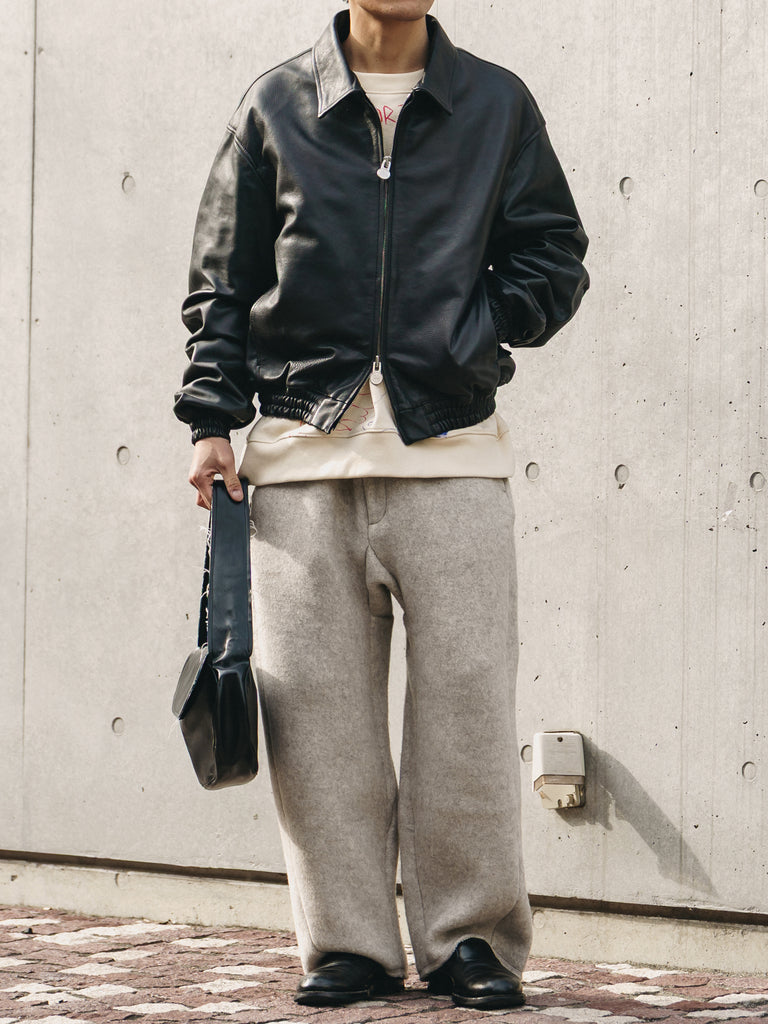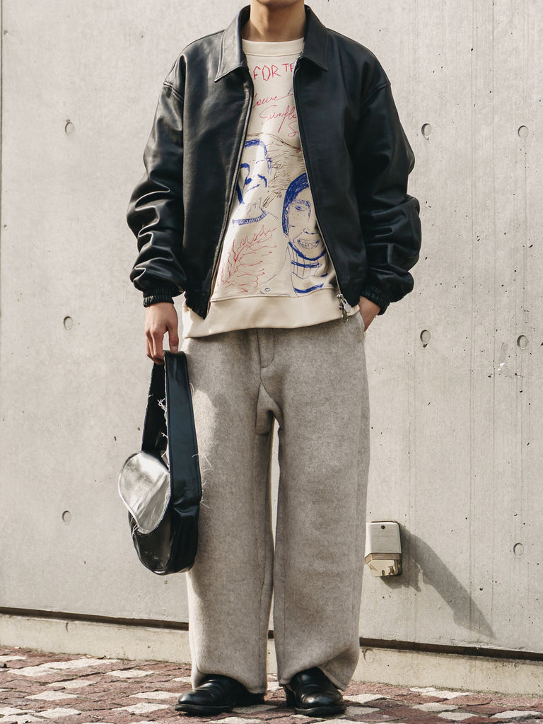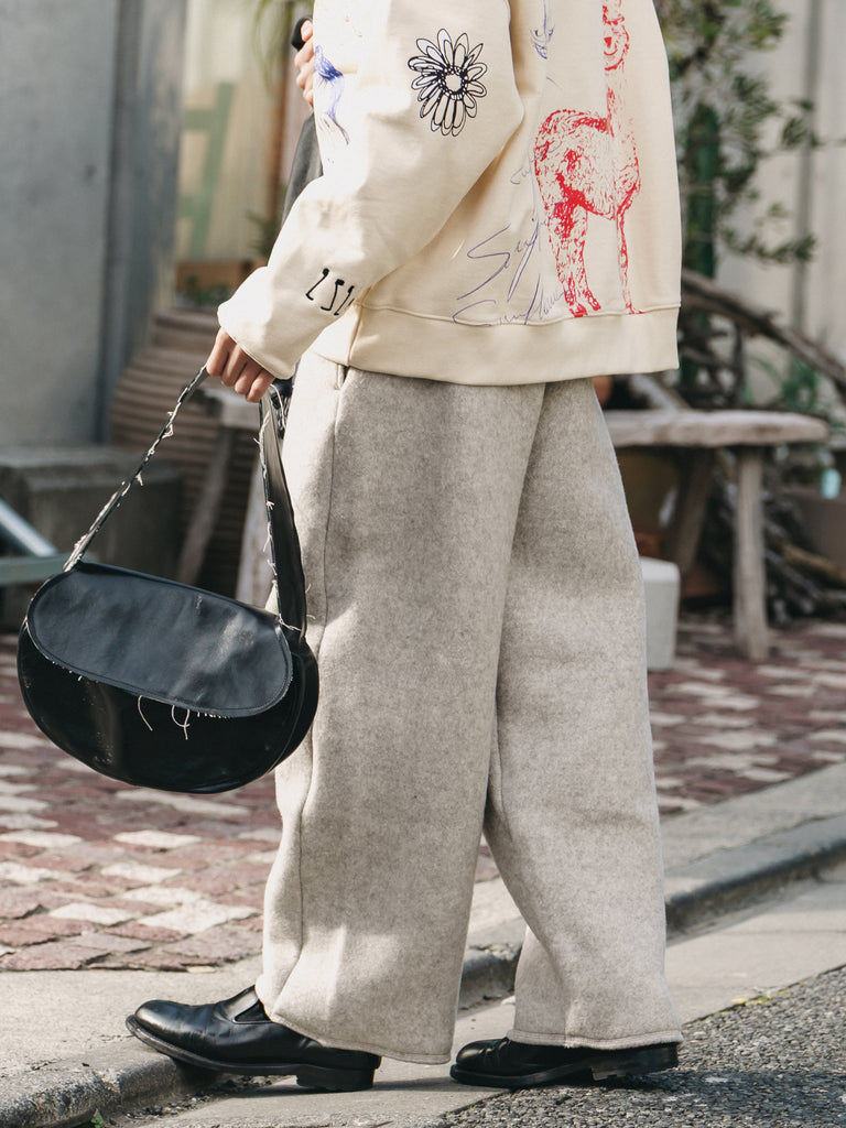 紡毛専門の紡績工場に別注し、ひいてもらった糸を使用し起毛加工を施して柔らかな風合いを持つリバース仕様の生地。