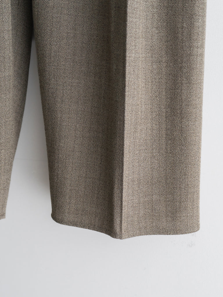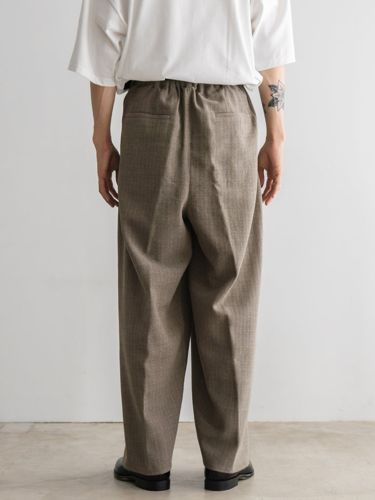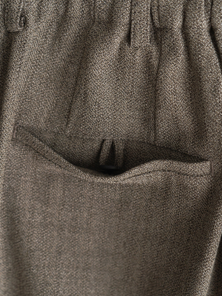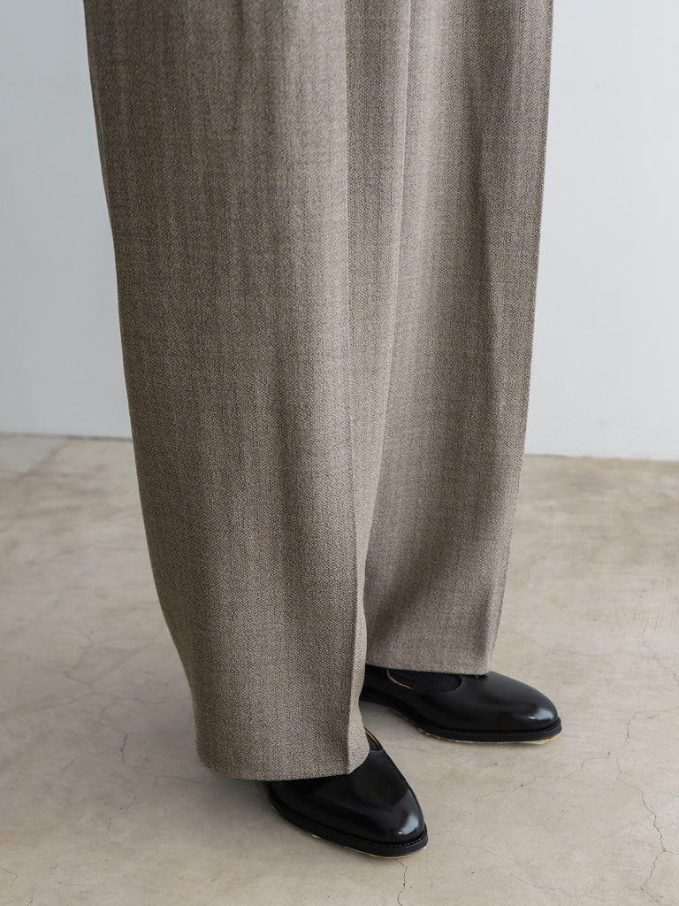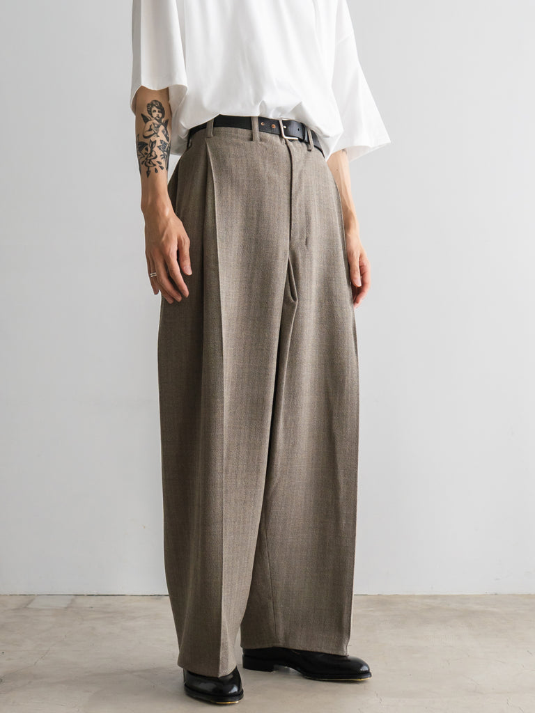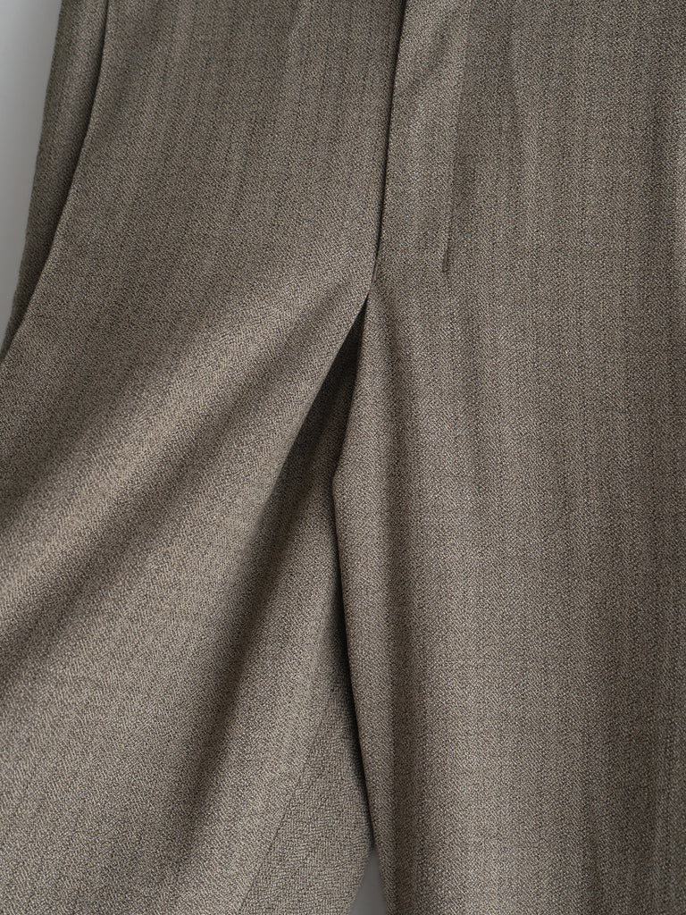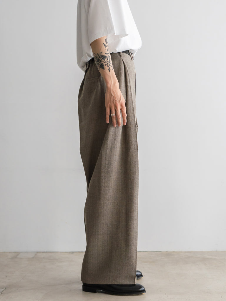 脇線に縫い目が無いのが特徴で、一枚の布をより立体的に見せるために、股下にわたりを大量に確保ができるボックスプリーツを採用しております。