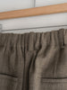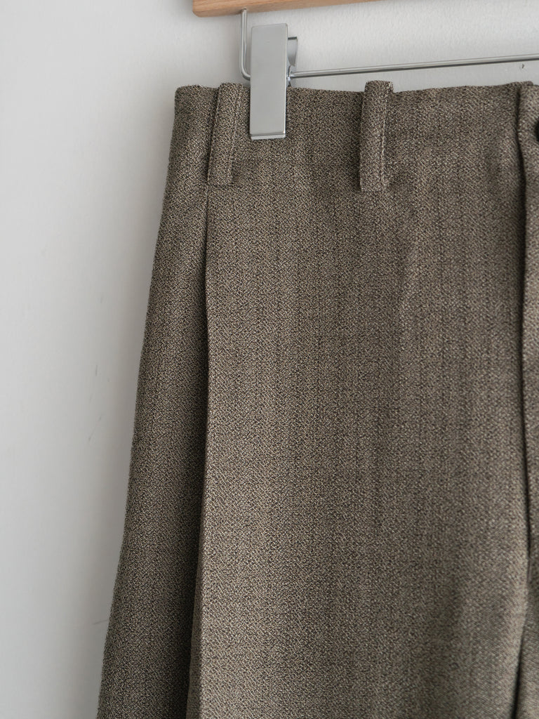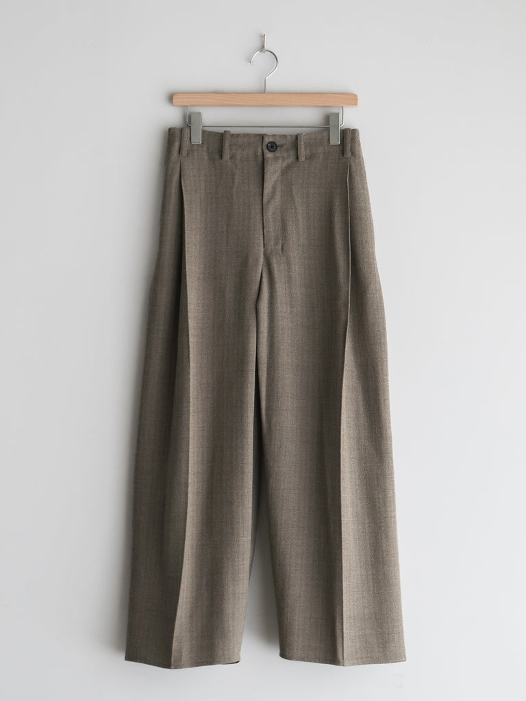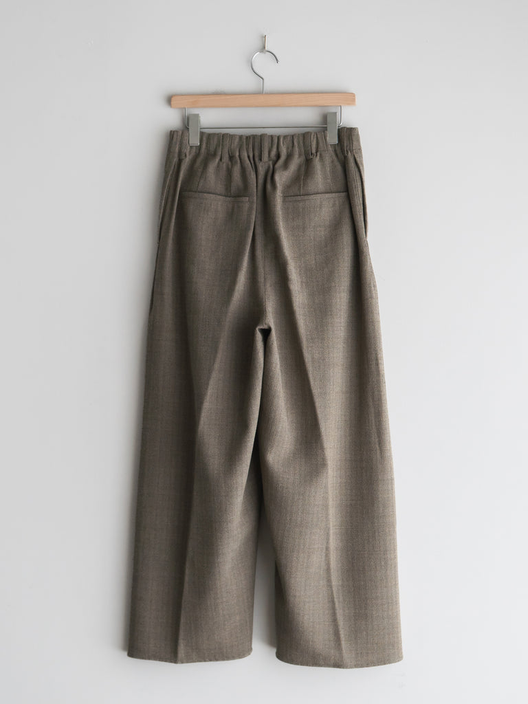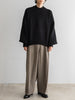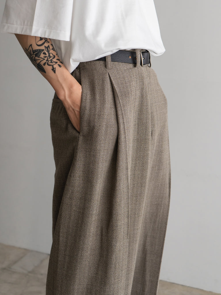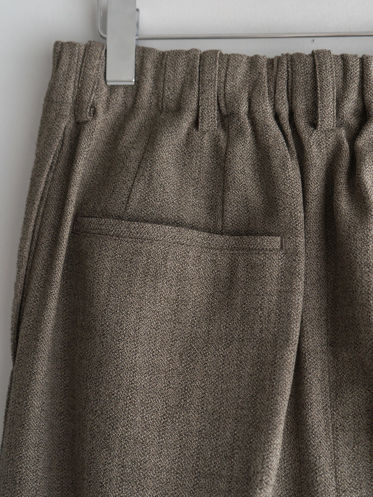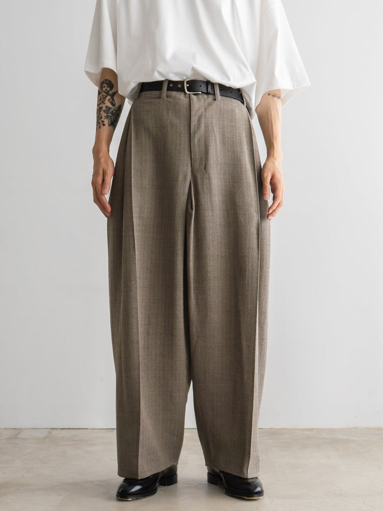 脇線に縫い目が無いのが特徴で、一枚の布をより立体的に見せるために、股下にわたりを大量に確保ができるボックスプリーツを採用しております。