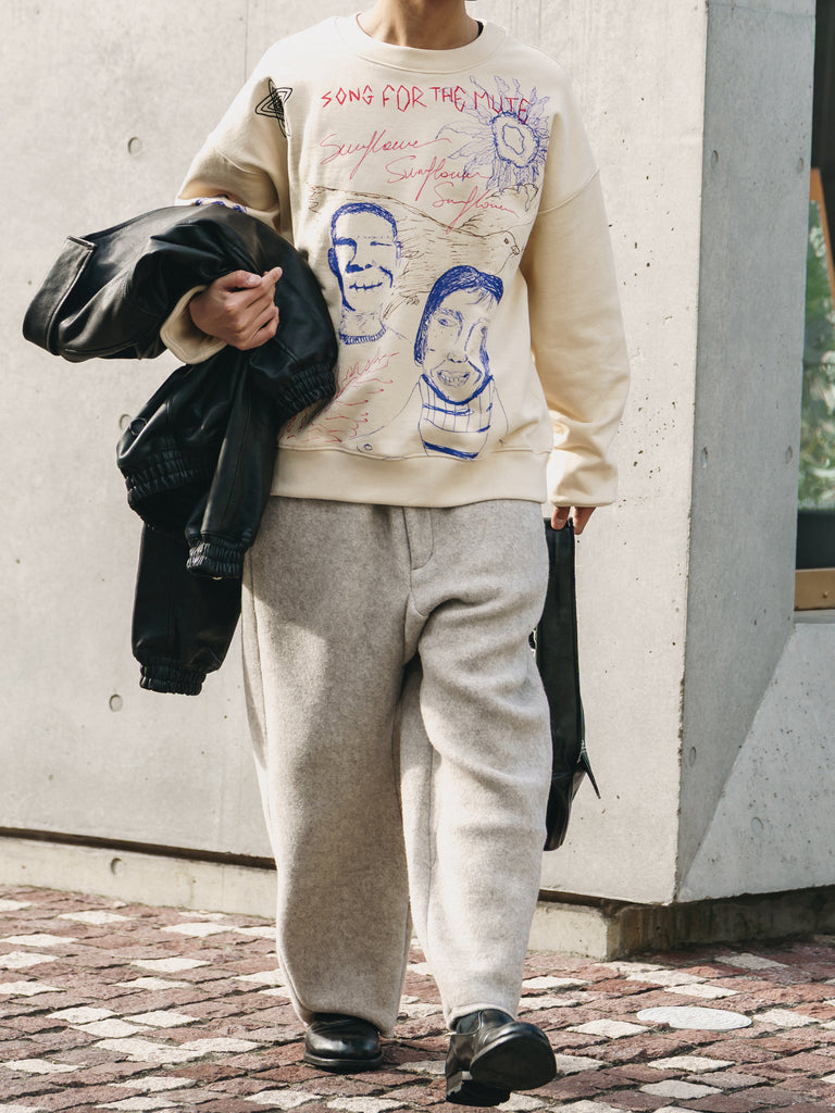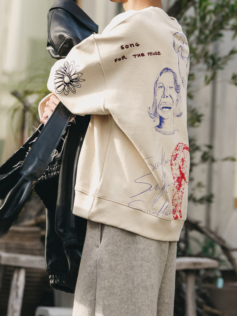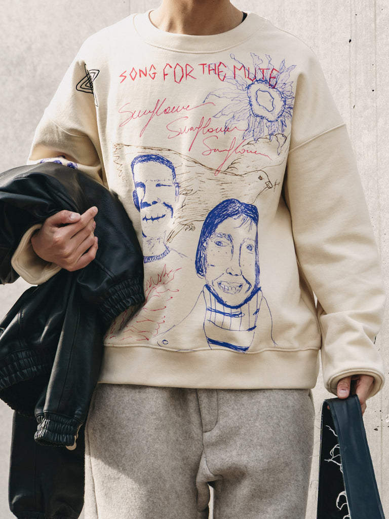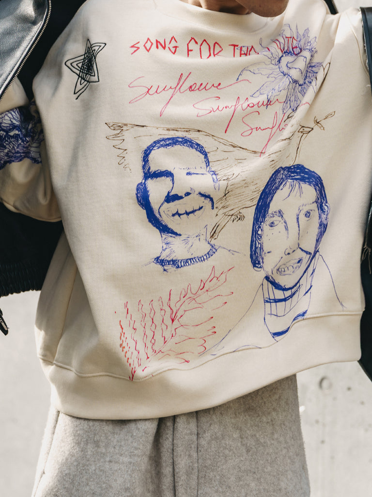 今シーズンのコレクション「25.2 'Sunflower'」で初登場した本プルオーバーは、デザインディレクターのスケッチブックから着想を得たオリジナルイラストを贅沢にコラージュした一着。