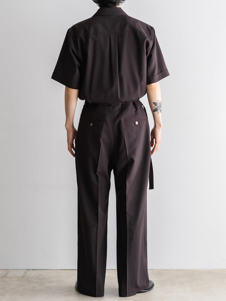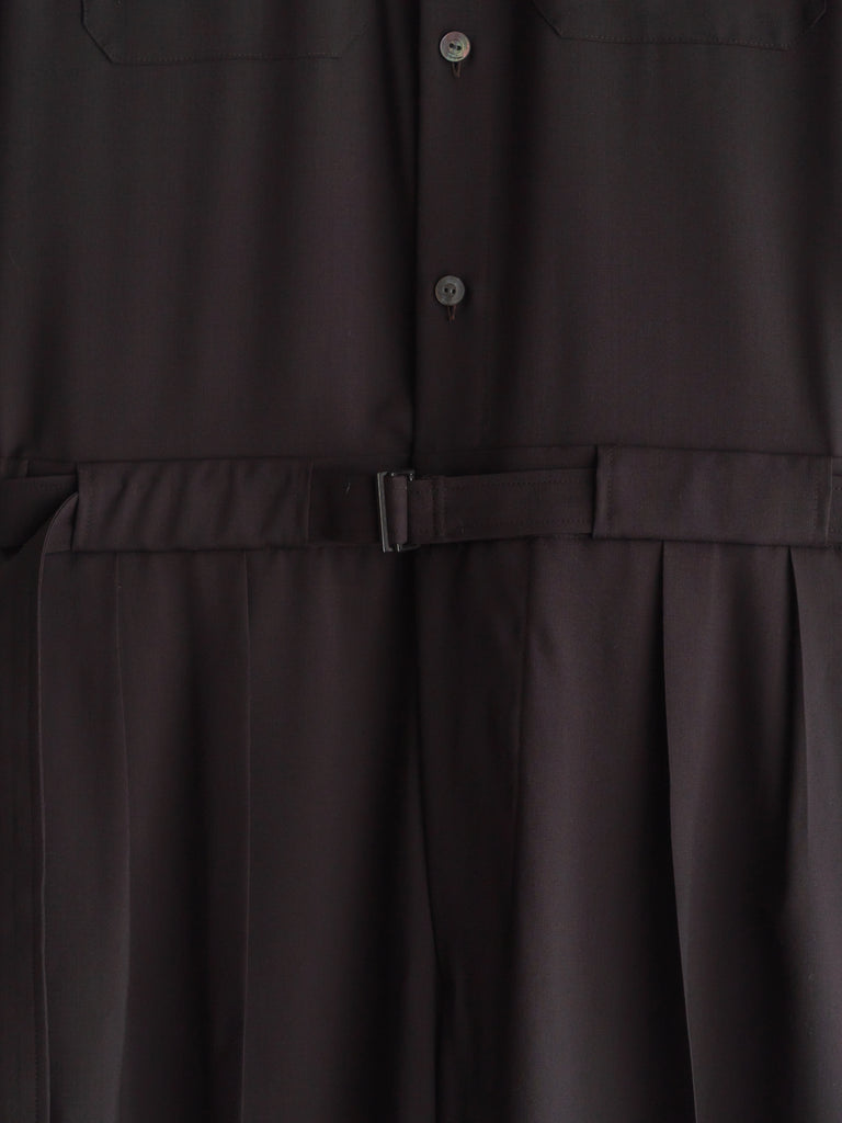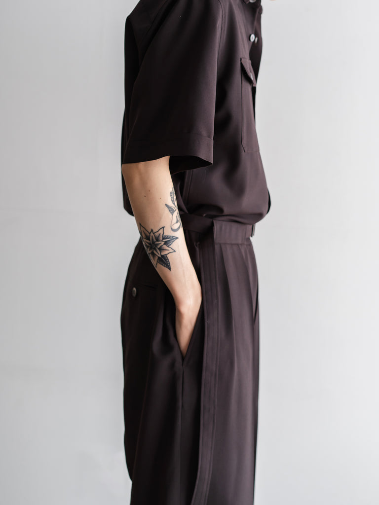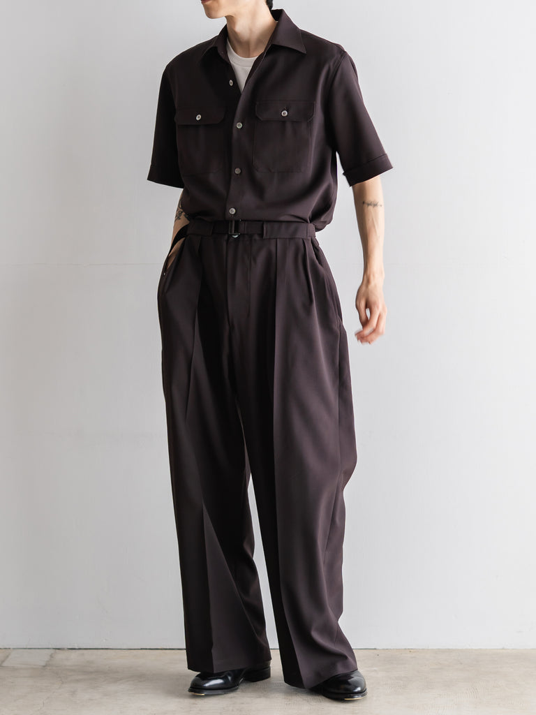 胸にフラップポケットのついたリラックした半袖シャツに、ワイドストレートのパンツシルエットが一体になったアイテムです。