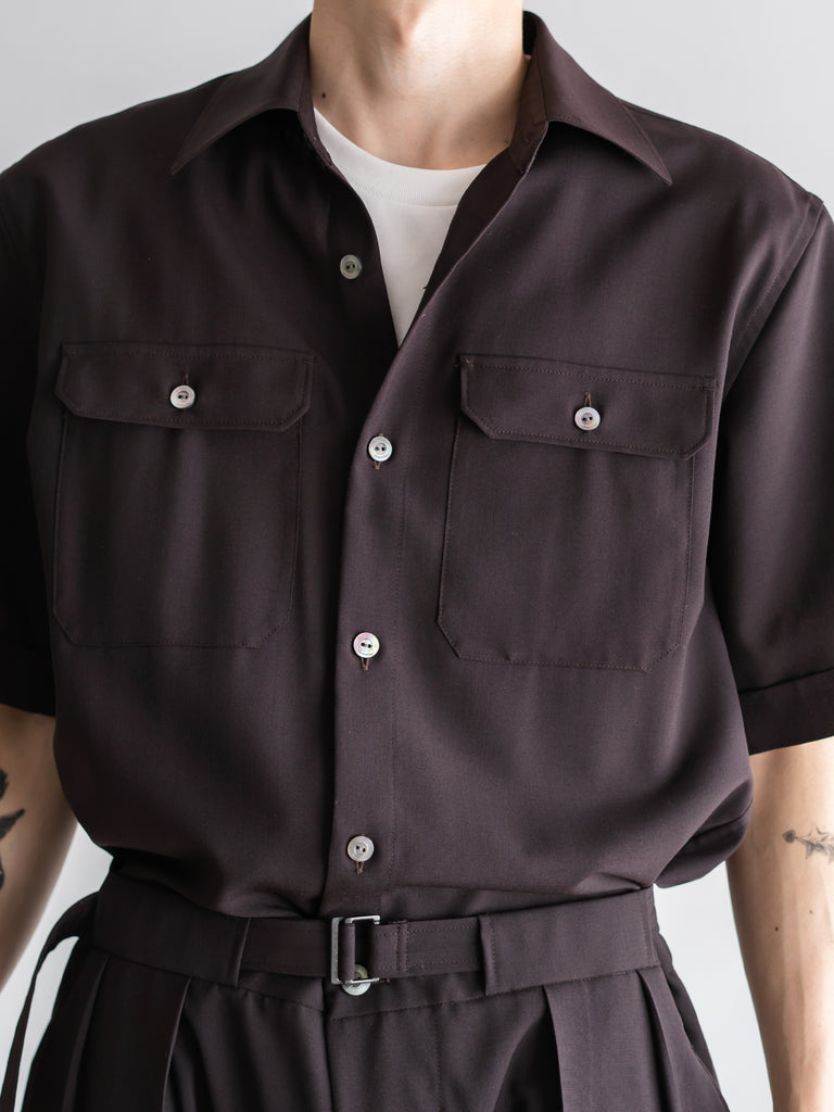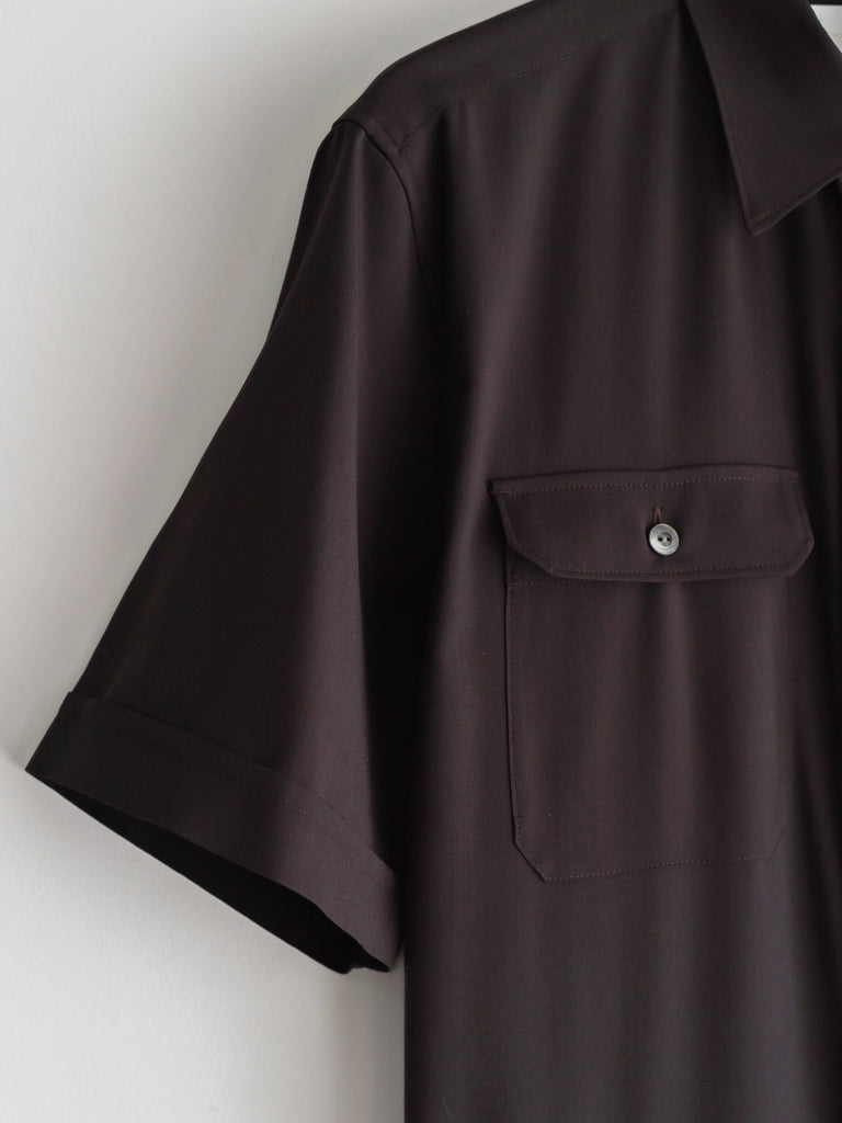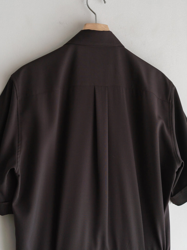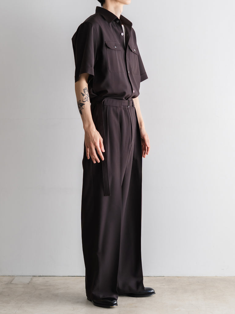 胸にフラップポケットのついたリラックした半袖シャツに、ワイドストレートのパンツシルエットが一体になったアイテムです。
