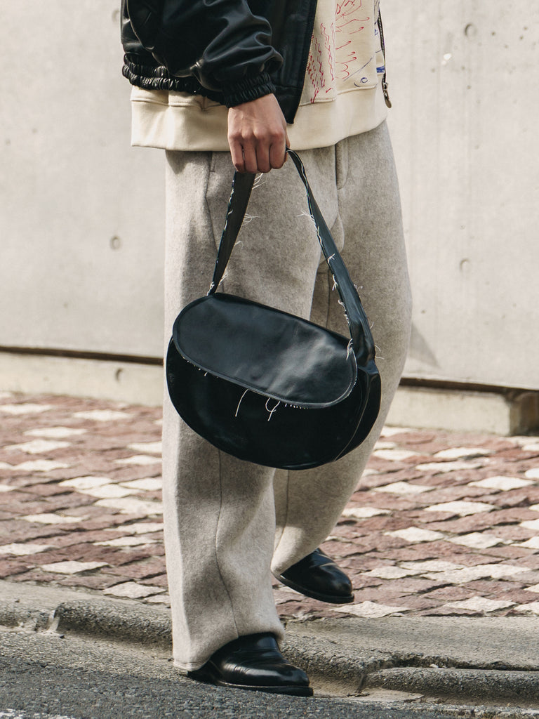 ブラックのカウレザーを使用したオーバル型ハンドバッグ。