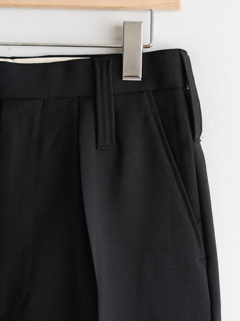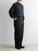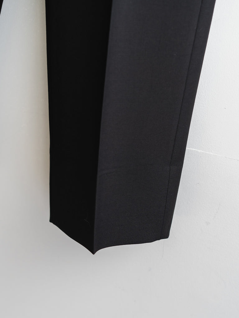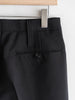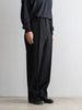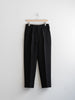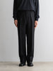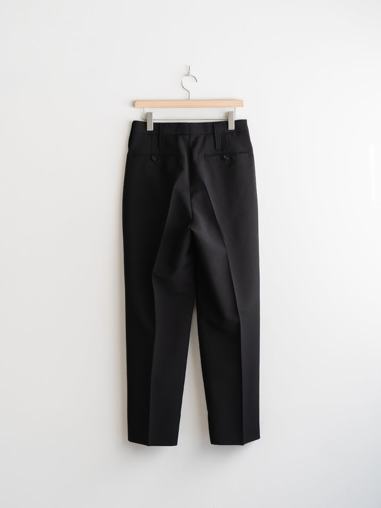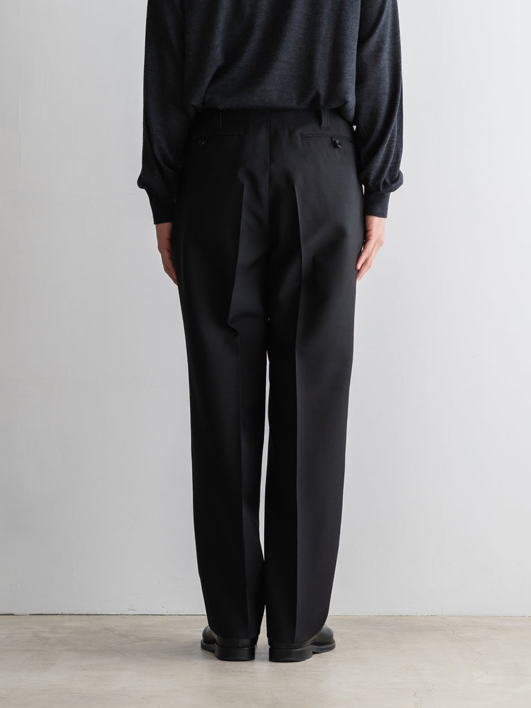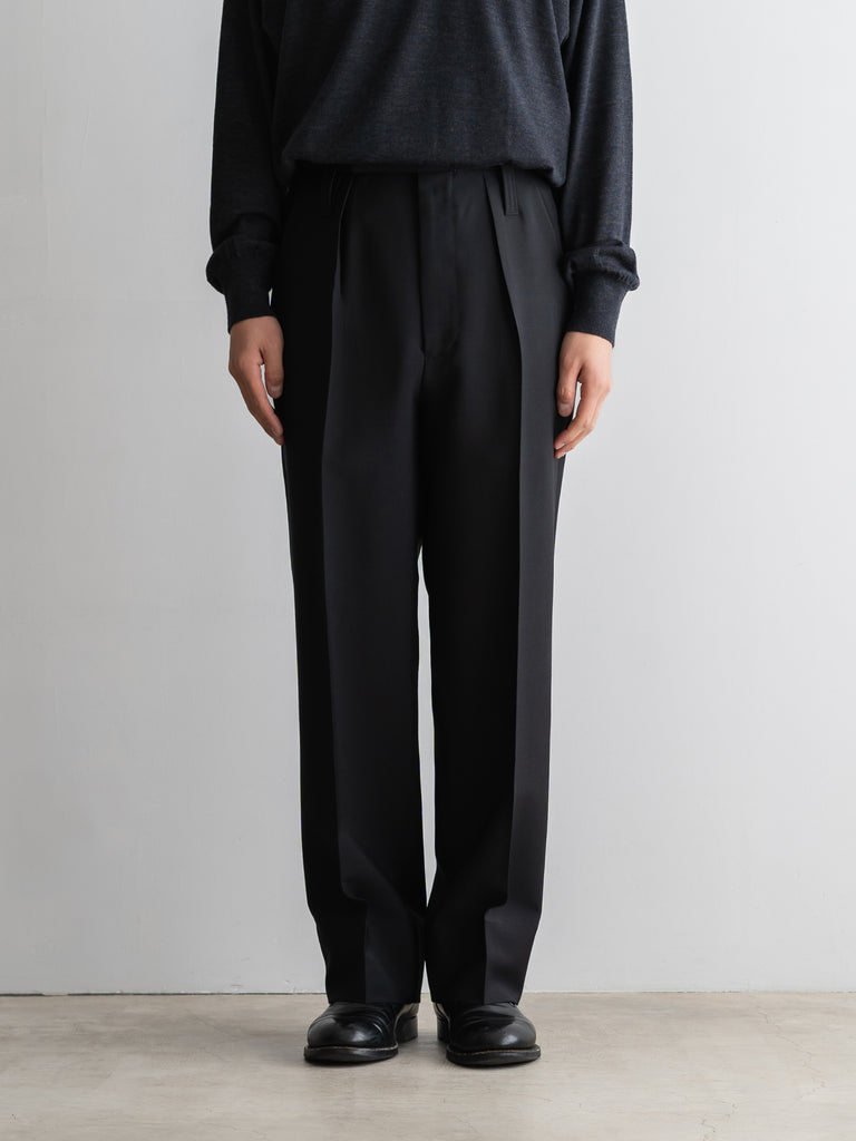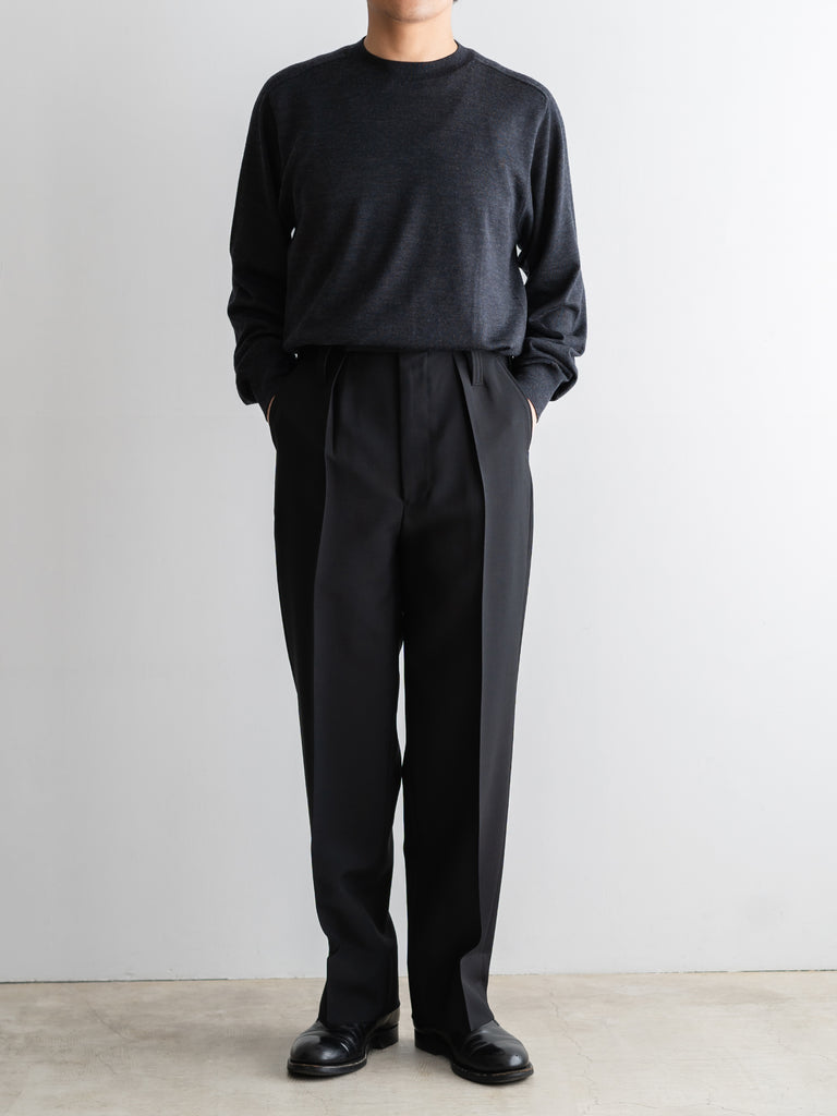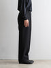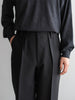50年代フランス軍の名作トラウザーズのパターンにならい、股上とわたり、ヒップまわりのボリュームを少しだけ⼤きめにとり、すそにかけてゆるやかにテーパードする1タックスラックス。