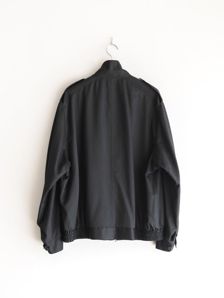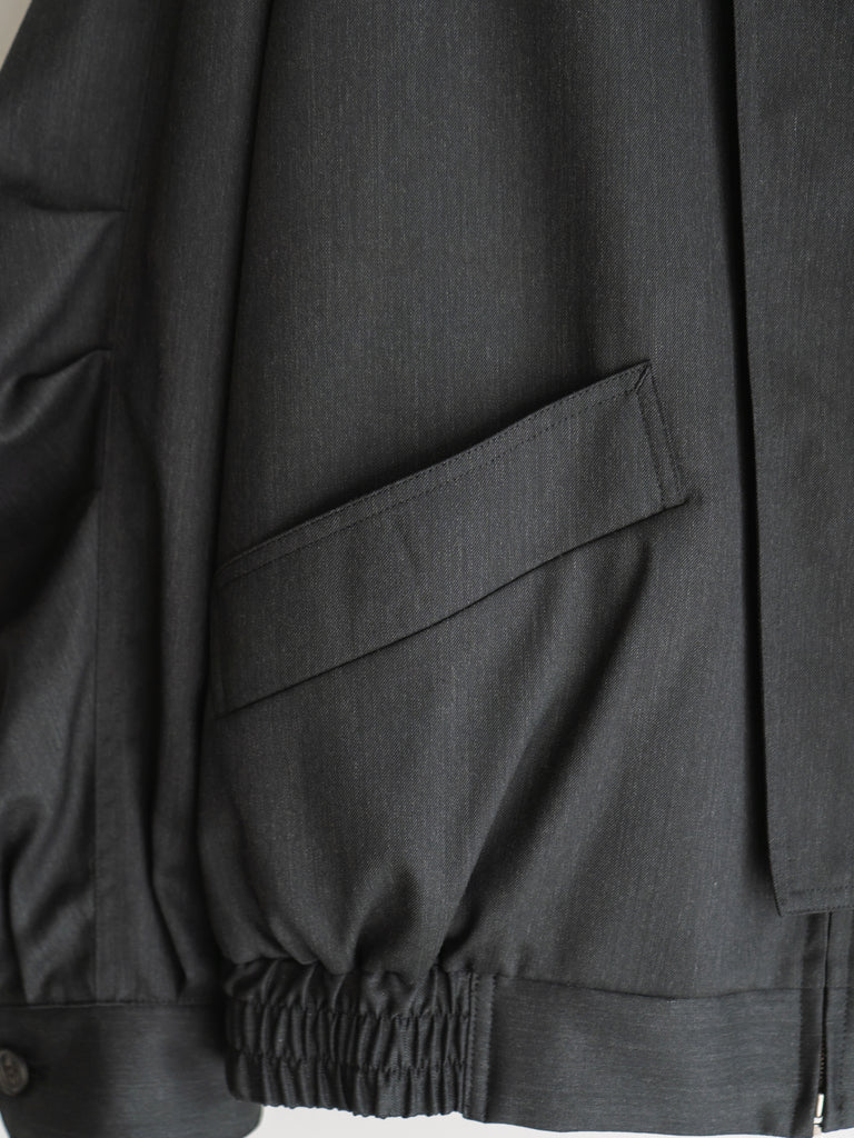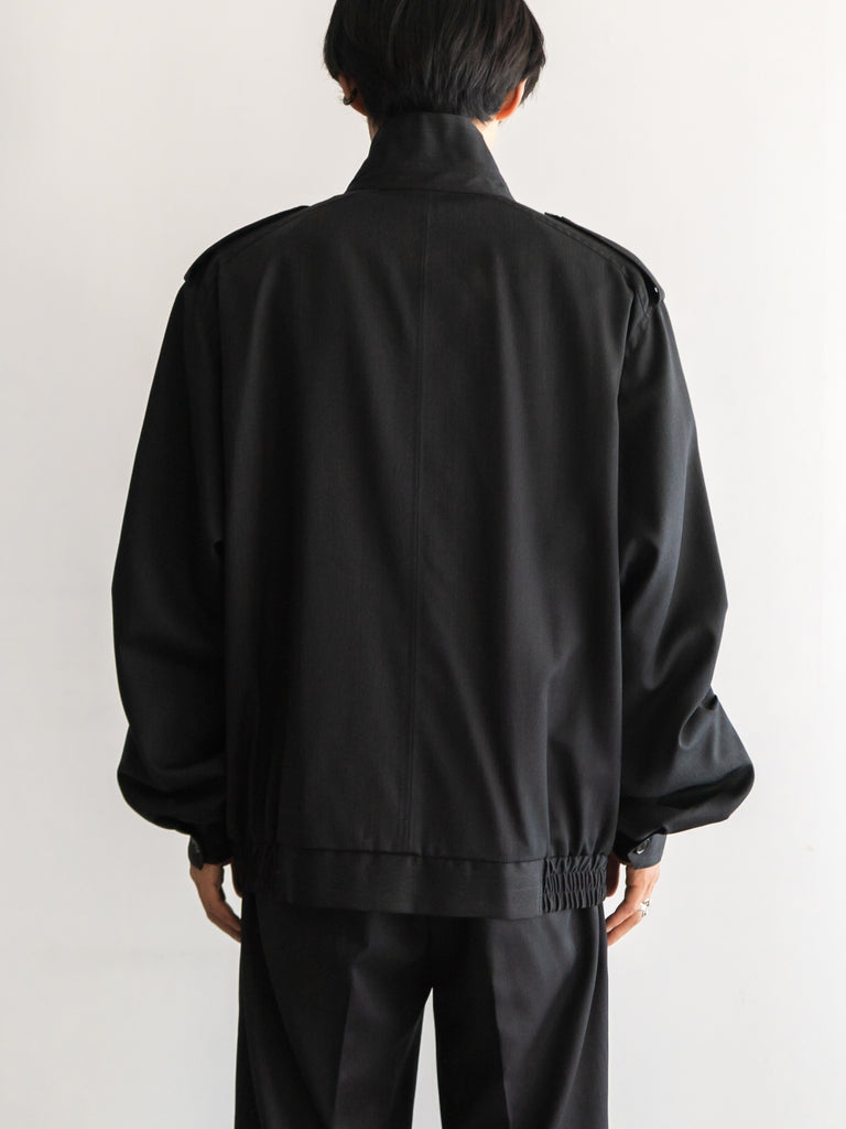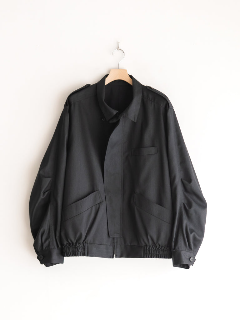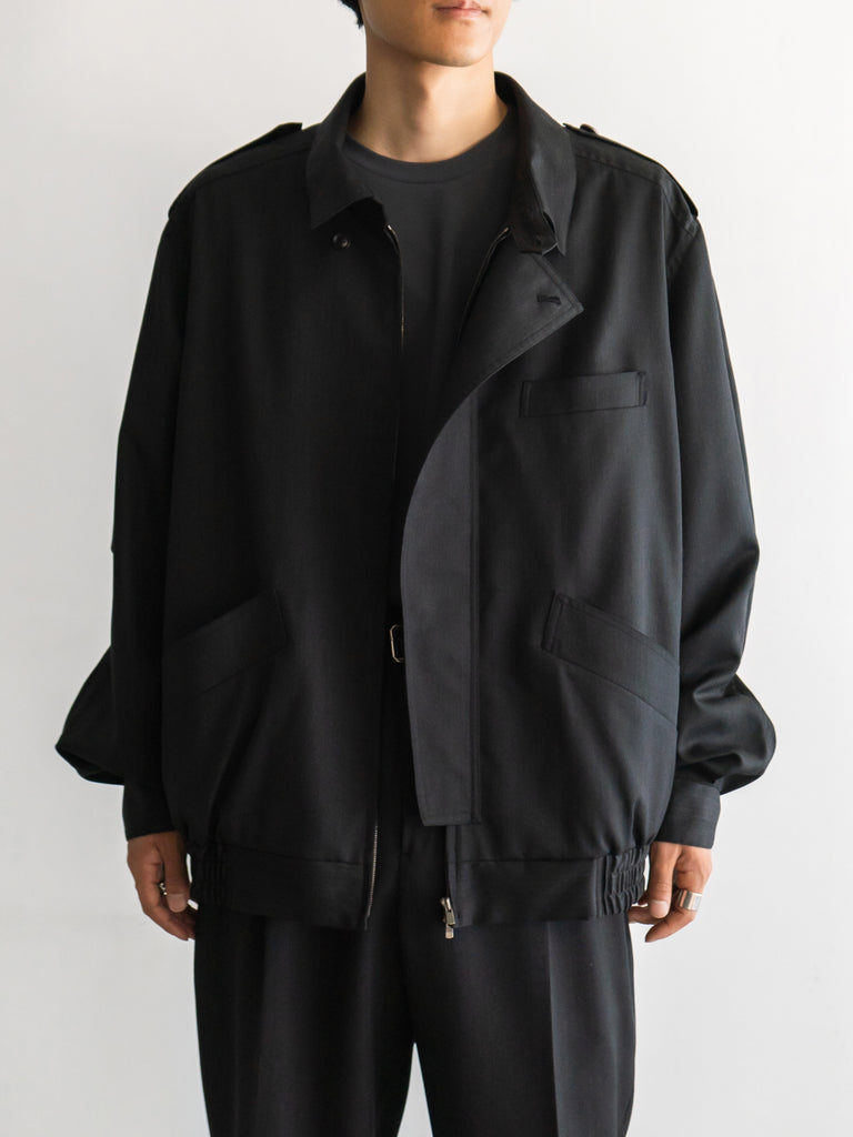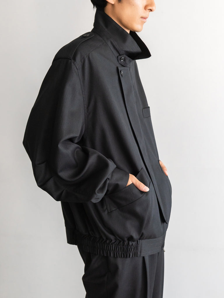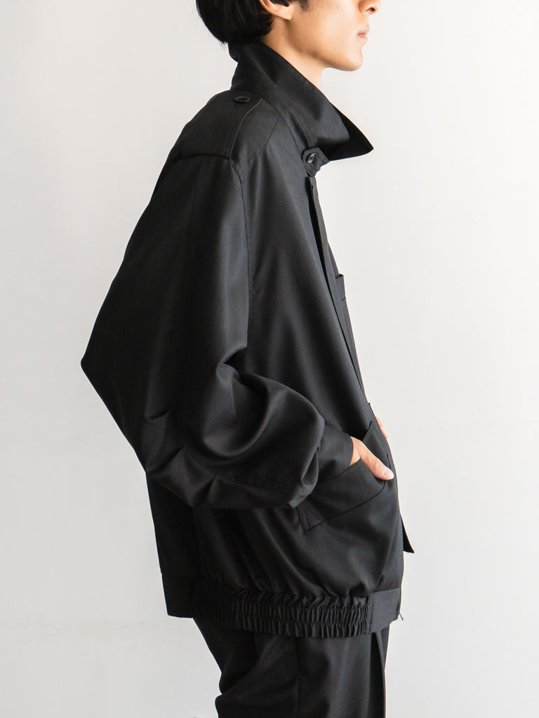 薄手のウールギャバジン素材を使用した、 総裏仕立ての肩章付きジップブルゾン。
