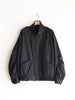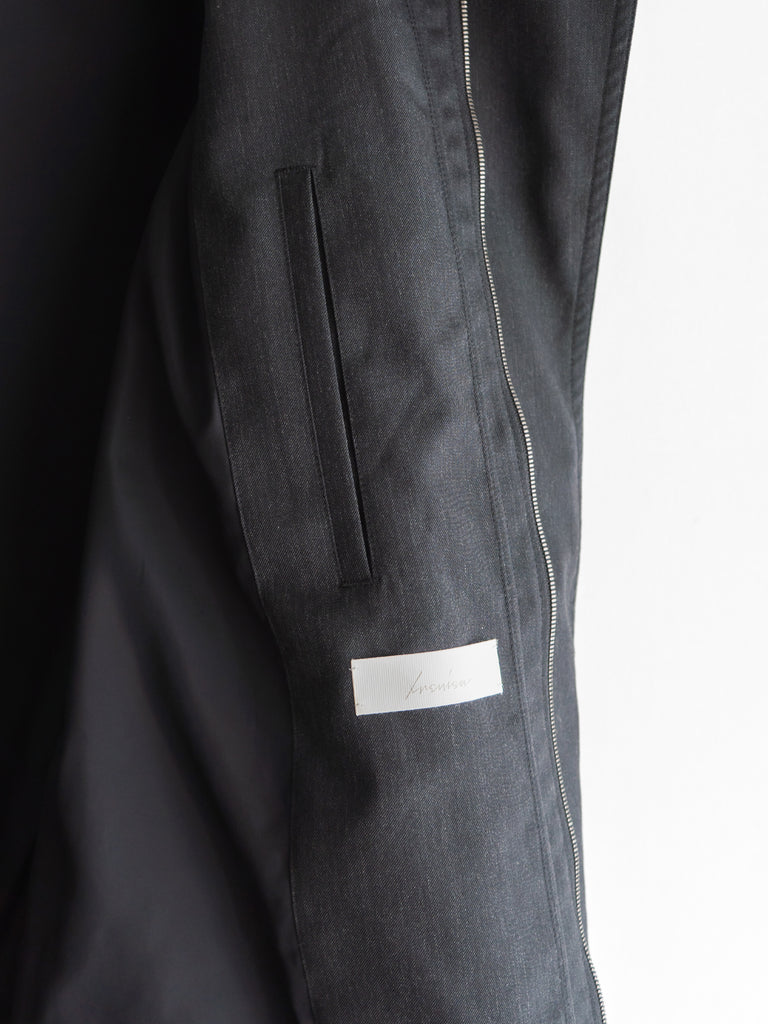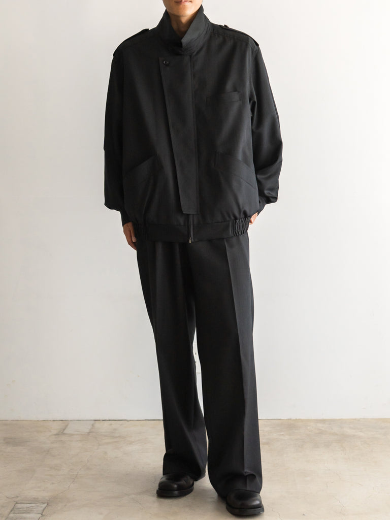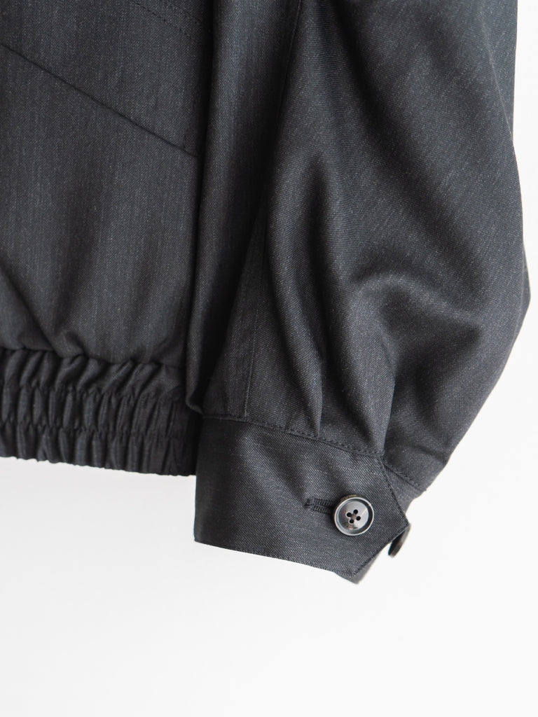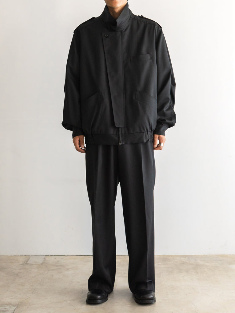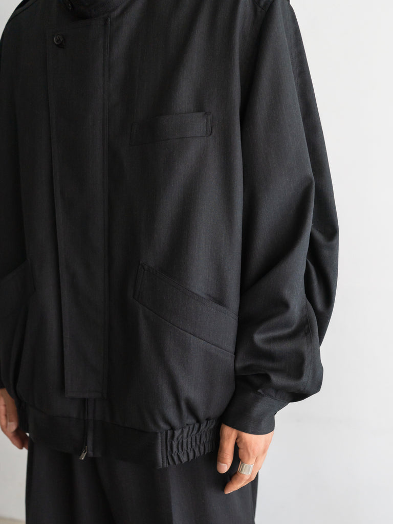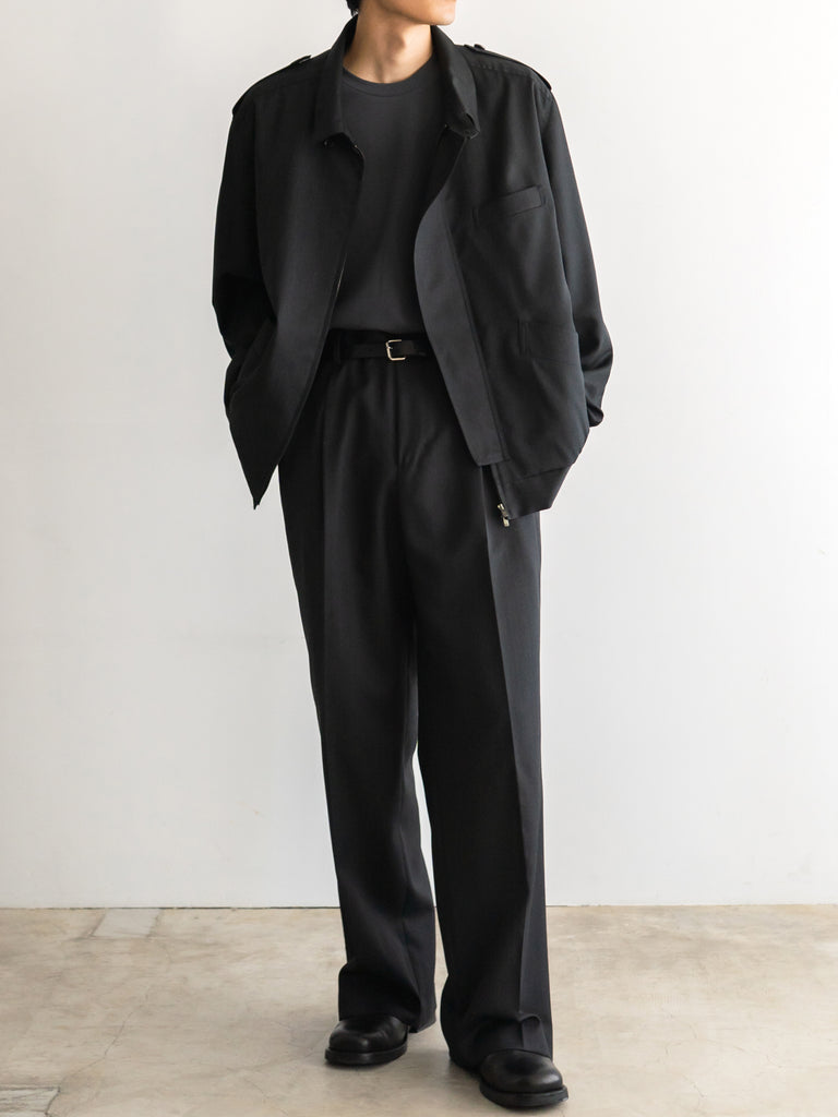薄手のウールギャバジン素材を使用した、 総裏仕立ての肩章付きジップブルゾン。