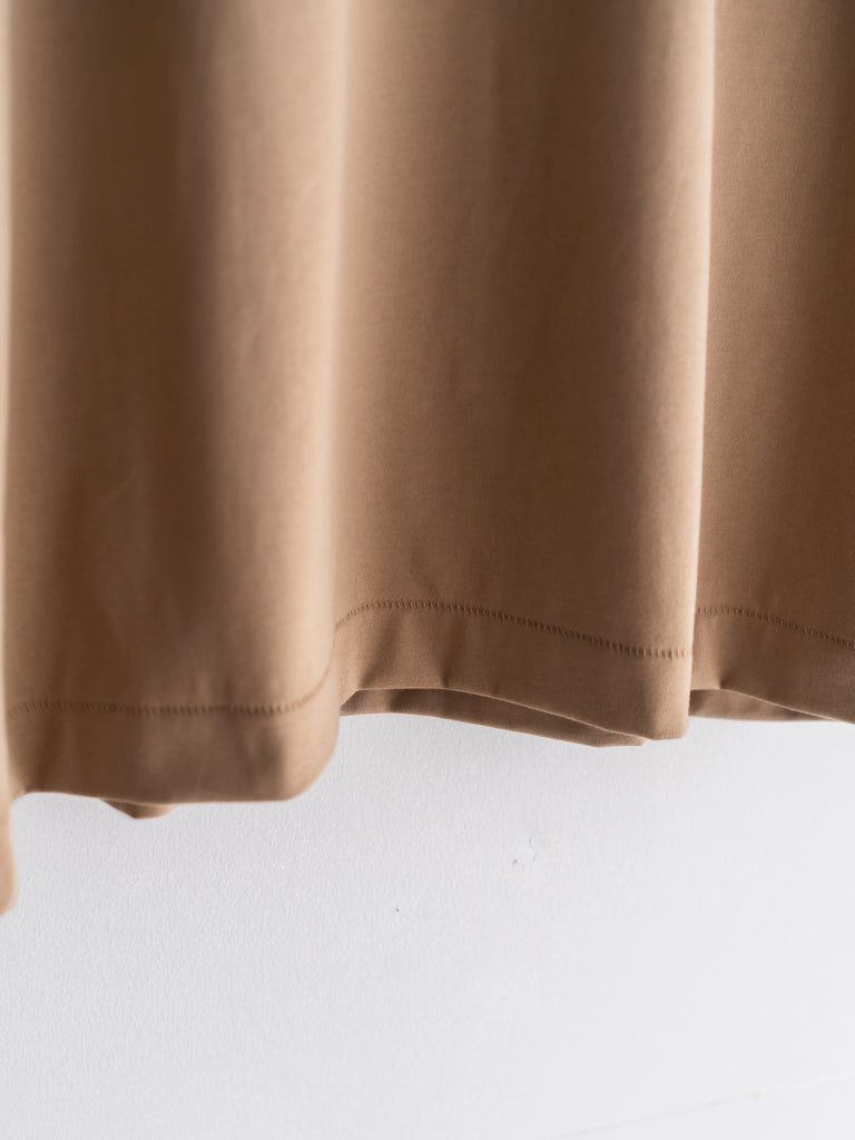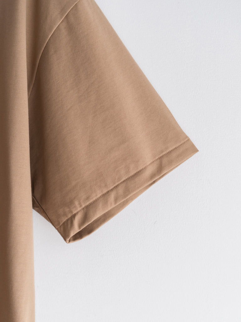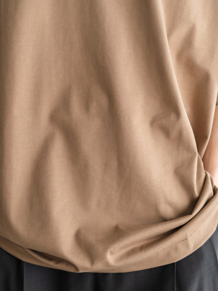 インドで手摘みされたSUVIN COTTONを、和歌山市のニッターの手で編まれており、双糸にすることで、光沢感としなやかさを備えたATONオリジナルのジャージー素材です。SUVIN COTTONは綿花を丁寧に手摘みしている為、油分が失われること無く、繊維に傷が付いていない為、薬剤など化学的な加工を一切せずに美しい光沢があります。
